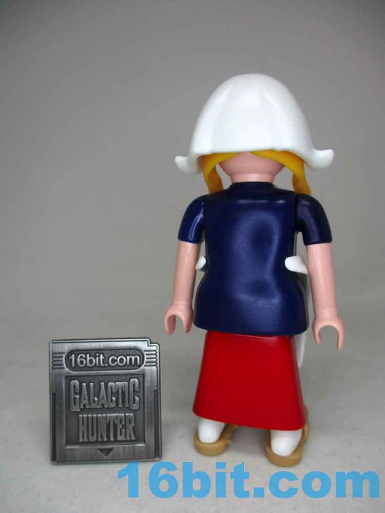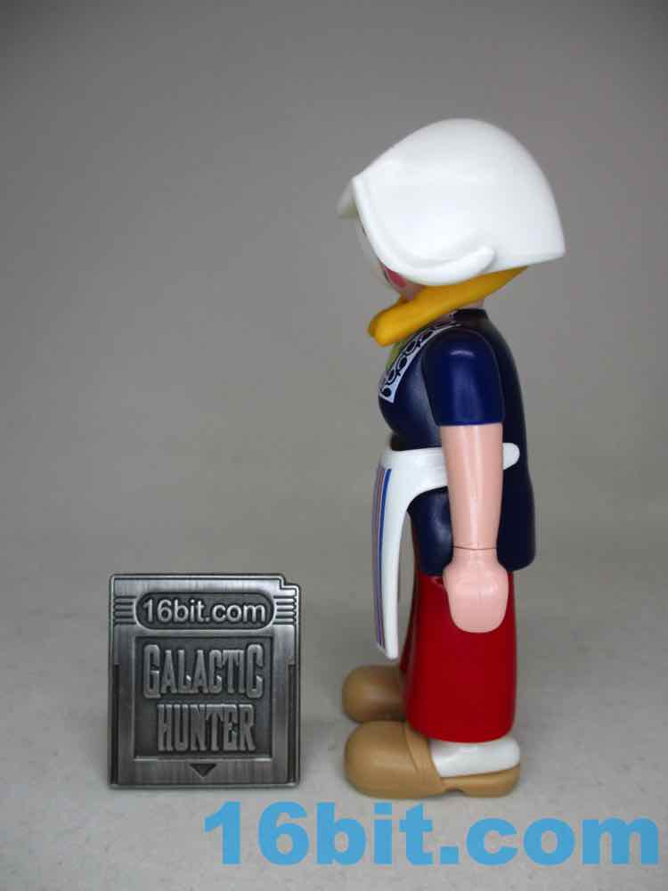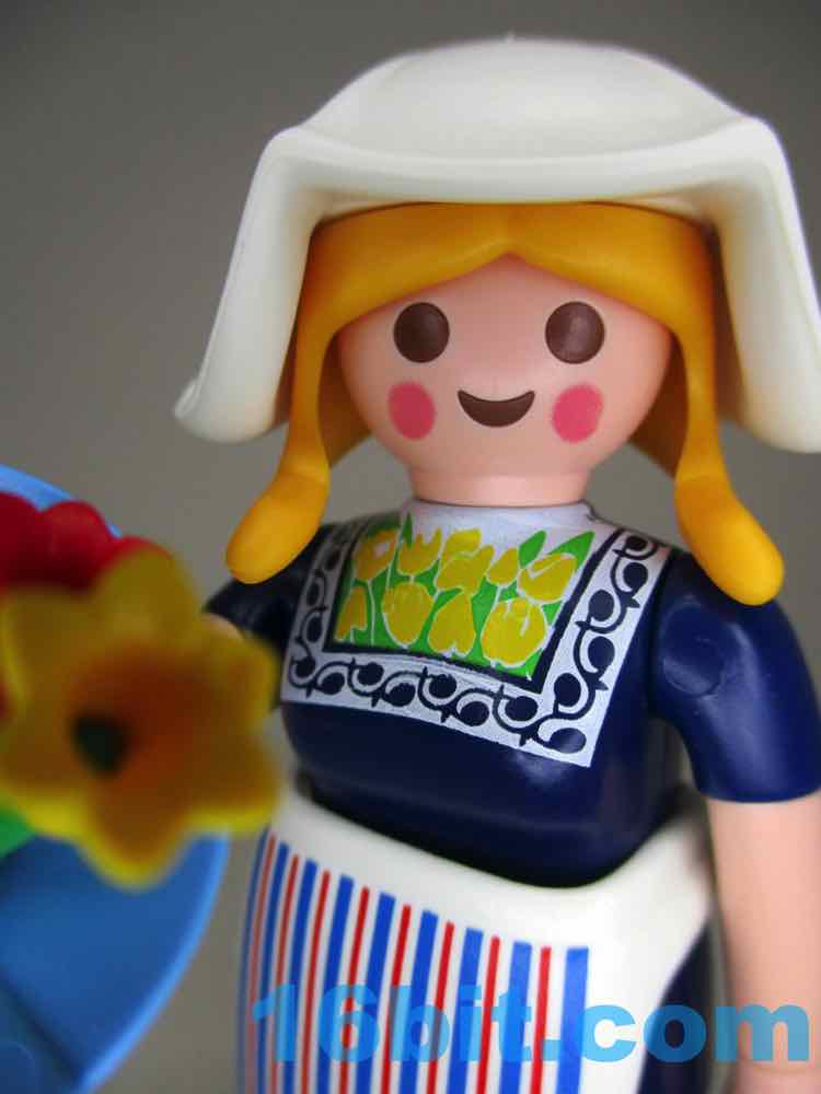 Her head is similar to countless other figures, with added bright pink cheeks. The yellow pigtails are nothing too new, and the hat is familiar - as is the apron, but not the deco. The red and blue stripes are printed cleanly and look great, as is the collar printed on her chest. I was particularly delighted by the wooden shoes, which are parts that date back to the first decade of the brand. (It's about to enter the sixth.) For those unfamiliar with cultural stereotypes about the Dutch, wooden shoes were a big one back in the day as were tulips - the OG Beanie Babies metaphor. It's a grab bag of mostly outdated notions about how a country dresses, but there's something charming and dumb about that and I wish we could see it reflected more on the United States. If Playmobil made a cowboy eating a hamburger wearing a t-shirt of a random sports team ad Air Jordans, I would get a tremendous kick out of this - but I don't know how Holland takes this sort of thing. Is it kitsch? Is it annoying? I don't have any Dutch friends to ask, so I'll just assume it's a quirky throwback and enjoy having it on the shelf.