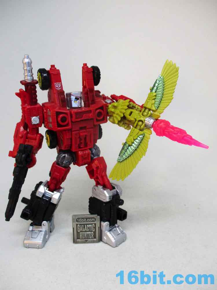 The blaster mode involves rotating the wings and adjusting the position of the body - it's pretty easy, and you get a wide, winged blaster. If this line had any longevity in it, you'd probably get a number of recolors of this toy and love them all. As it is, it's a nifty accessory that looks sort of like a longbow if you squint just right. It certainly makes a better or at least more convincing weapon accessory than Arrowstripe, but for the price, it should. My other toys had no problems holding it.