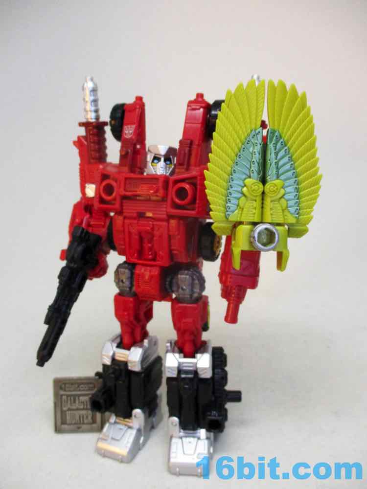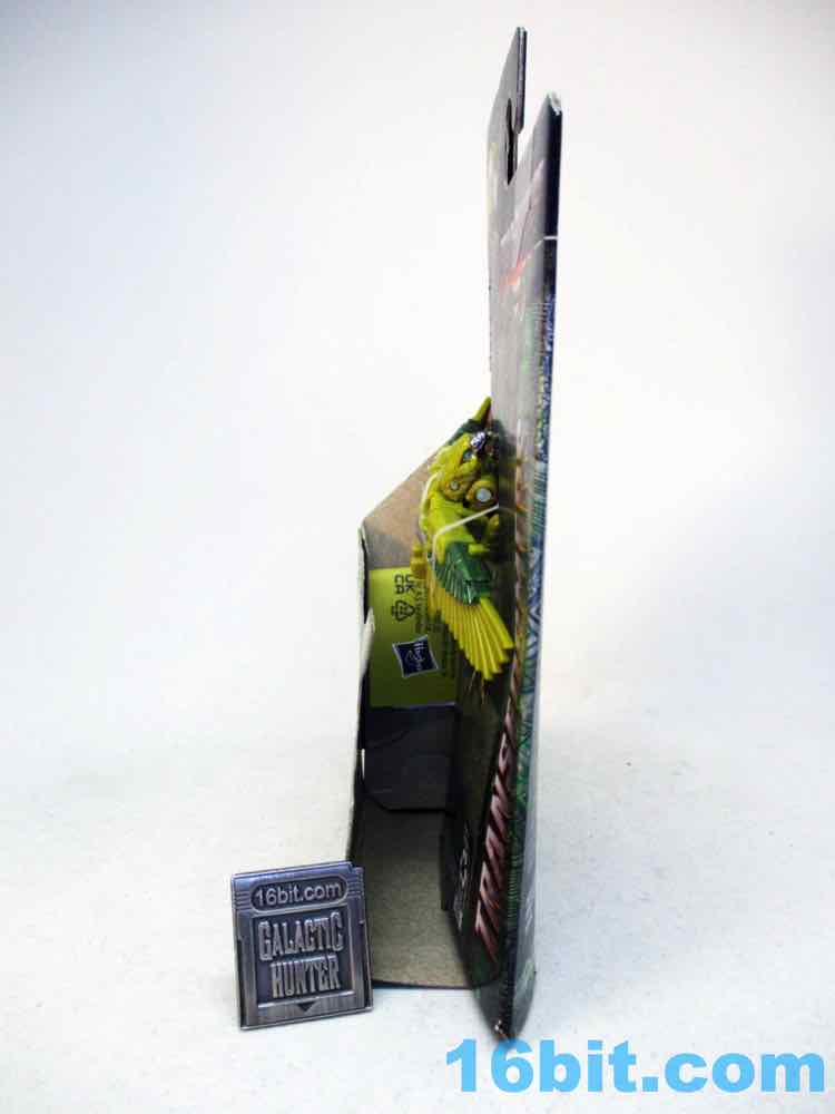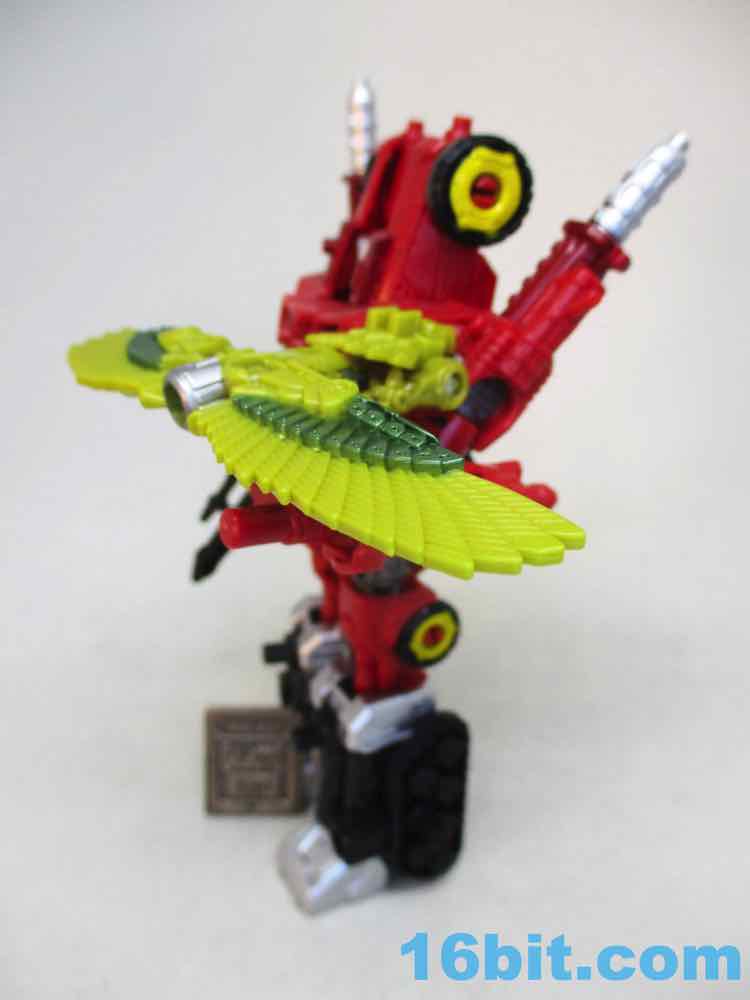 Packaged in bird mode, it's like getting a Silverhawks avian companion. She has sculpted robo-feathers, a silver beak, painted blue eyes, and some metallic green highlights. There's not a ton going on here, and without paint you'd probably feel ripped off if she cost more than $3 or $4. With paint, it might be a stretch but she has articulated legs, posable wings, and a 5mm peg under her chin so she can perch on other figures' arms. For a figure of this size, there's not much more you can expect her to do. She gets the job done with an impressive amount of sculpted detail on all of the feathers that would probably make the strongest case yet for doing digital sculpting. Doing this by hand would probably be a crampiinducing nightmare, but doing it once and mirror-flipping it to get you both wings? That's reasonable.