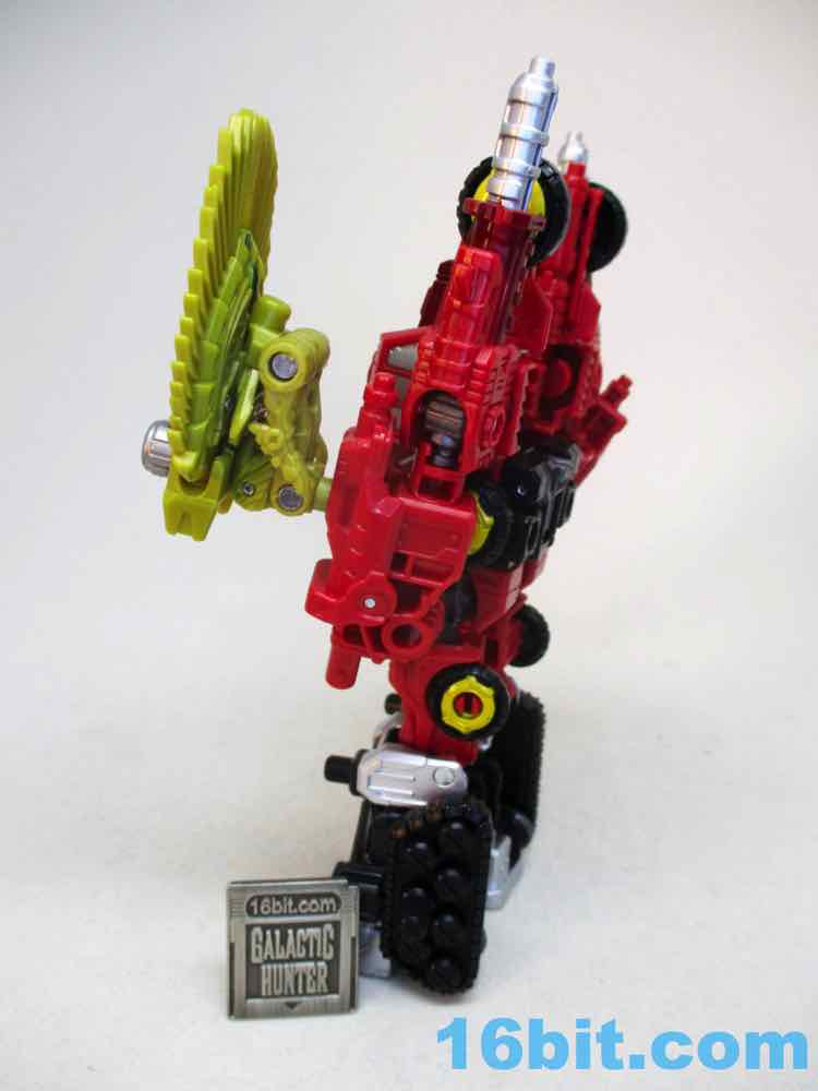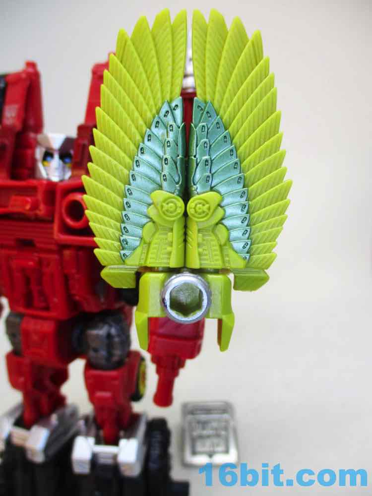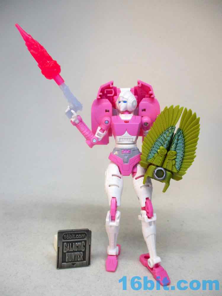 Transforming the figure is pretty easy, but you might want to look at the instructions to get to the shieldy and blastery modes. The first mode they show is a shield with a blaster at the bottom - sort of a feathery riot shield. The green highlights really shine here, and you can pop blast effects in that 5mm hole. It's kind of amazing and a weird toy if you think about it - the kid line doesn't include any such blast effects, so the only buyers likely to get anything out of that particular design are collectors who have other toys from recent years. Thanks to the 5mm handle, pretty much any toy you've bought recently from Transformers is likely to be able to use this as an accessory. It holds together quite nicely.