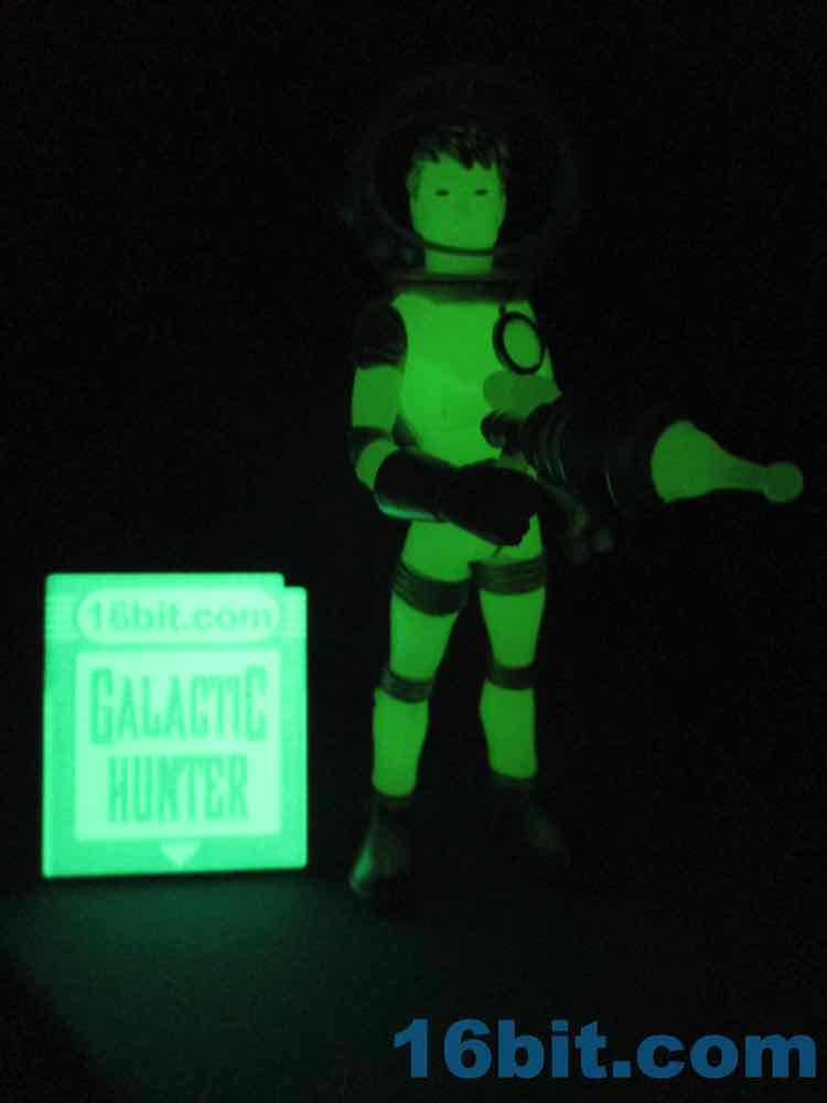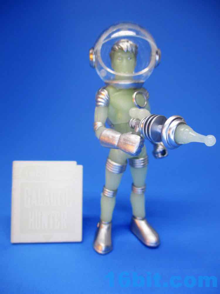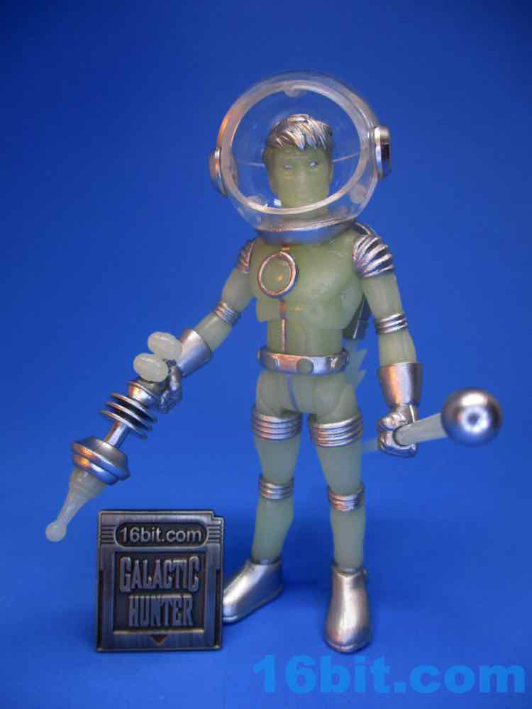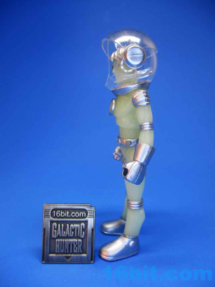 If you've been reading this site, you know the score. He matches Cosmic Radiation Terra Firma [FOTD #2,599] and the rest of their glowing cohorts, although his layouts matches hers particularly well. He's also nearly identical to Cosmic Radiation Zero Gravity [FOTD $2,130] except for the head, the helmet, and the paint layout on the blaster. There's a silver stripe down the suit, silver gloves, silver boots, silver "accordion joints," and the like. He's a roughly 3 3/4-inch scale figure that pops apart at each joint, allowing you to swap in "straight arms" or "bent arms," or other Glyos-compatible parts and limbs.