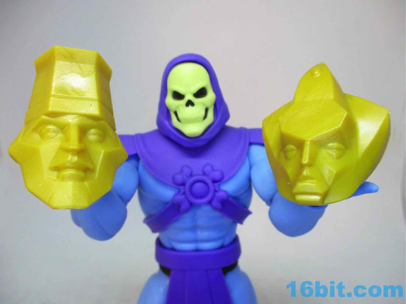 Each mask looks great, molded in a muted gold color with a neck hole under each so you can put them on a figure's neck peg if you like. This will probably inspire fans to make custom victims for the masks, if they weren't already doing that. Skeletor's staff is more or less what you'd expect, but they didn't bother to paint black shadows in the eyes. I think it would have been a good idea. Skeletor's sword is just a recolor of He-Man's sword, and not the bone hilt we would sometimes see on the show. Mattel and Super7 made the bone sword previously, but it's worth noting the cartoon edition from 2019 came with a similar staff and a similar sword.