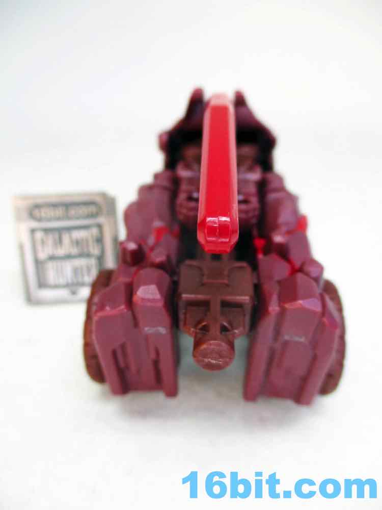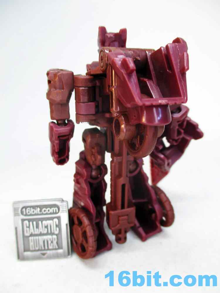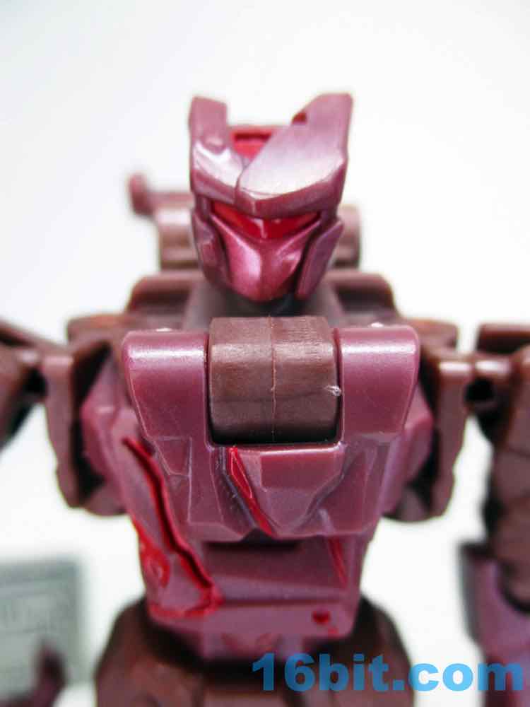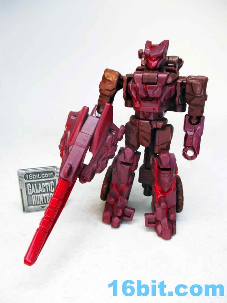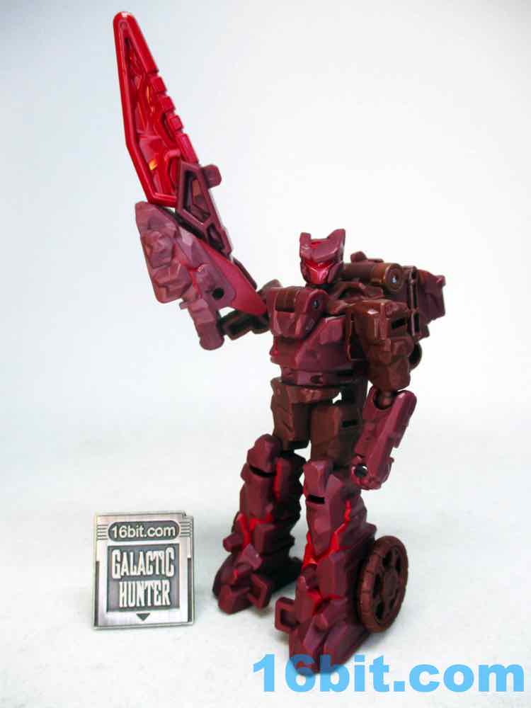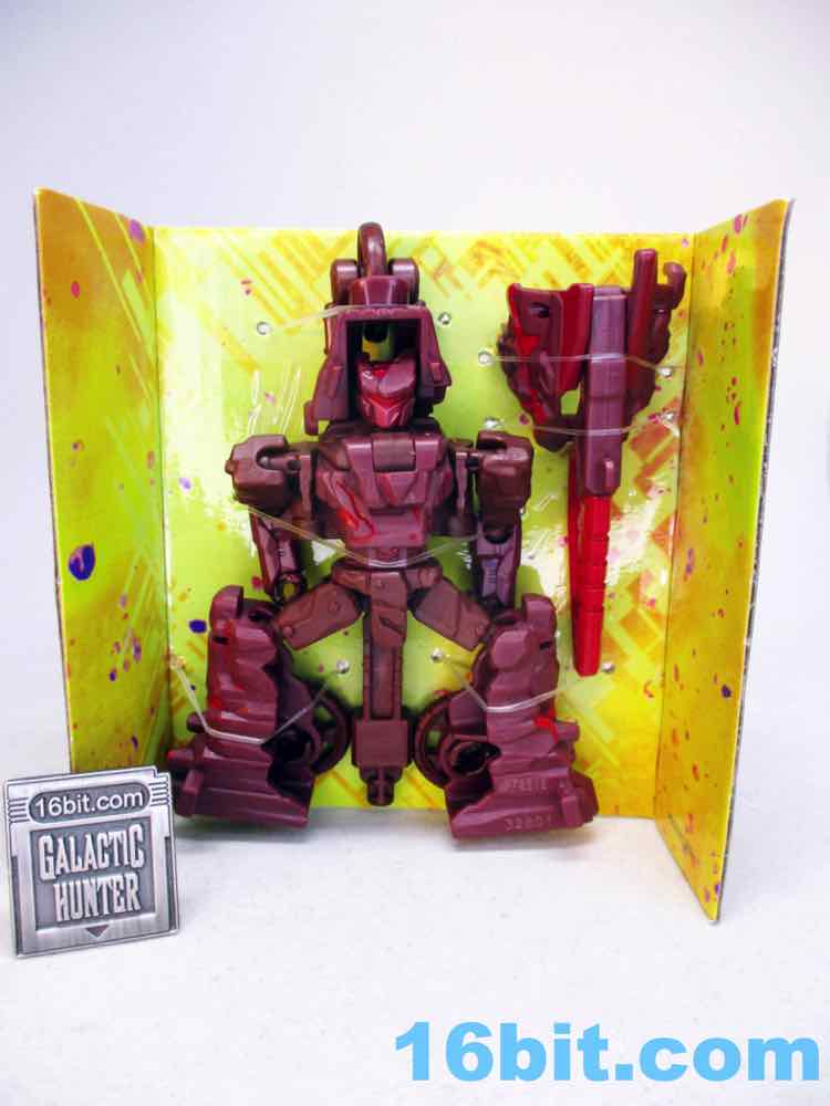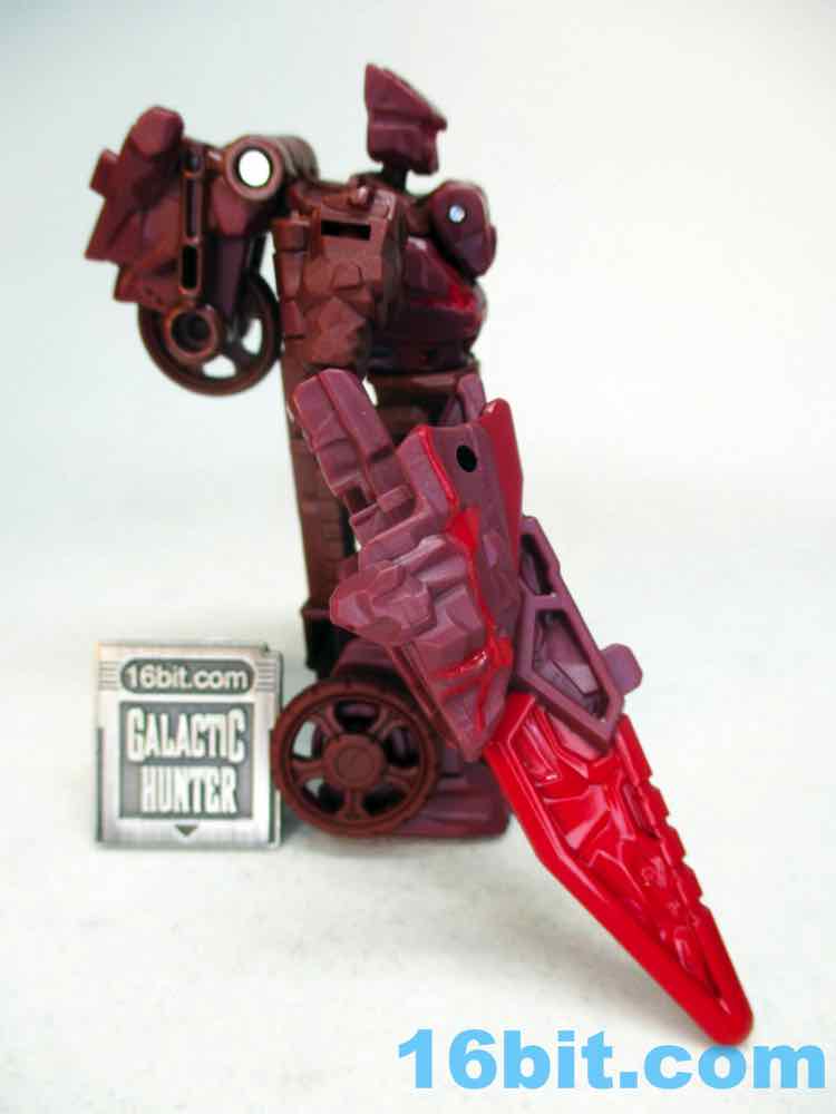 After taking a break from Transformers as a hobby in the 1990s briefly, I picked up a lot of Fuzors because they were cheap and weird - and that works for me. This guy is weird, but not particularly cheap. Sometimes it seems toys not based on an existing (and on-screen) character struggle, in part because there's no personality in modern toy packaging. There's no mini-comic or file card, so this guy is a blank slate. It's a brown guy with a face mask, a lumpy helmet, and a red bar across his face where the eyes go. This means it's up to you to decide who he is, and I think that's something kids like a lot more than adults, and Legacy is generally designed with olds in mind. The figure's articulation is on par with other Core-class toys, with ball joints that hold together nicely and big thick boots to keep him from falling over carrying his giant blade weapon accessory.