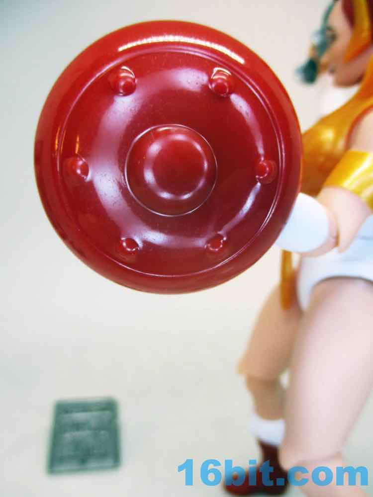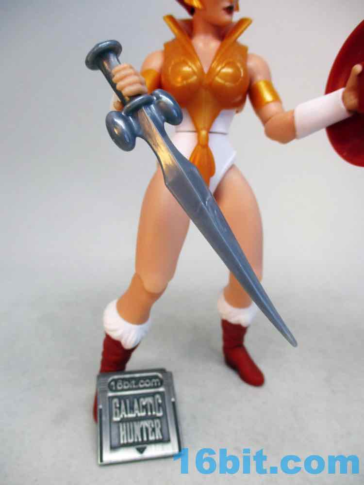 Her main accessories are a Filmation-inspired sword in a rubbery plastic with no paint, and a simplified cartoon shield. The shield is in a hard plastic and seems a bit darker than what was on screen, but I'd say it looks pretty good. It's clearly different than the previous shield mold, and she has no problems holding either weapon. The rubbery blade doesn't bother me much, but I have seen samples come out bent. I imagine it would snap like a twig if Mattel used a harder plastic, or somebody would get stabbed for real. Neither is a good option.