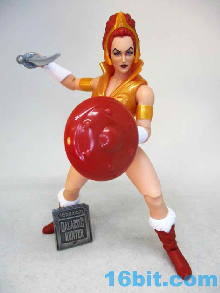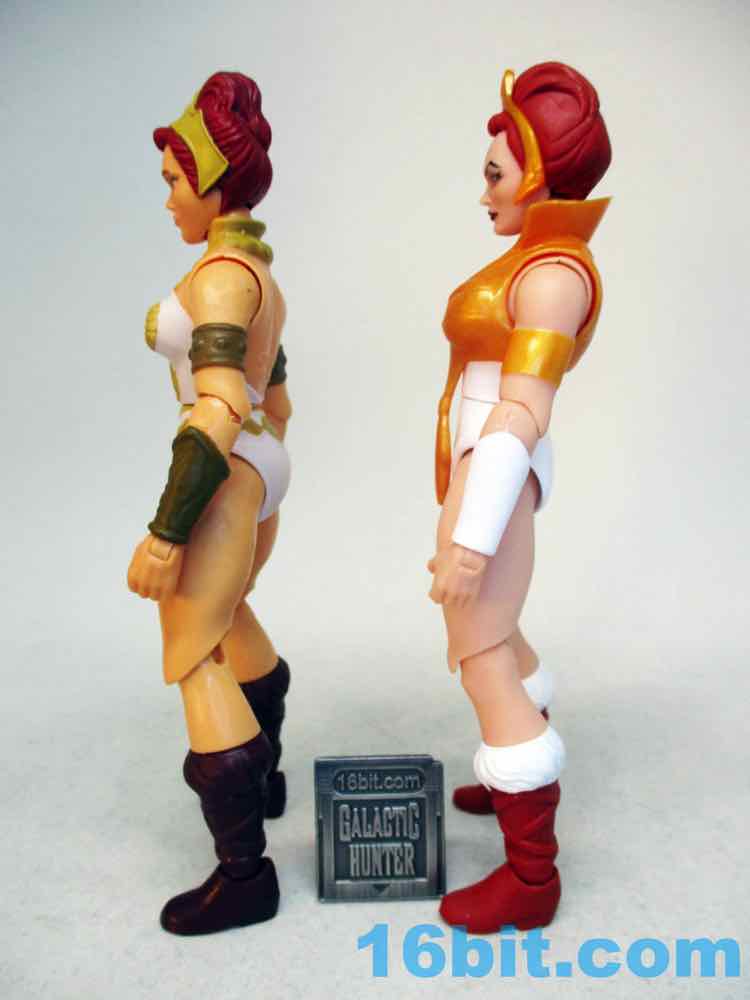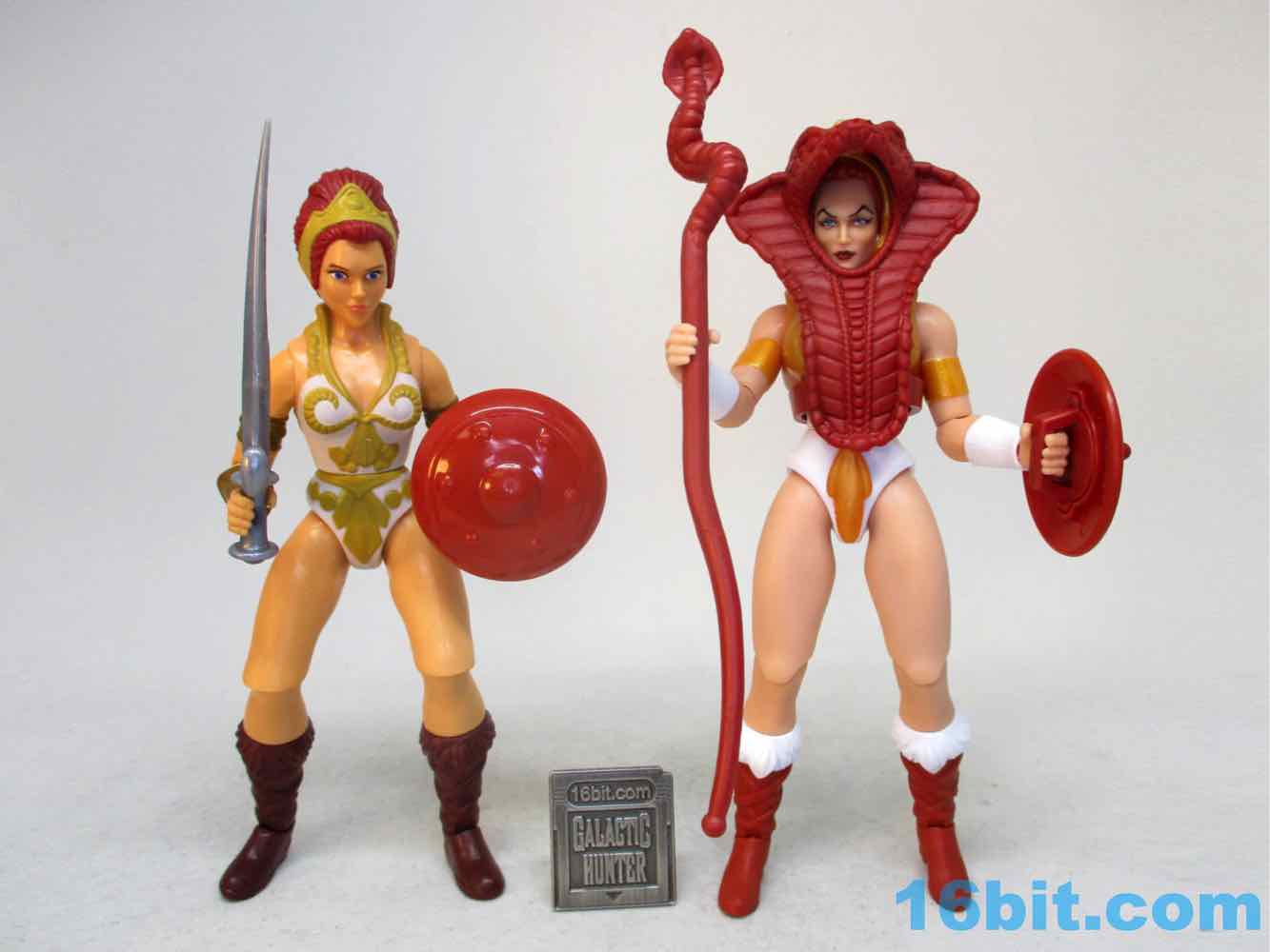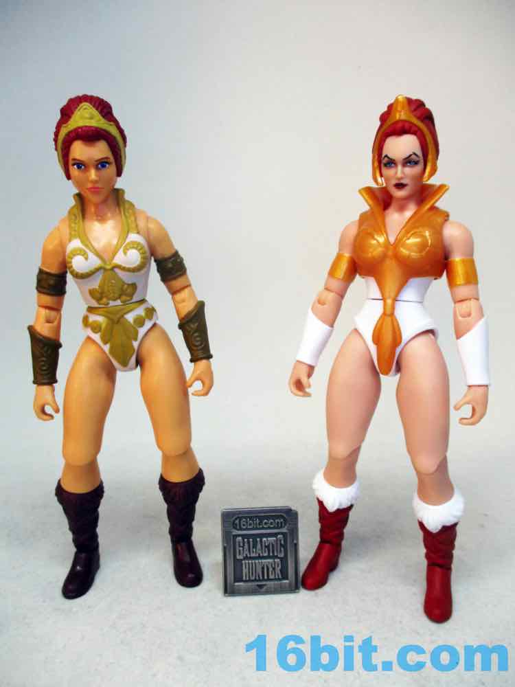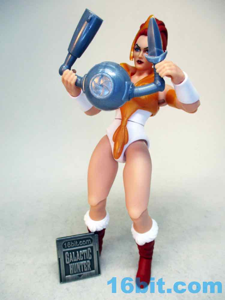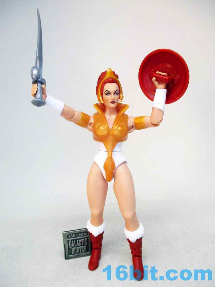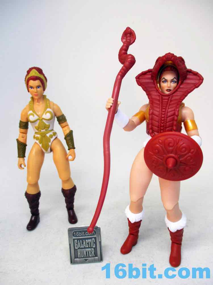 Thanks to the distinctive look on the TV show, you'll probably have a compelling reason to buy this figure along with Snake Teela, Teela with Zoar, regular Teela, and the Eternian Goddess figures. This one drops the snake motif completely with no hood, no knife, and no staff. They did some clever things to keep her molded in color as much as possible, including a rubbery gold top that hangs down and a matching tiara. The upper-armbands are painted in a matching gold color, while the white of her bodysuit, furry boot tops, and vambraces are all white. All of her skin appears to be molded in color, as is her hair. I have heard concerns about the rubbery plastic used for her top holding up over the long term, and I assume older fans who take care of their toys should have a nice, long life with this figure. After all, they're at or over 40 and this is where you start doing the grisly math of which is more likely to go first - the top, or you.
