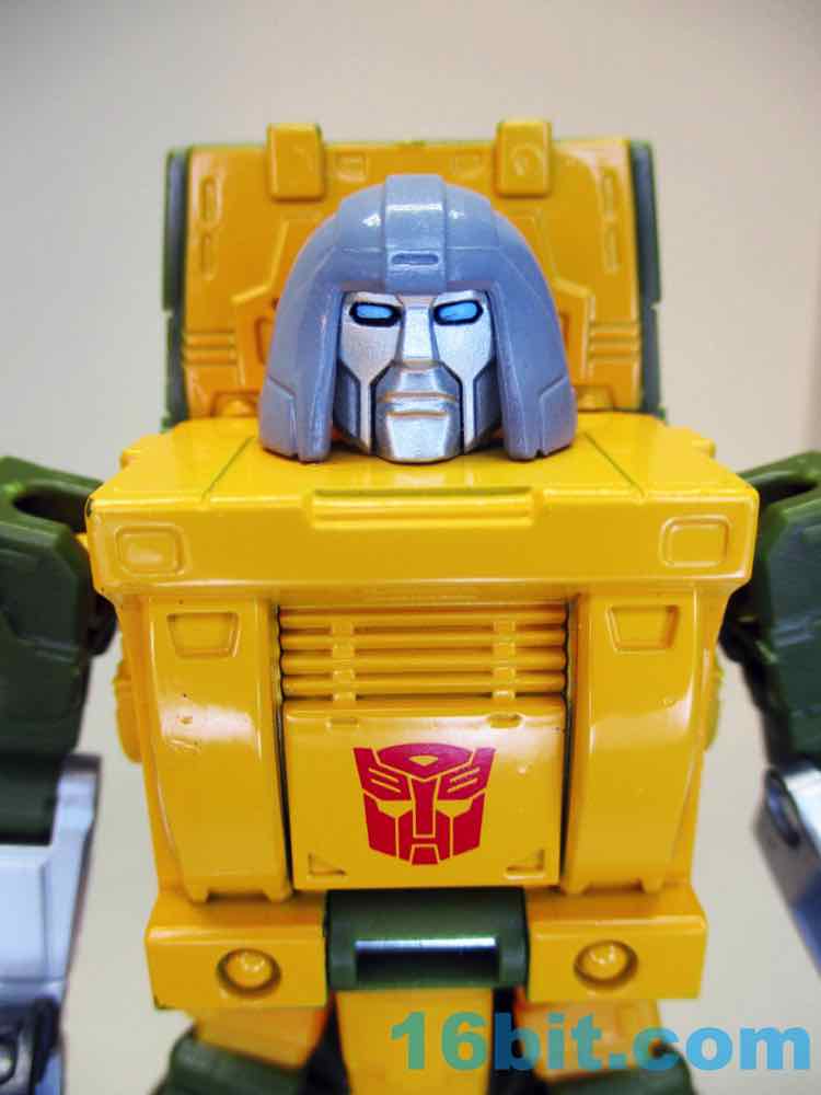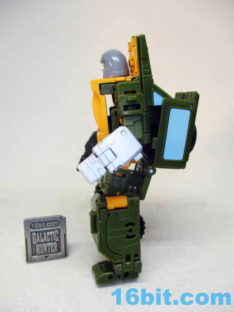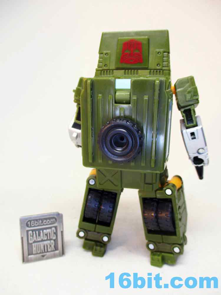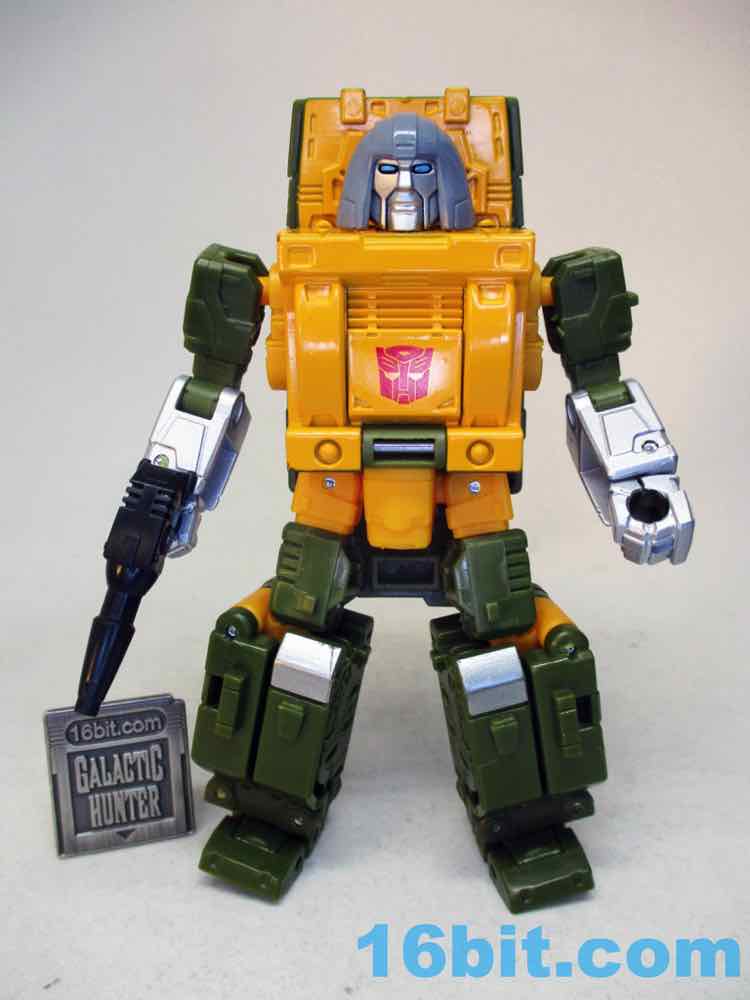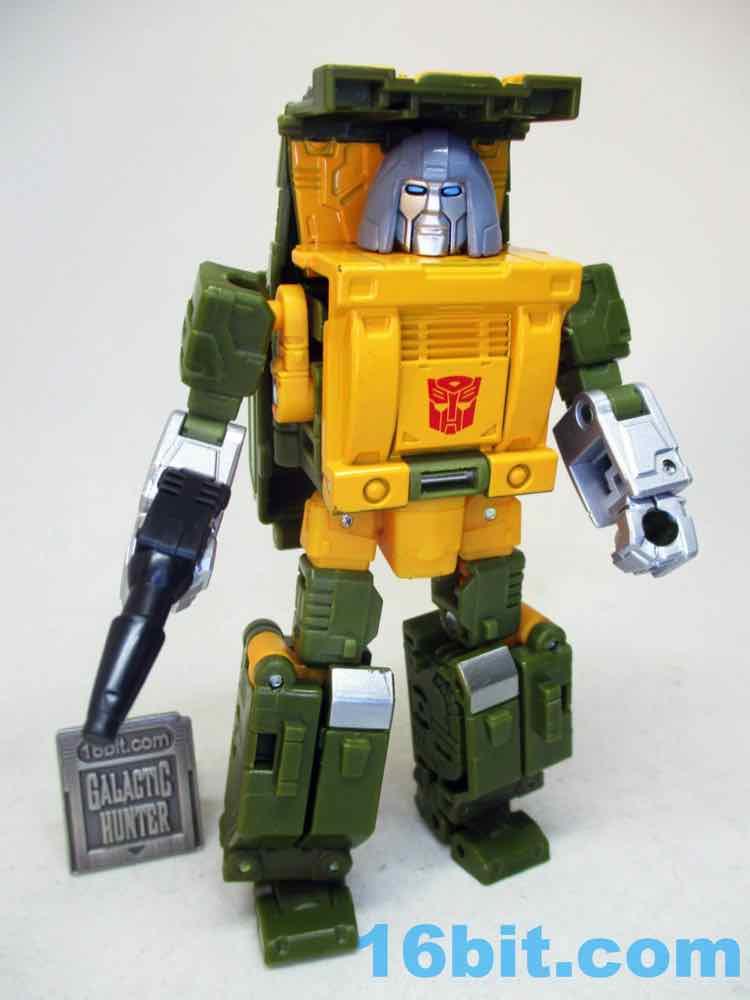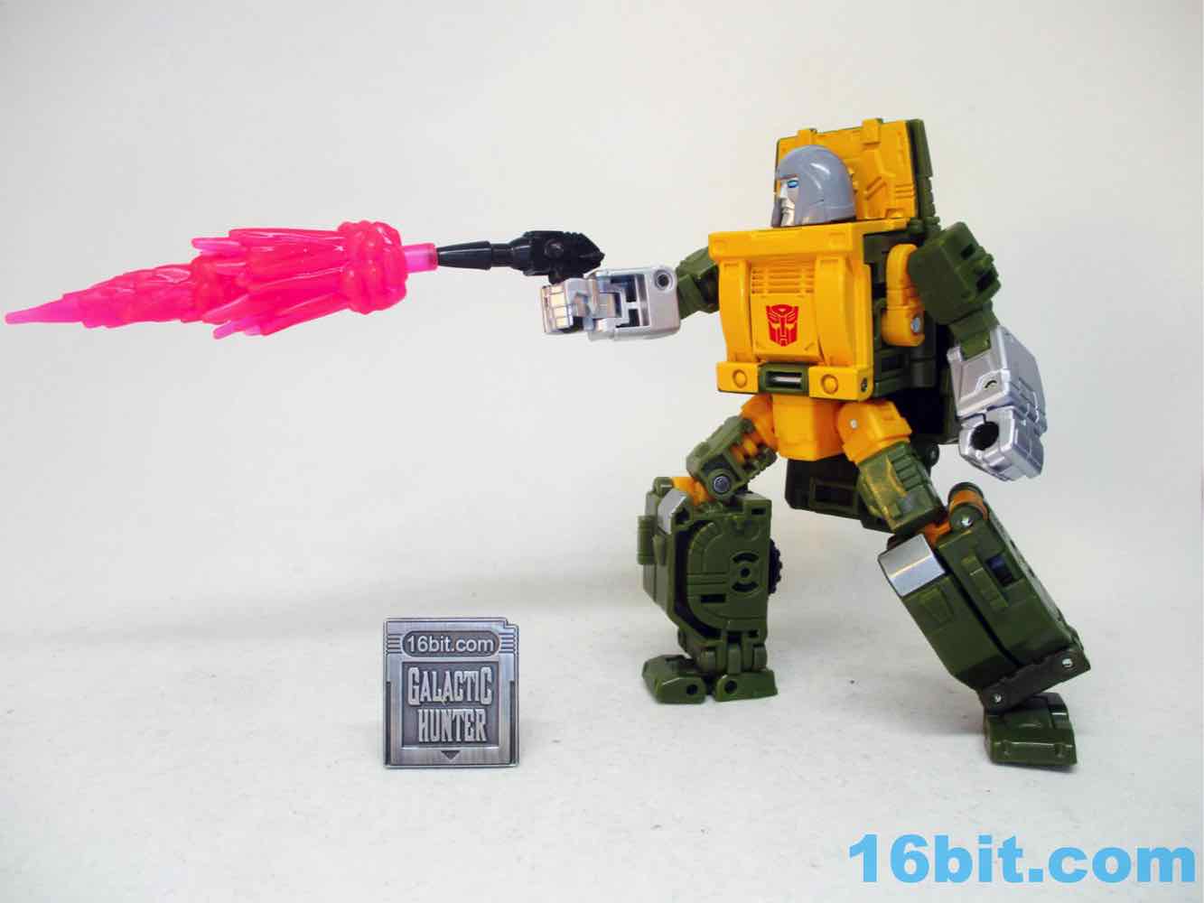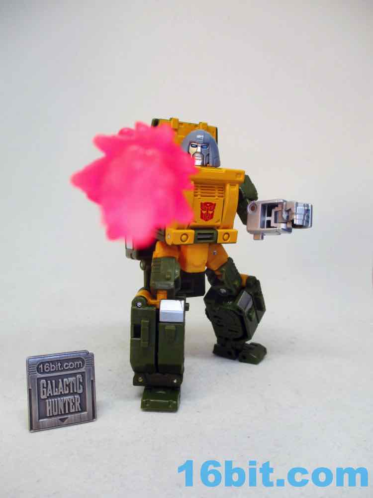 The figure's larger size and higher price does bring some improvements like a bigger, more expressive head and a lot more articulation. Sadly th wrists don't rotate and we don't get rubbery tires like we did for Beachcomber, but we do get rocker ankles and a rotating "bonnet" that you can put out of view to give him a cartoon-like look or twist up to make him feel a little more like the many toys. He stands nicely, and is more or less satisfyingly chunky and stable. I just wish there was less paint and more of him was molded in color. He can hold his blaster just fine, and it's a decent robot overall. Having said that, I think they could do a better update later which is kind of a shame given how many Brawn toys we already have.