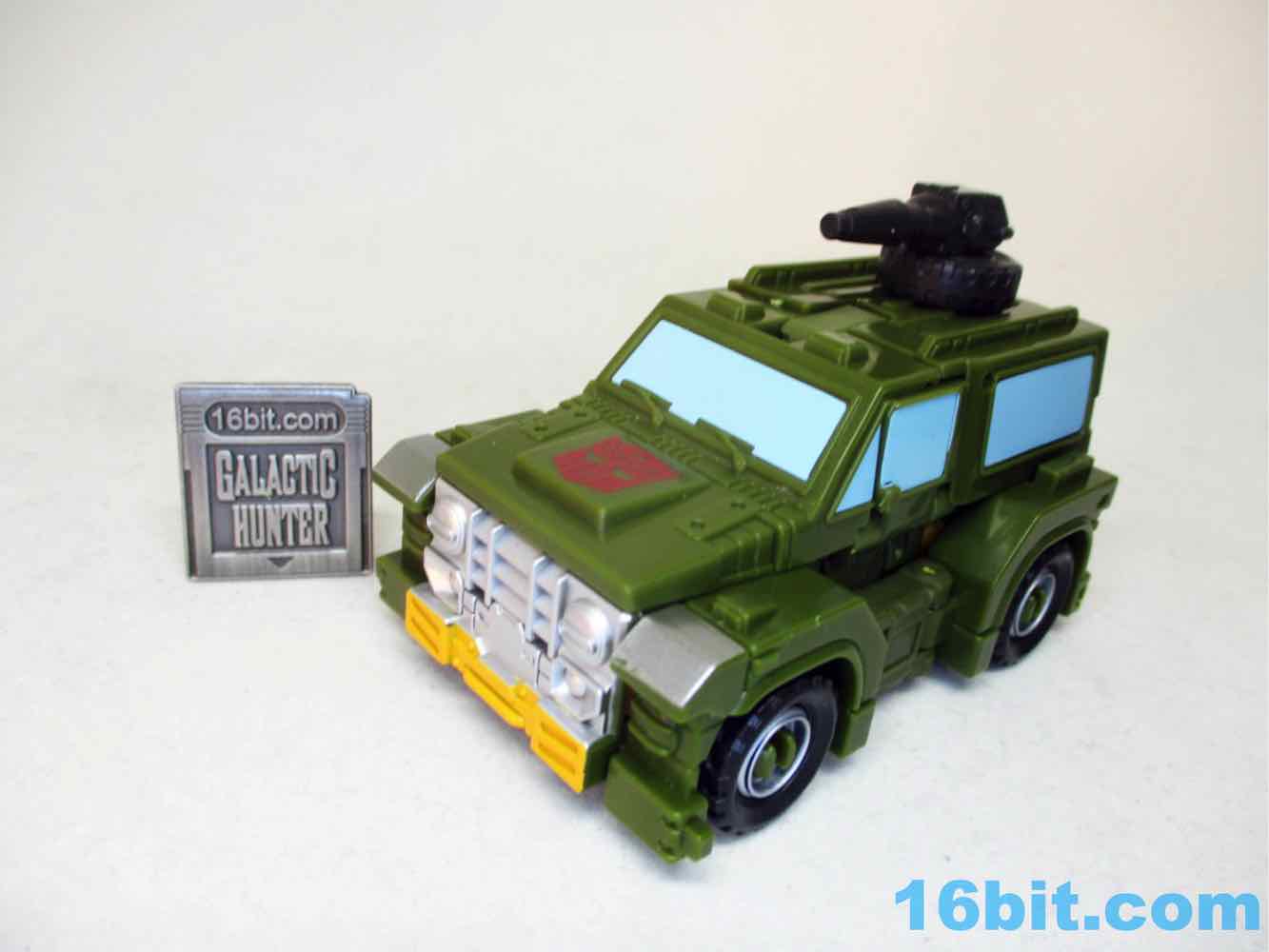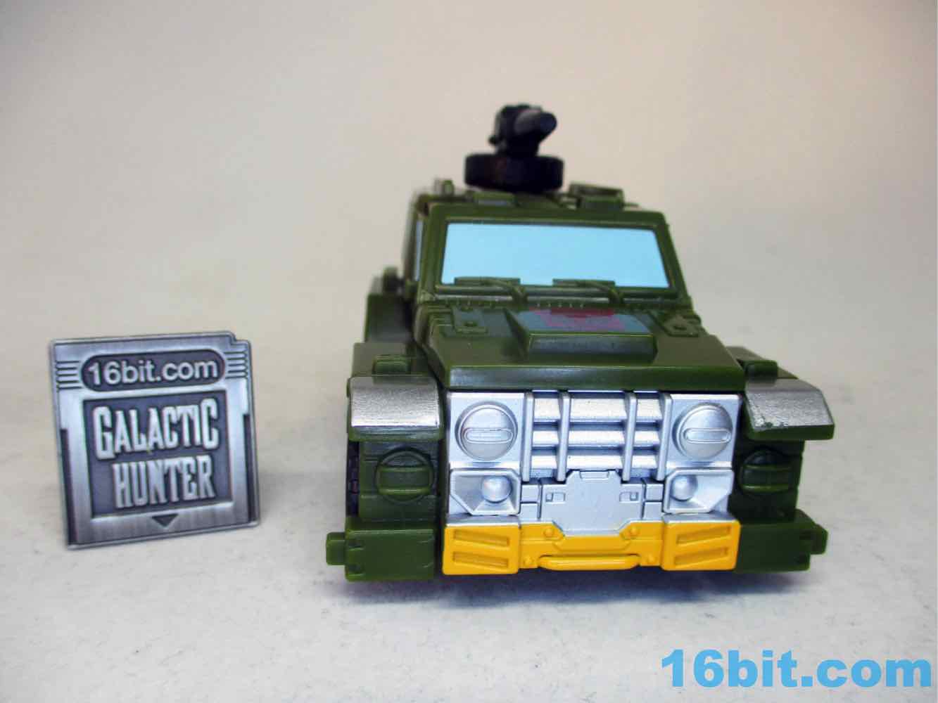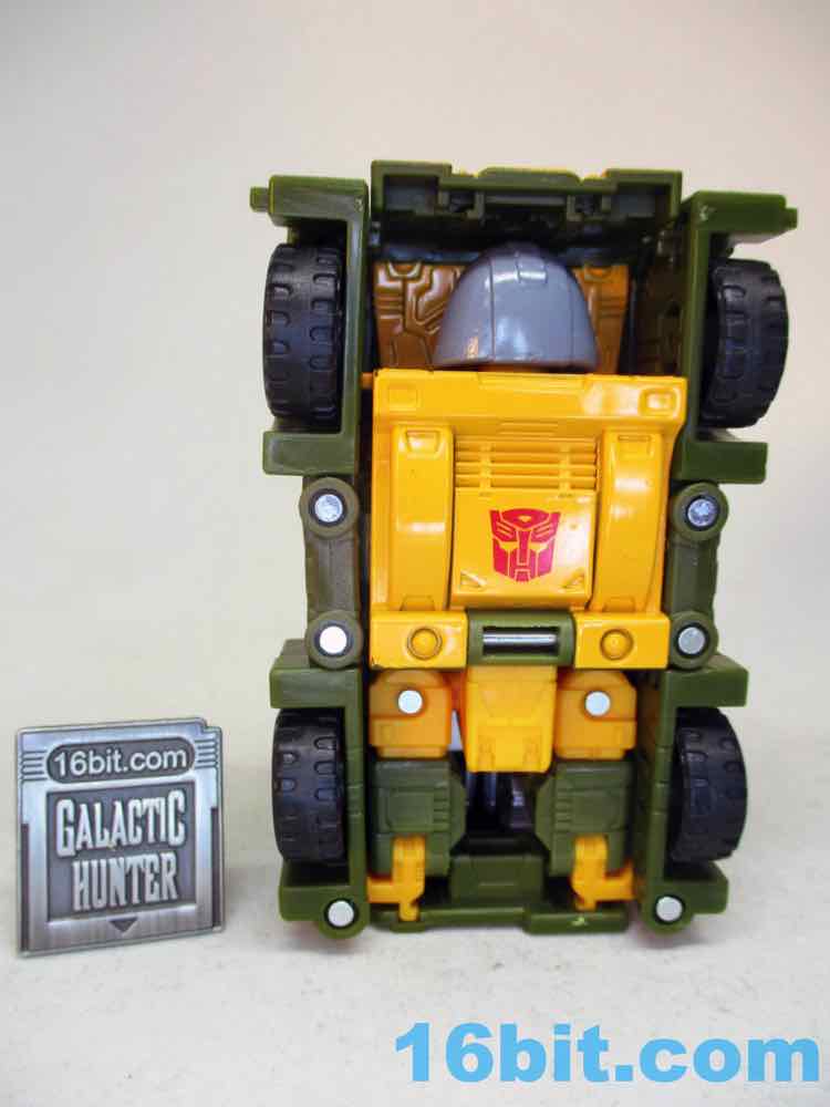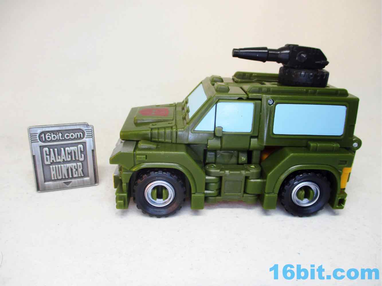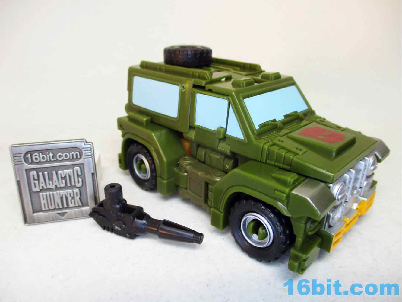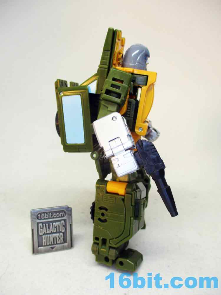 The figure's larger size and higher price does bring some improvements like a bigger, more expressive head and a lot more articulation. Sadly th wrists don't rotate and we don't get rubbery tires like we did for Beachcomber, but we do get rocker ankles and a rotating "bonnet" that you can put out of view to give him a cartoon-like look or twist up to make him feel a little more like the many toys. He stands nicely, and is more or less satisfyingly chunky and stable. I just wish there was less paint and more of him was molded in color. He can hold his blaster just fine, and it's a decent robot overall. Having said that, I think they could do a better update later which is kind of a shame given how many Brawn toys we already have.