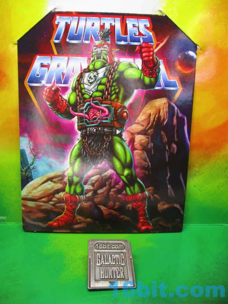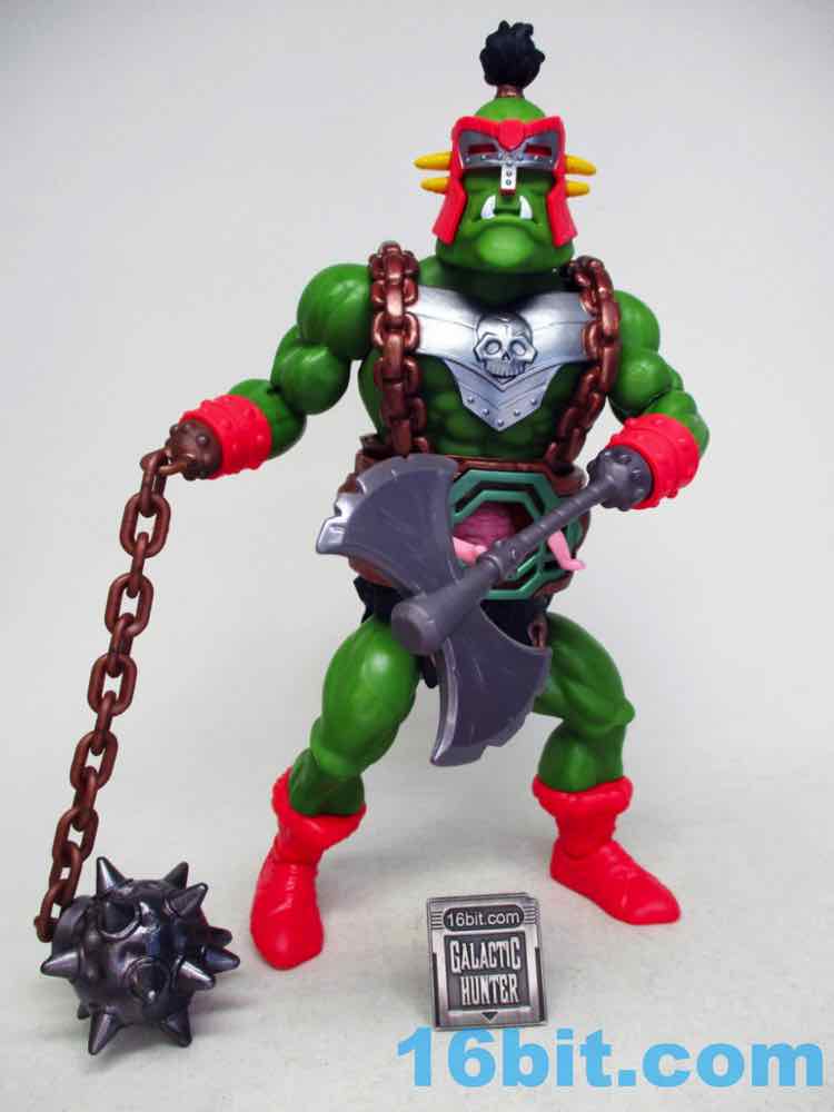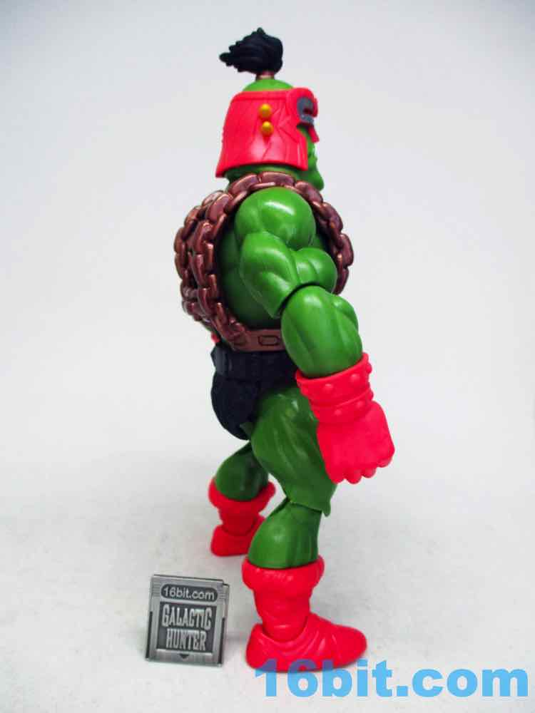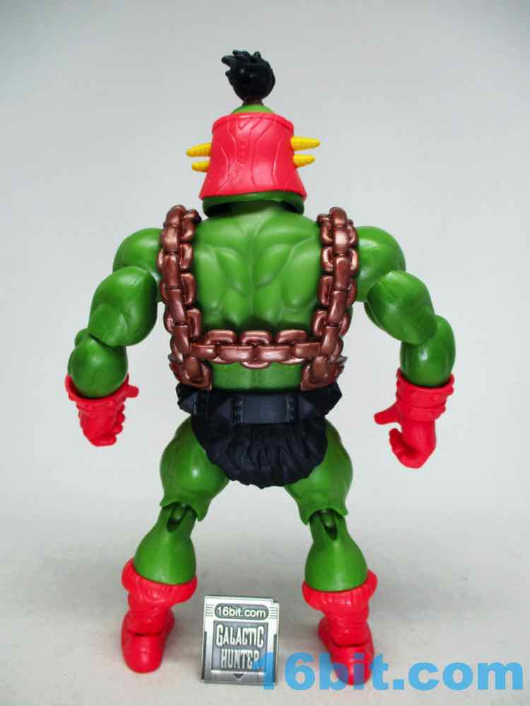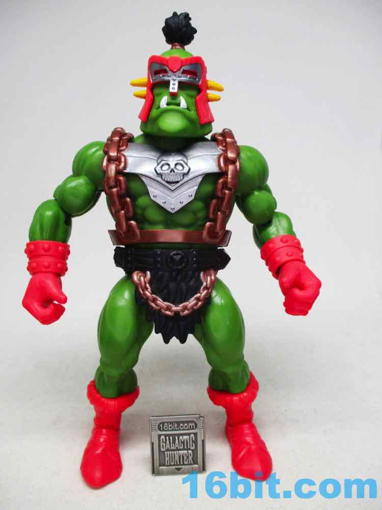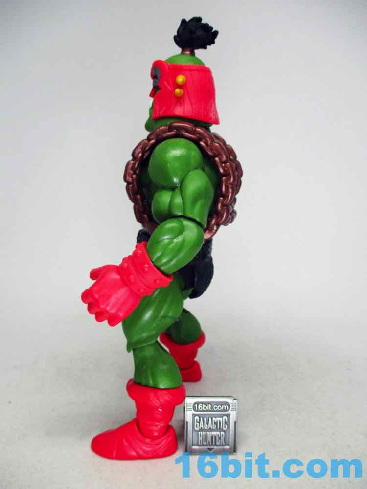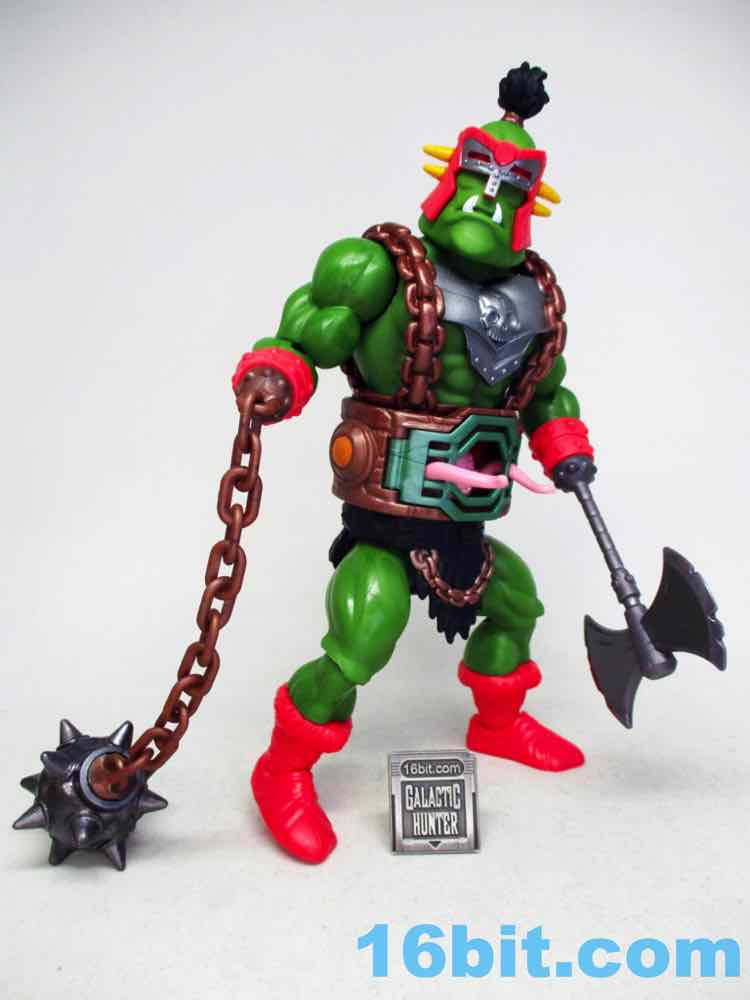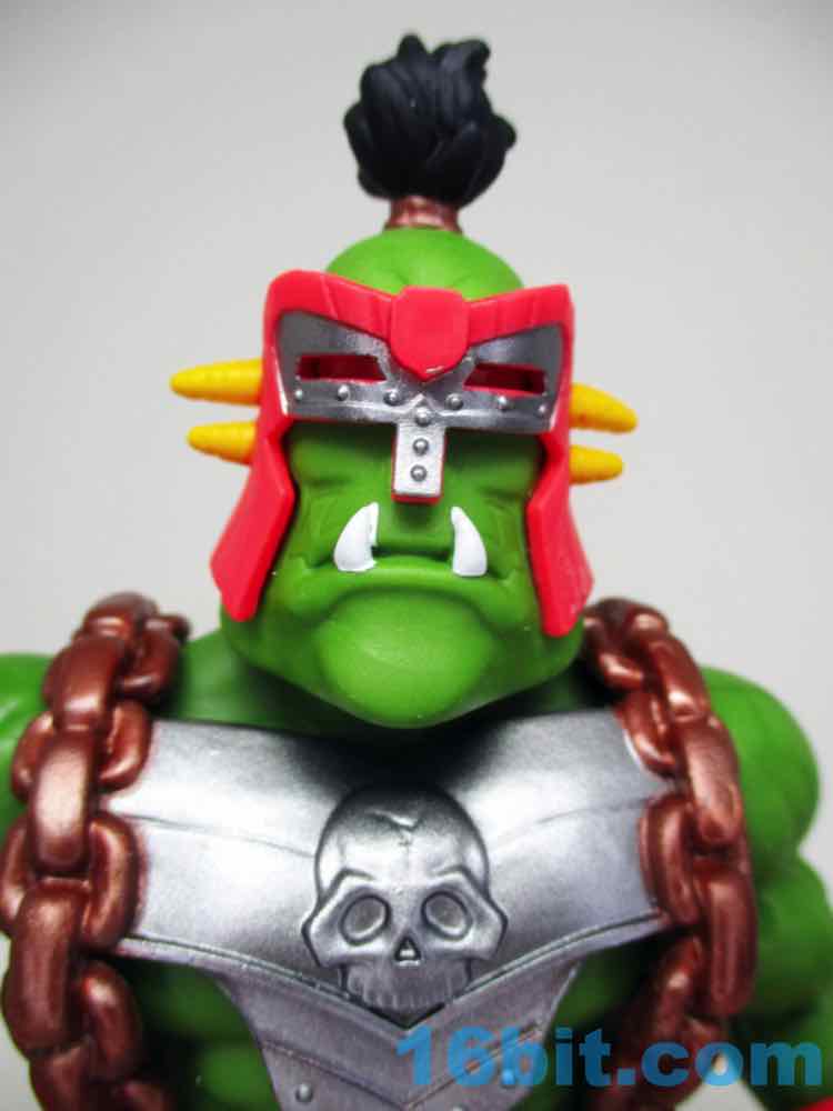 The main figure really revels in being a mash-up. Using an existing WWE body, the figure changes out the boots and decorates the hands as gloves. The head is a mix of Krang's android body - the visor and cybernetic cues - with the green skin and black hair of Megator, some new spikes on the side and a new red helmet, plus hints of armor to cover the nose from nowhere in particular. Odds are someone could have put this head out on an indie figure as an original character and nobody would clock it as a licensed character mash-up - it's non-specific enough to count as new. That's pretty exciting in a line that exists to remix old toys.