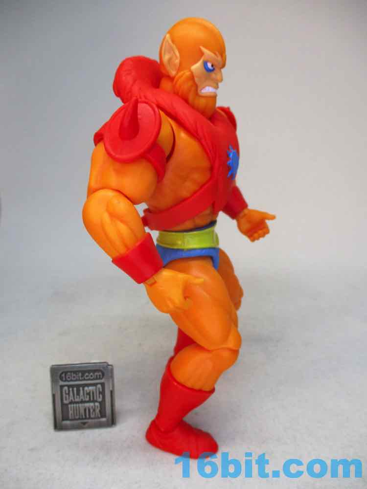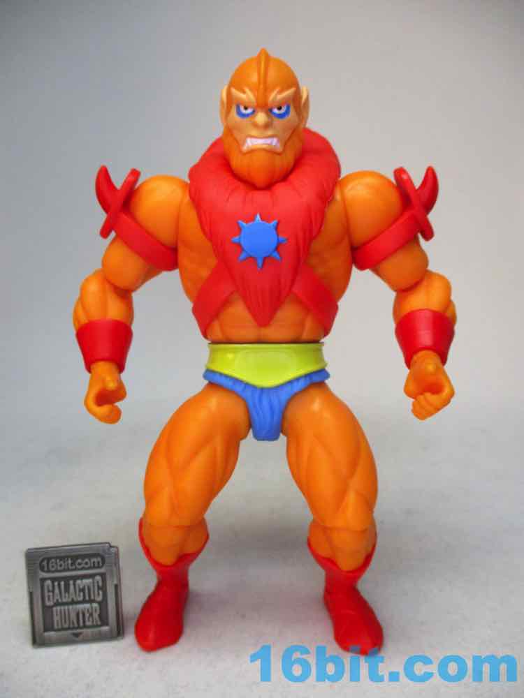 The figure has white fangs, but the character is something of a mouth-breather. Mattel generally has his mouth open, and the cartoon frequently gives us a look at the inside of his mouth while also exaggerating his lips a bit. His face is usually a pasty fleshy white color, with surrounding very dark orange - and this figure has saturated, bright orange. The eyes on the cartoon tend to be a bit more droopy, while here they're exquisitely printed on but a bit more fierce. Mattel made Beast Man look a bit more formidable, playing up the muscles with the shared buck and letting him stand up like a hero. If Beast Man were an actual person, I bet he would appreciate getting this treatment. It looks like he's really taken better care of himself, but it's not quite what we saw on TV in the early 1980s.
