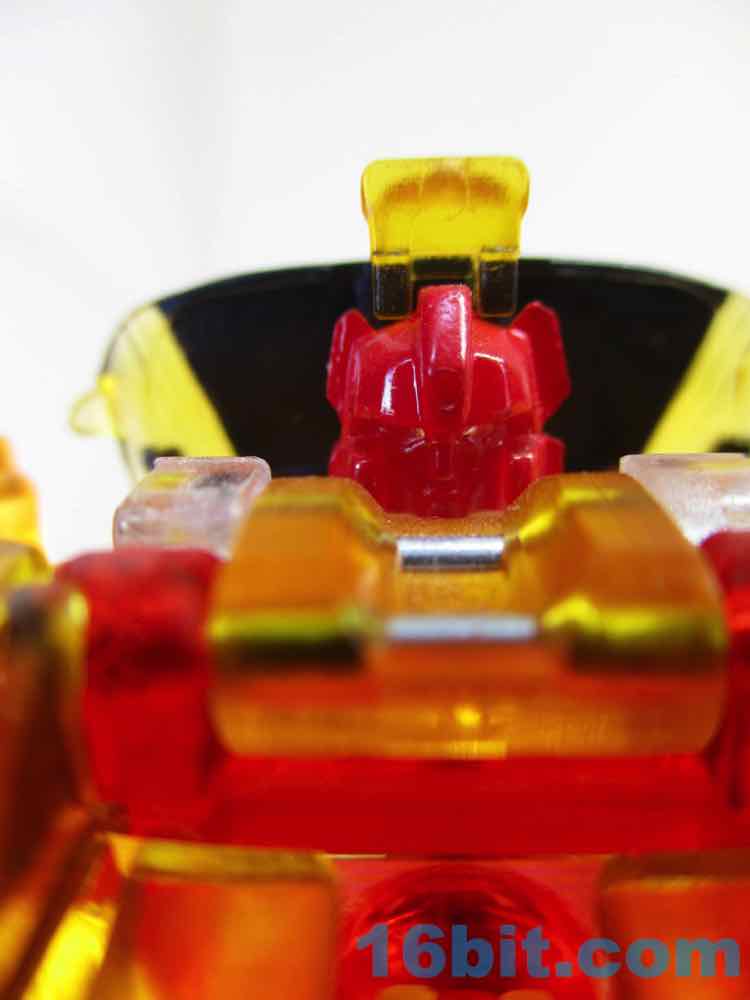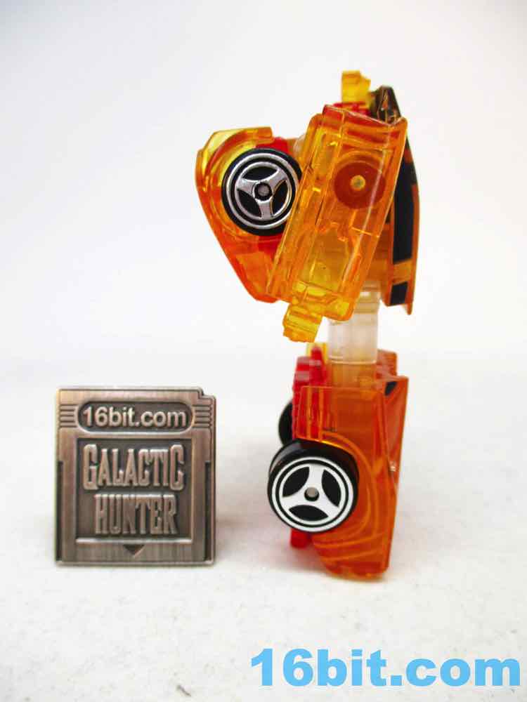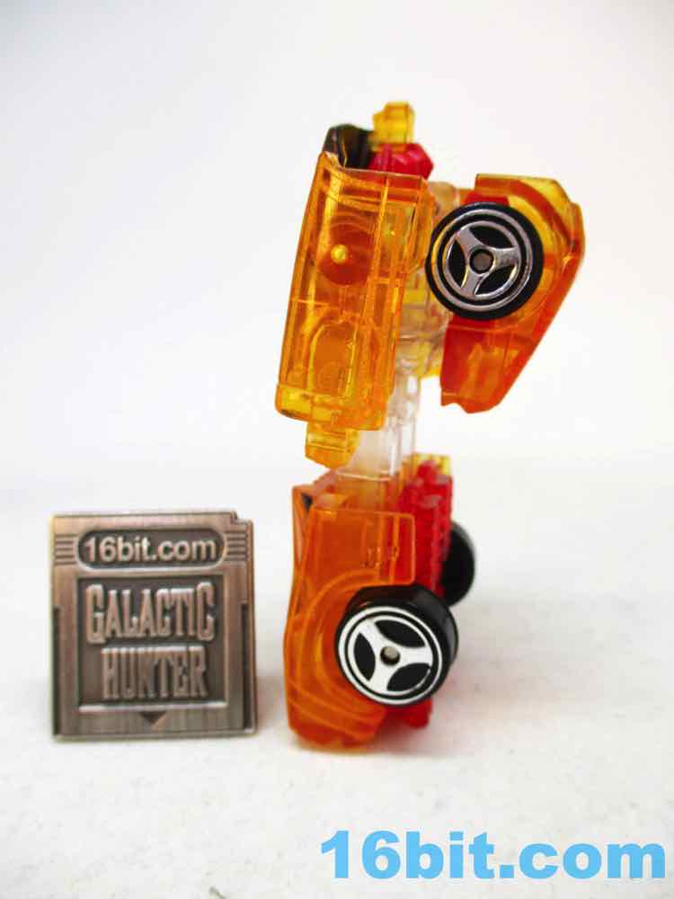 As a robot, it's a pretty cute little toy - but nothing amazing. Pretty much the entire line of these GoBots and Spy Changers work the same, with jointed shoulders and nearly identical transformations complete with a 3mm peg accessory. This one is a US recolor of the toy in clear orange plastic for the car with slightly red shins, a clear colorless chest, and a painted red helmet. It's hard to see detail if front-lit, and if you hold it up to the light you see a ton of sculpted detail. It's almost like an x-ray - it looks really nice.