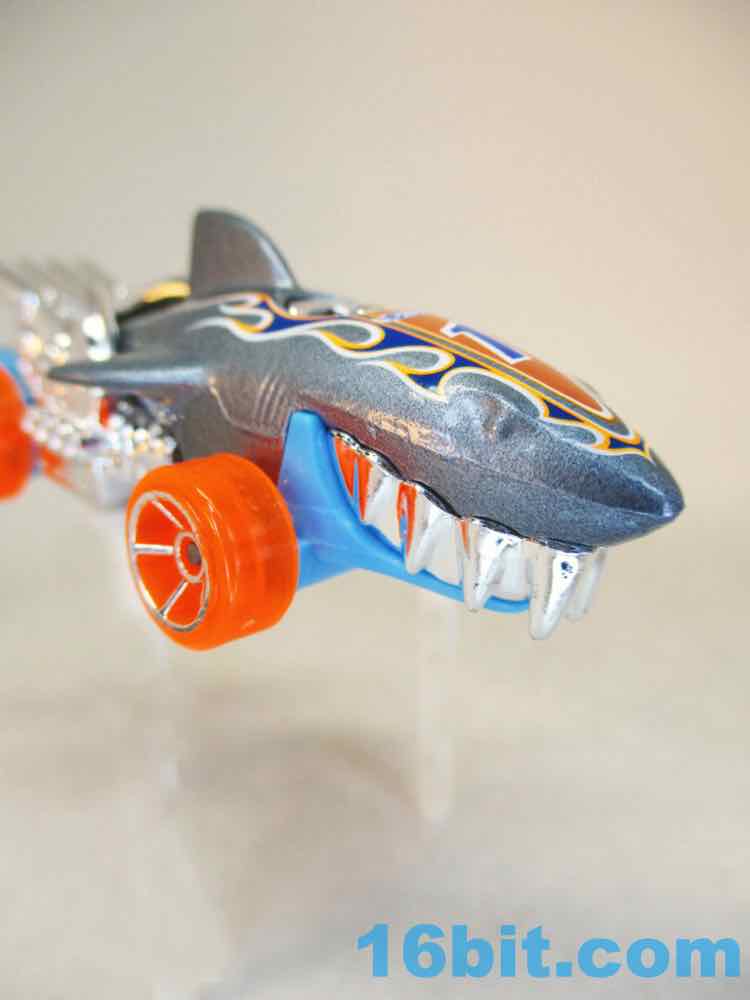 The cartoonish creature has massive silver teeth and its tail is wrong, probably for trademark reasons. You can't copyright nature, but you can change it. G.I. Joe in 1964 had his thumbnail relocated under the digit, so it's distinct and a company couldn't just copy the mold exactly. The Sharkcruiser has a horizontal tail like marine mammals, not a vertical one like sharks and fish. This makes it distinct from an actual animal, and the driver's seat would go where a dolphin's blowhole might go. (Sharks don't have blowholes, they have gills - just like this car, or a vintage 1972 Dodge Charger Rallye Coupe.