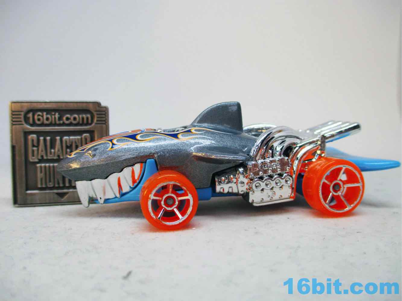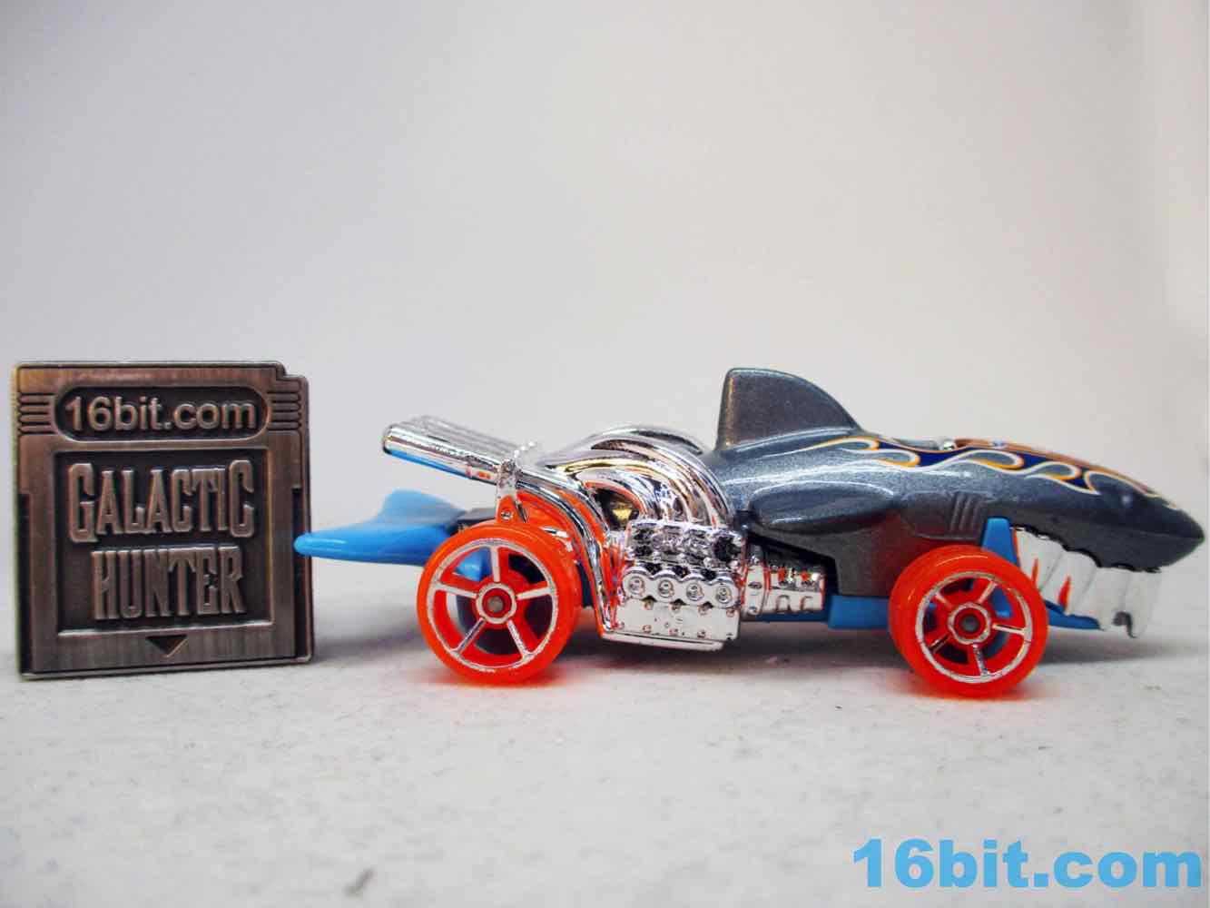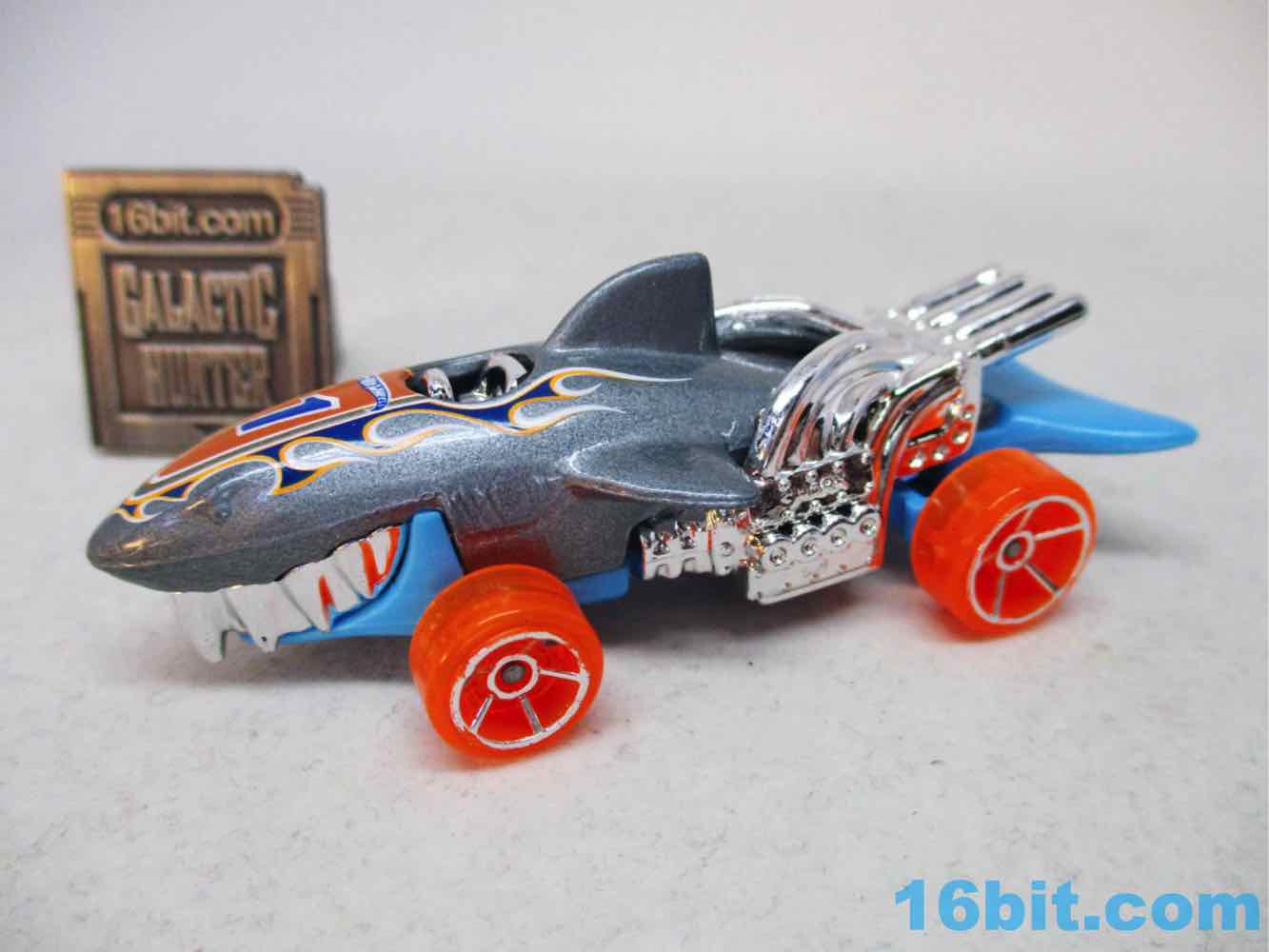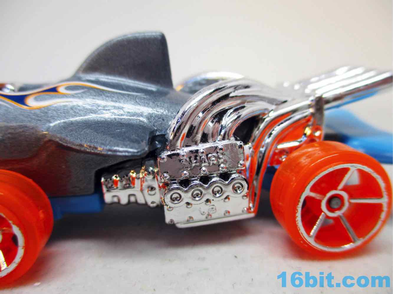 The original release was almost all gray except the chrome bits and painted black eyes. This one has gray painted metal, blue molded plastic, and some silver chrome bits for the seat and "SHARK" engines. And the orange wheels, it should be noted, have silver trim - but the painted eyes were lost, and instead we got a "1" and some orange and blue flames. It's a little silly, but not bad - I'd be perfectly happy with a simple one like the original.