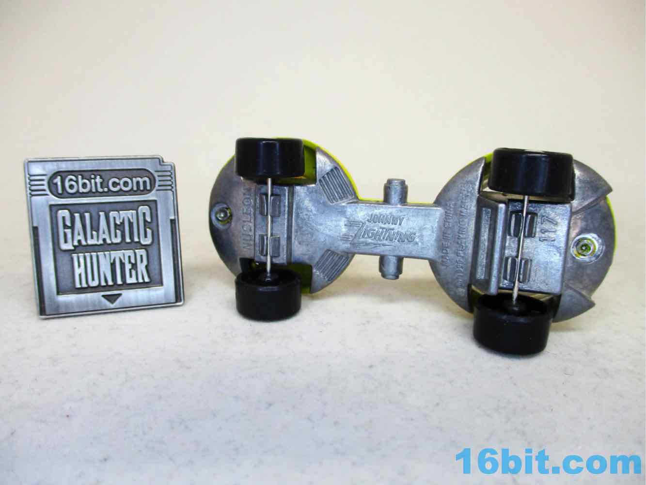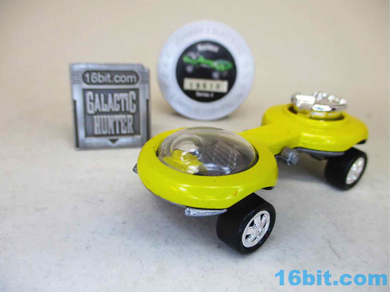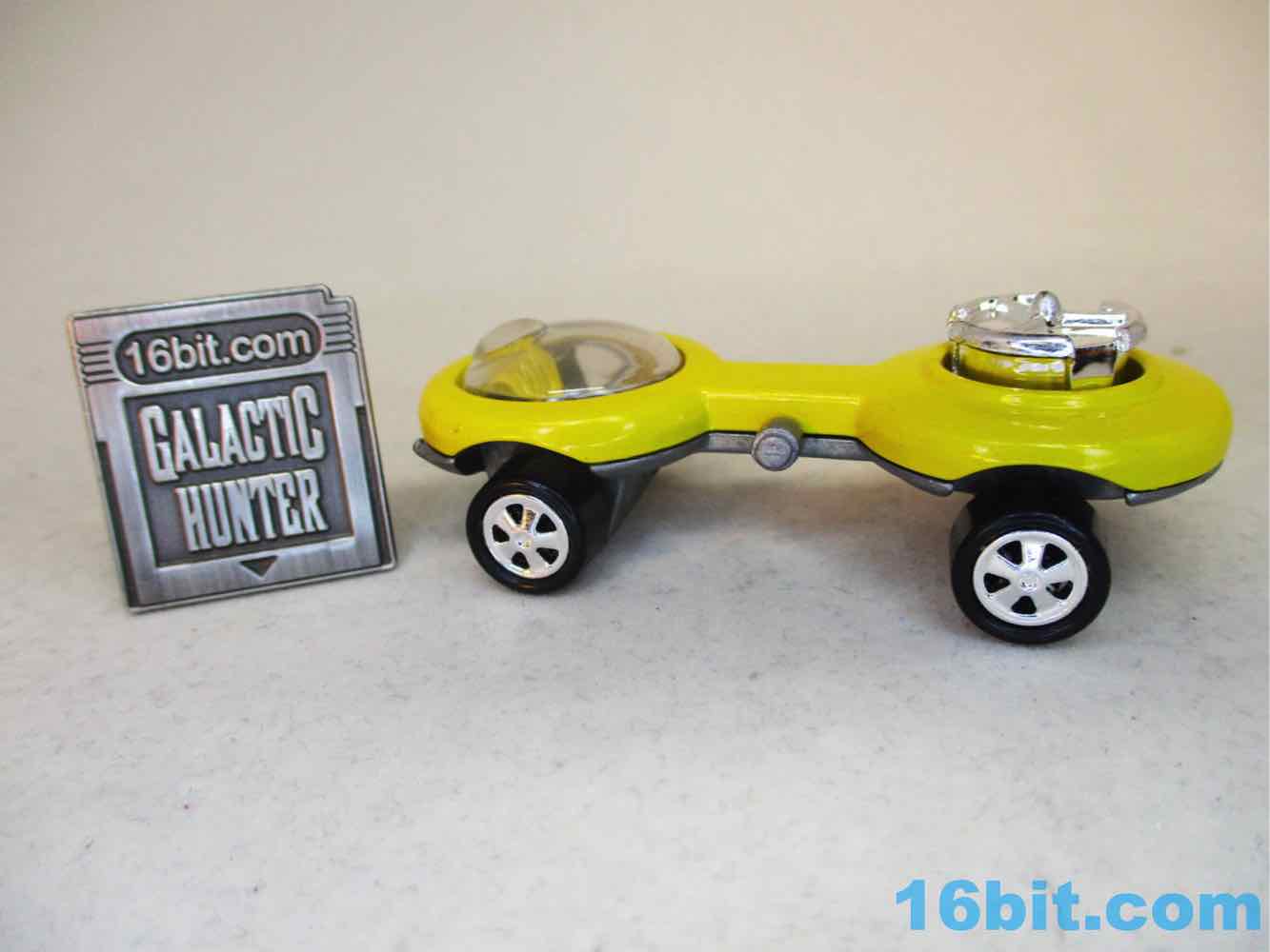 I spotted this one in June of 2024 at an antique mall in Phoenix and thought "Wow, that's super cool and weird, I wonder if it's any fun?" And then came back to get it six days later. Thankfully toys of the 1990s - especially for adults - were over-produced and under-loved, so this is pretty much worthless today. Both the top and bottom parts are die-cast metal of some sort, with a clear plastic window for the driver in front and a chrome engine of some sort in the back. These seem much more fanciful than Mattel's concept offerings, basically being two circles with a bridge in the middle and pegs sticking out the sides. Why? I don't know. It's weird, it looks sort of like something a kid might draw in art class and I found that incredibly appealing. The yellow lacks significant sparkle but in some light you can see a hint of it.