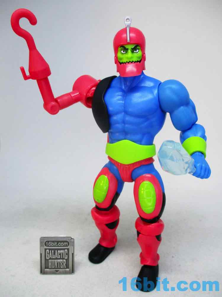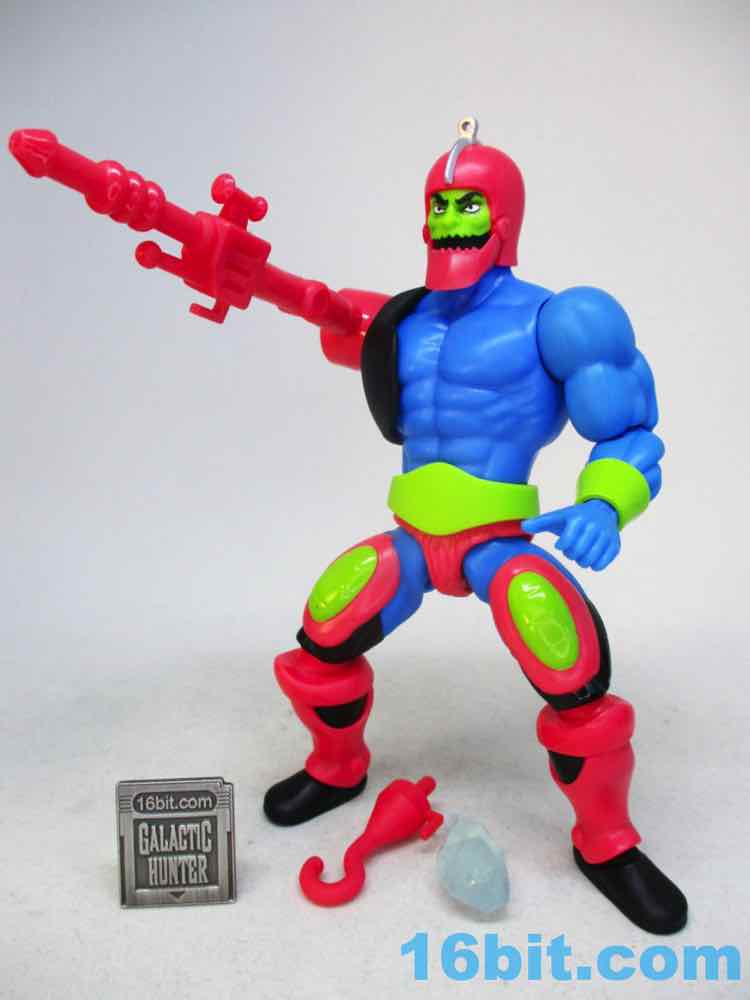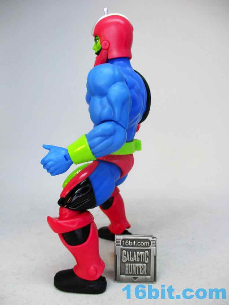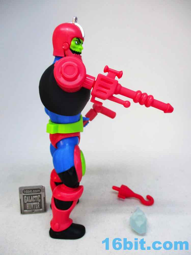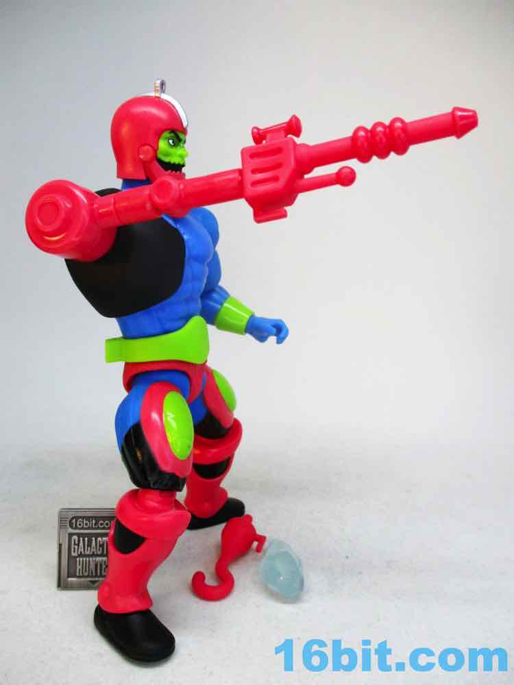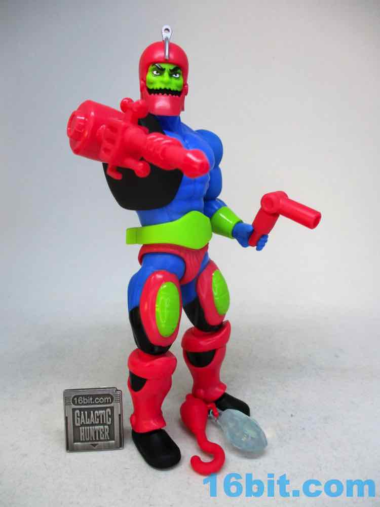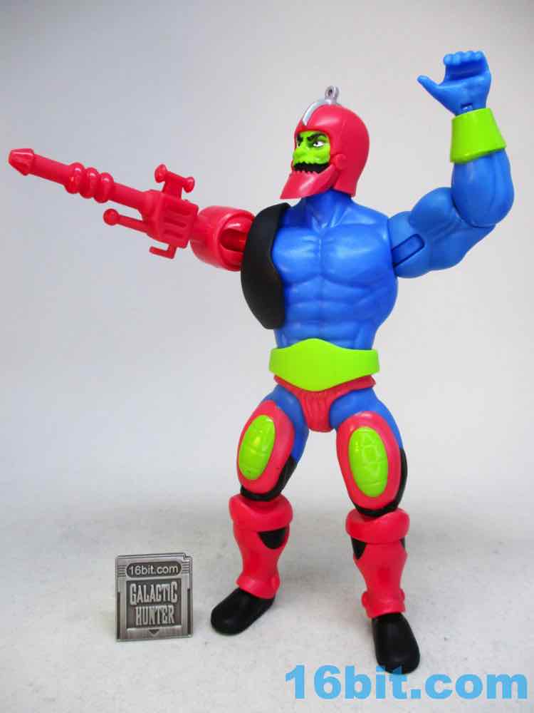 OnThe figure is a mix of new and newish parts, with an all-new head, shoulder, black armor piece, belt, and I believe all-new legs. The elbow piece is new, but the blaster and hook are repurposed from previous Trap Jaw releases. The bright Origins colors really work here, making his skin pop - and the pink armor pop. The blue pops well too. This is a figure that looks far more vibrant than on TV, and is all the better for it.