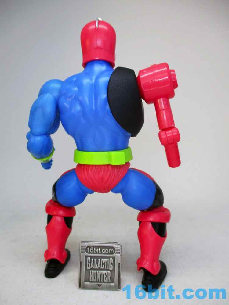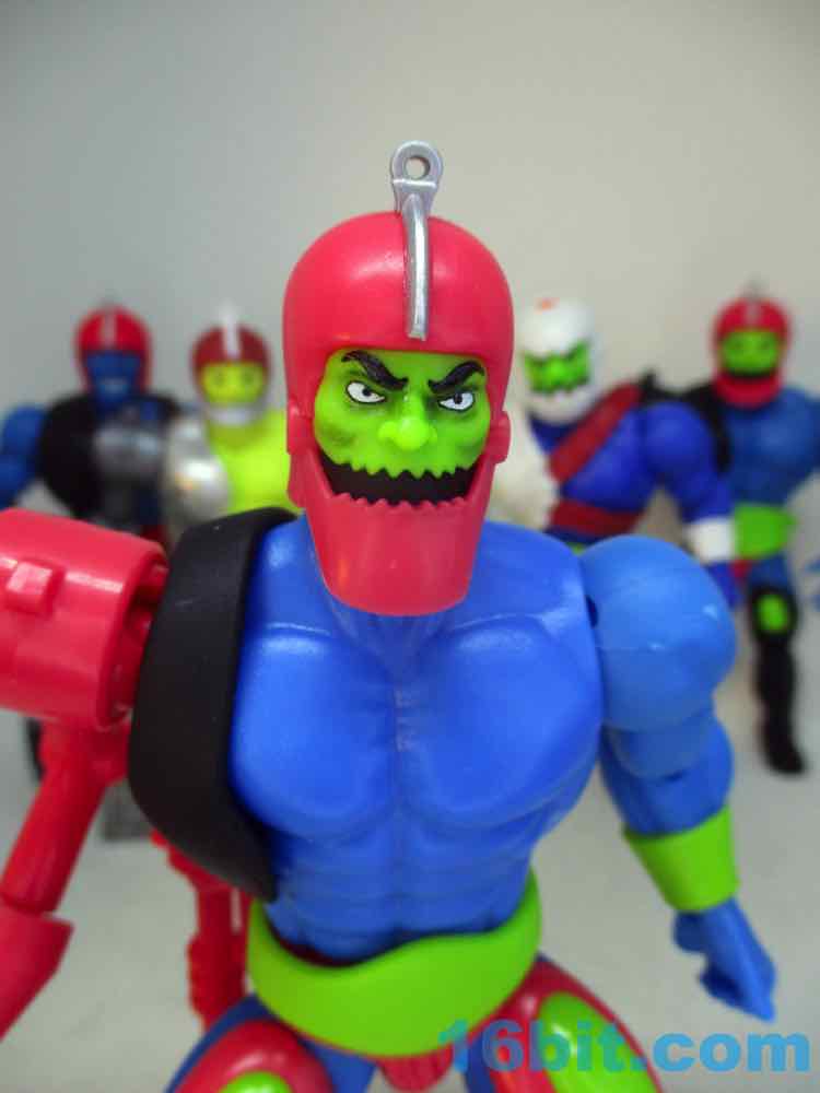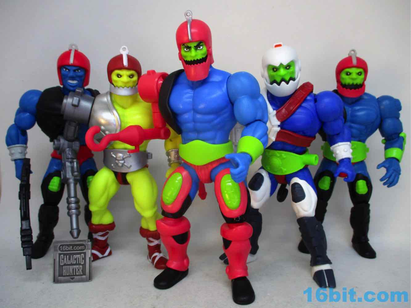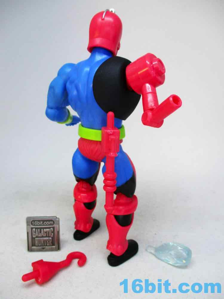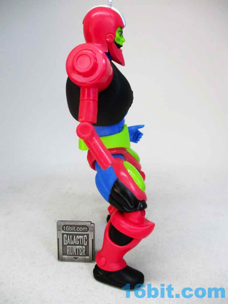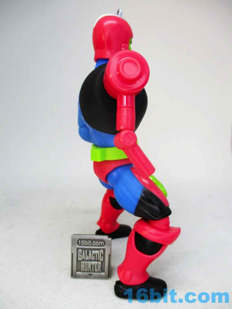 OnThe figure is a mix of new and newish parts, with an all-new head, shoulder, black armor piece, belt, and I believe all-new legs. The elbow piece is new, but the blaster and hook are repurposed from previous Trap Jaw releases. The bright Origins colors really work here, making his skin pop - and the pink armor pop. The blue pops well too. This is a figure that looks far more vibrant than on TV, and is all the better for it.