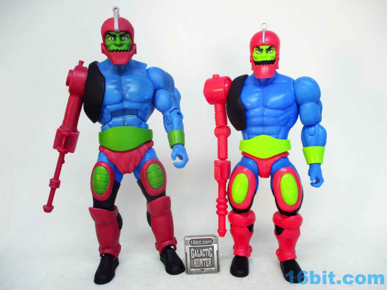 He has some notable differences from the previous releases. If you got the Mattel Filmation one a few years ago, this new one has molded green skin which is much more evenly painted. The eyes are sharper and a bit shinier, looking more like ink from an animation cel than painted figure features. He has much more paint than most of these figures, with his silver helmet hook on his head, green arm band, plus green, pink, and black elements on his legs. Of all the cartoon figures, this is the one where it looks like you're seeing a payoff from new parts. The range of motion on the legs is pretty great, allowing him to squat like an old 5.5-inch figure, or to stand fully at about 6-inches tall. He towers over his Origins counterpart, making him look even squatter and I daresay a bit dumpier. Granted, I'm not crazy about that Trap Jaw's head or eye coloring. It's weird, but not the kind of weird I tend to like.