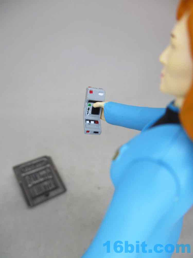 The figure is very similar to the memory of an old Kenner toy, with very straight arms and legs. With her coat, her ability to swing her legs forward is slightly impaired but not so impaired that you can't slide her in your old toy vehicles! She's mostly going to just stand around, but she looks good. The right hand can barely grip the tiny Tricorder, so be very careful she doesn't drop it or you may never see it again. While the grip may be imperfect, the Tricorder is one of the best 3 3/4-inch accessories I've ever seen. Ever. And I have a lot of 3 3/4-inch action figures. Back in the day, Playmates gave you a sticker on a weird Easter Egg-colored plastic gizmo. Super7 gives you a gray tricorder with at least four colors of paint to represent the screens, labels, LEDs, and other elements you saw on the show. There's more detail on the Tricorder than there is on a lot of action figures I've bought - it's staggeringly good. I'm not saying you should buy it just for the gizmo - that'd be silly - but if you ask "Where is the money going on a figure like this?" you can see it here.
