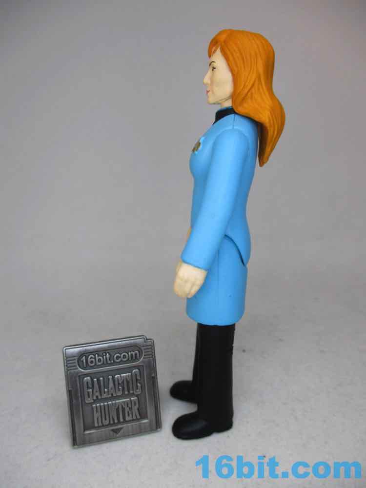 While I find the pose to be a little phoned-in, the sculpting is good with subtle wrinkles on her elbows, all three Commander pips, her combadge, and a pretty good head of hair. The color is a little too light, and her painted face loses some detail that may have looked better had it been molded in flesh color. Instead, it looks like they molded her in blue and then painted every single piece of her except the blue on her collar and chest. It's an odd choice that probably cost Super7 extra, but at least all the colors match.