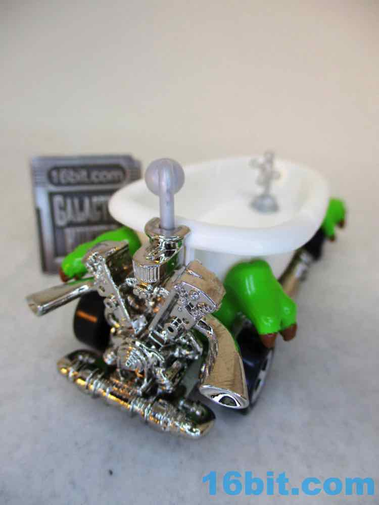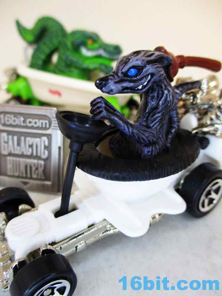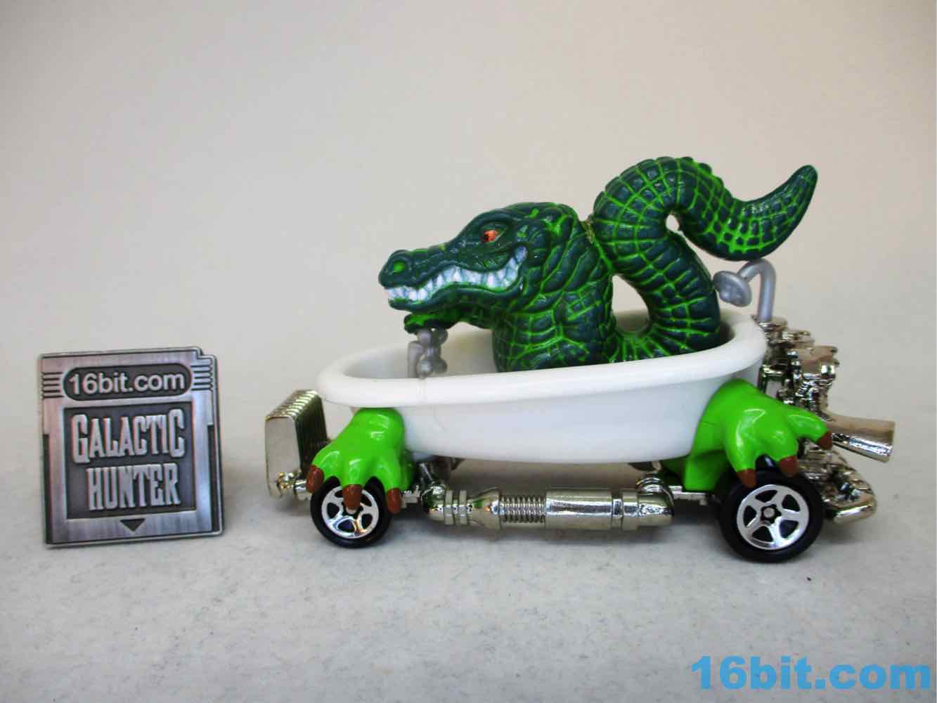 Joining our rat pal is the Sudzster with his gator driver. The little guy has painted eyes and teeth, plus scales filled in with lighter green paint. I really like these figures - the sculpted detail is pretty good for a toy of this size, with above average paint and a lot of personality in his wavy tail, determined grimace, and his hand reaching out for the shifter - a tub's control valve. The actual nozzle acts an exhaust, with lots of pipes making up the fanciful mechanics connected to an engine on the back. It also has gator feet for thematic reasons, and has a ton of fake sculpted plastic cracks in it. It's also once of the heaviest 1:64 scale (or close enough) cars that I own. It looks amazingly good despite being almost old enough to run for president. He, too, just sits there - there's no plugs or ways to get him fastened in there.