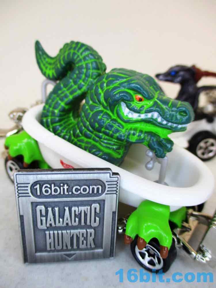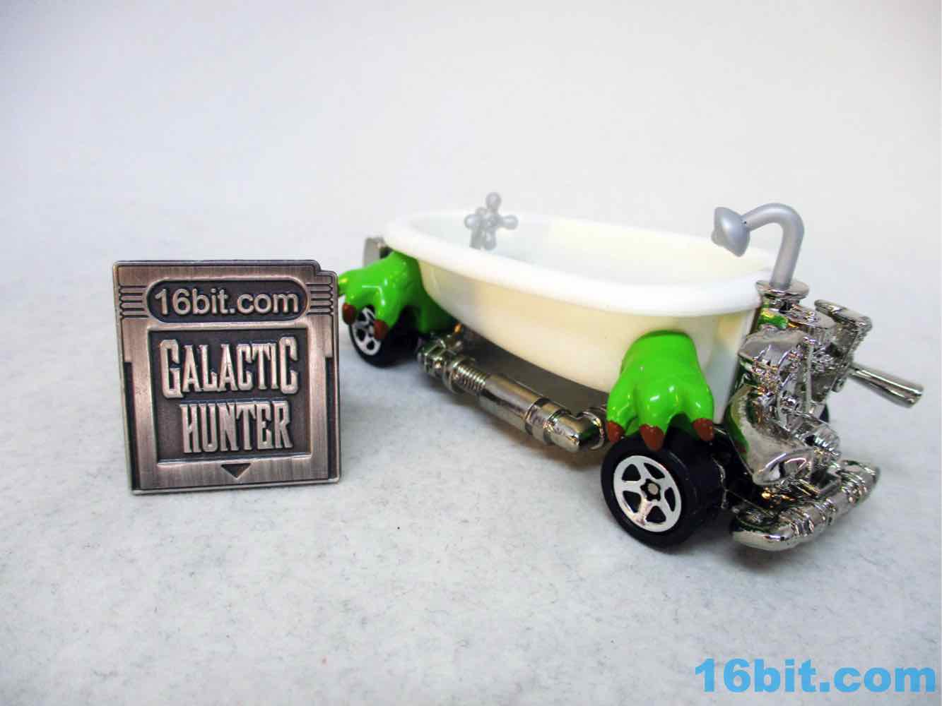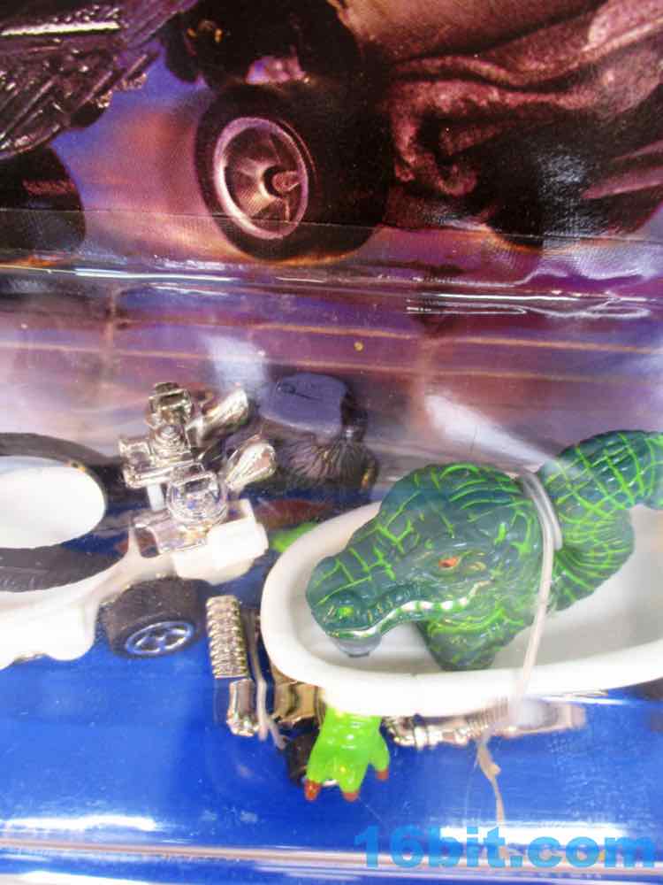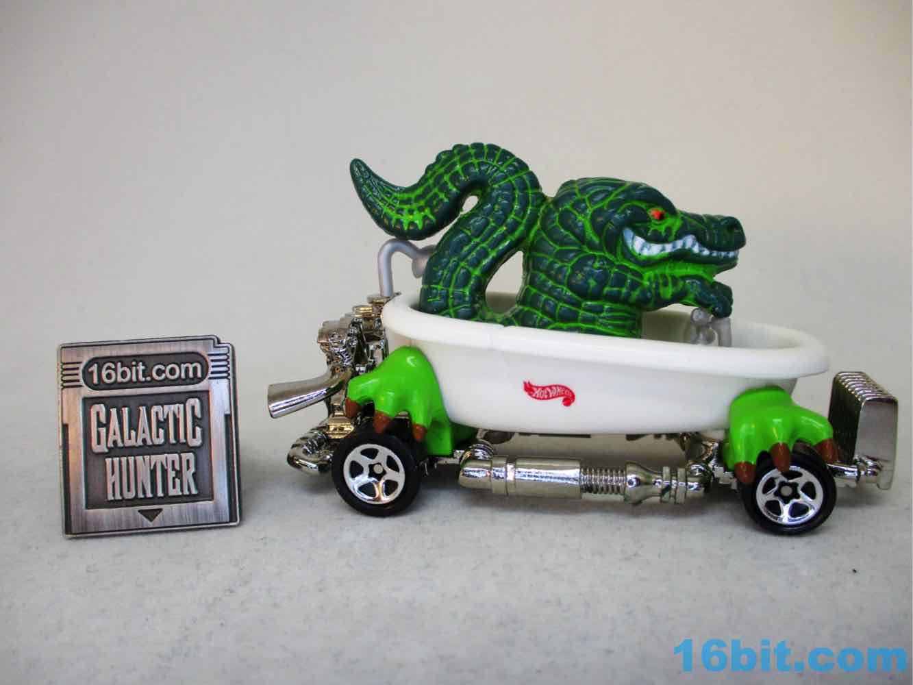 Joining our rat pal is the Sudzster with his gator driver. The little guy has painted eyes and teeth, plus scales filled in with lighter green paint. I really like these figures - the sculpted detail is pretty good for a toy of this size, with above average paint and a lot of personality in his wavy tail, determined grimace, and his hand reaching out for the shifter - a tub's control valve. The actual nozzle acts an exhaust, with lots of pipes making up the fanciful mechanics connected to an engine on the back. It also has gator feet for thematic reasons, and has a ton of fake sculpted plastic cracks in it. It's also once of the heaviest 1:64 scale (or close enough) cars that I own. It looks amazingly good despite being almost old enough to run for president. He, too, just sits there - there's no plugs or ways to get him fastened in there.