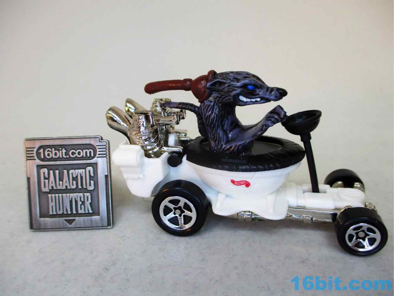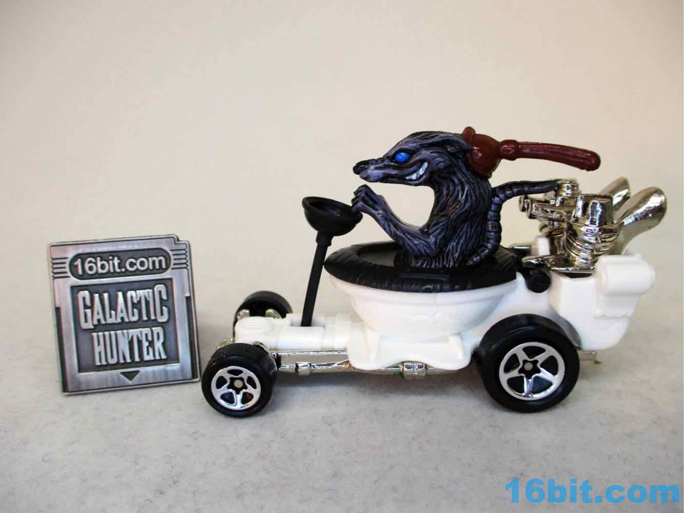 The figure is cartoony without being gross, complete with a long rat face and a longer, painted plunger as a hat. The gray molded figure has blue eyes, white teeth, a mostly unpainted tail, and some black paint rubbed in his grooves to bring out detail. He can also stand on his own. What's remarkable is that you're unlikely to see this level of paint on pack-in figural elements today, and even in the 1990s this is pretty amazing. Most toys with slug figures had sidekicks that were completely unpainted - which probably accounts for the higher price point. These were around $5, when a single car was around $1. It's not a good deal, but just look at it. Does it matter?