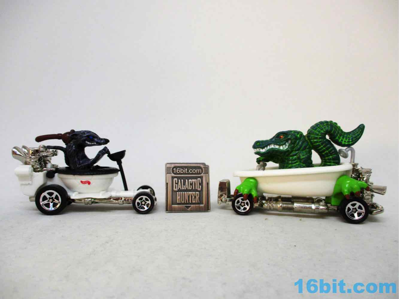 This set makes no sense, yet makes total sense. Action Pack sets were usually based on licensed properties or real-world situations (and people!) which makes it seem silly, but it also fills a void in the line. Mattel never made Rat Fink cars with figures. The famous mascot character, somehow, never got produced as a Mattel Hot Wheels toy - so now you've got a rat, with a plunger on his head, driving a toilet car next to an alligator zooming along on a sizable tub toy.