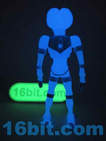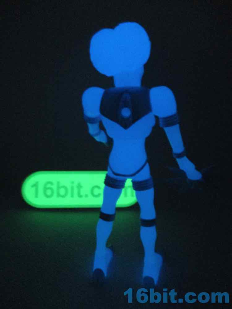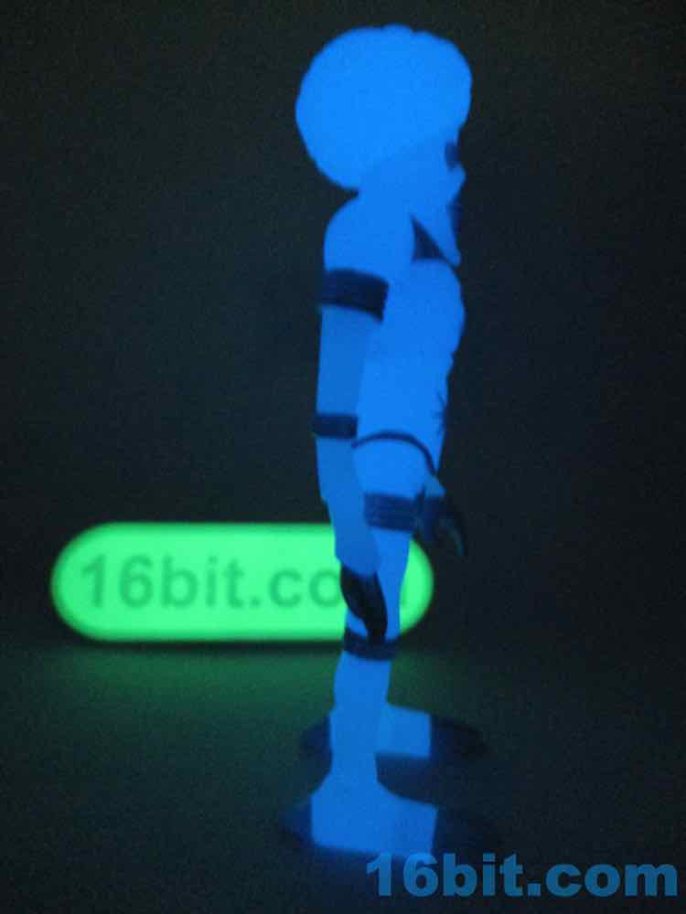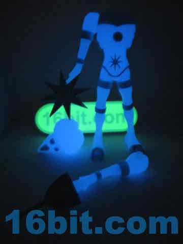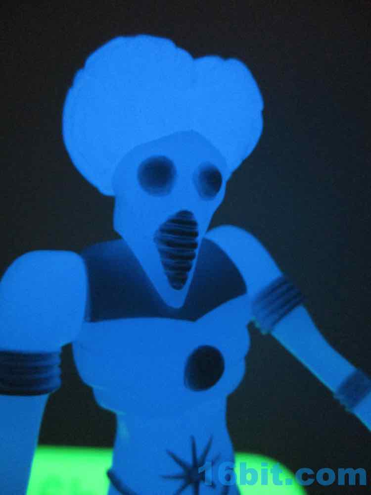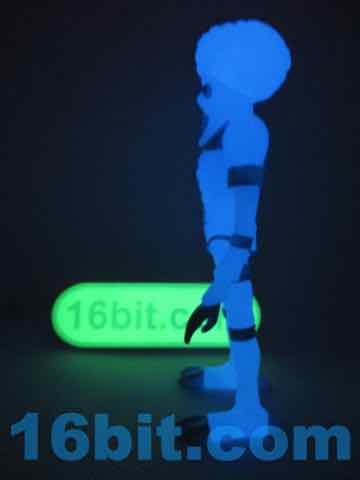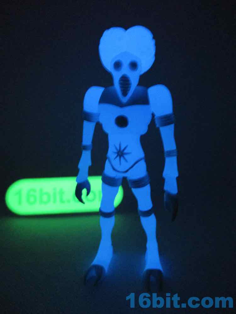 Sculpted detail is era-appropriate, with some nice deep grooves for the joints and brain matter. The belly has a nice star design on it, and the claws look cool. His hand can grip his painted accessories nicely, but his hip articulation is slightly hindered by his torso. Most of these figures have joints that swing forward all the way, but he can only go most of the way. You can still get him in a number of 3 3/4-inch vehicles, but this is probably all moot since you likely will buy it and forget to open it, or open it and put it on a shelf of other glowing toys, never to be played with.