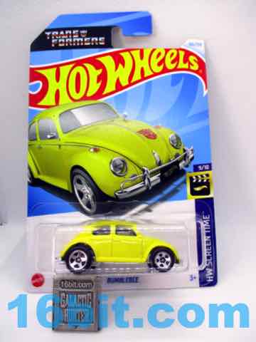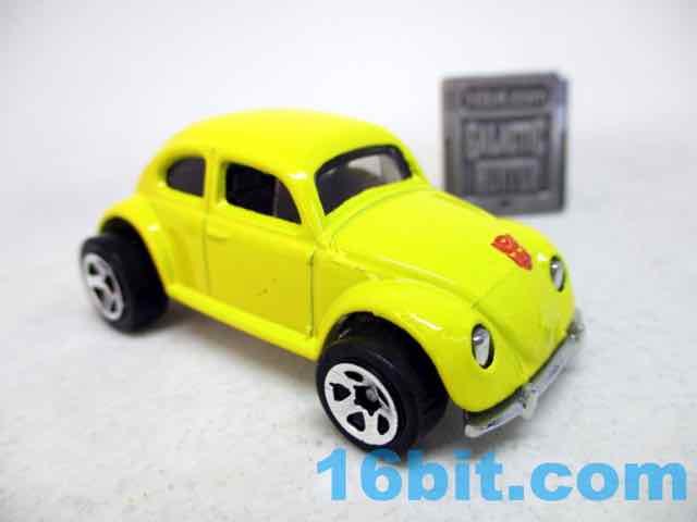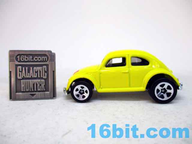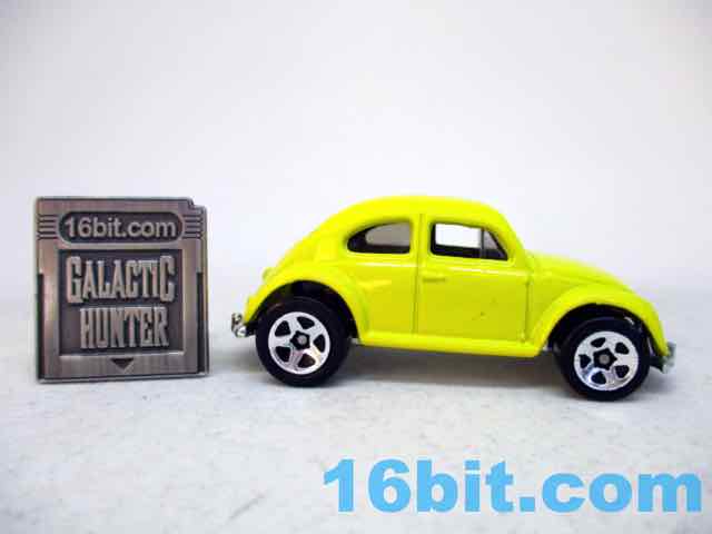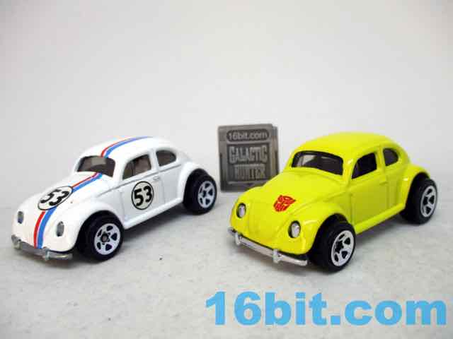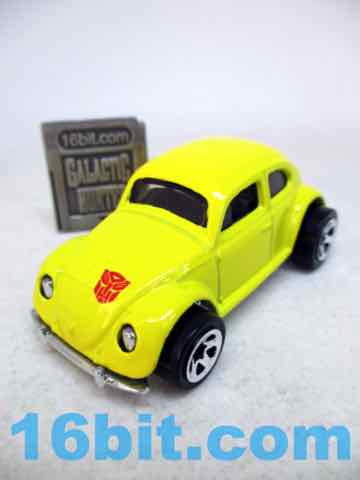 The car itself boasts two licenses - Hasbro and Volkswagen - and does a fine job of applying the famous yellow paint job and one Autobot symbol to one of the most well-known characters from the popular robots in disguise franchise. (Who, for some reason, was completely ignored as a transforming toy character for just over ten years.) A toy like this will most likely sell to literally anyone who encounters it and is familiar with the character - I always wanted a plain yellow Bug and never saw one, but the reason I wanted it was because I wanted to pretend it was Bumblebee. And here is Bumblebee actual, at one or two per case, for a buck and a quarter. The sculpting may not be a perfect match for the cartoon, and it probably shouldn't be - it's a clever reuse of mostly existing parts, with nice rolling wheels and shiny paint. It doesn't do anything that a Hot Wheels or Matchbox car hasn't done for the past seven decades, but it will cause fans to run around hunting him for months (or years) to come just because it's the perfect mix of license, character, product, and price point.
