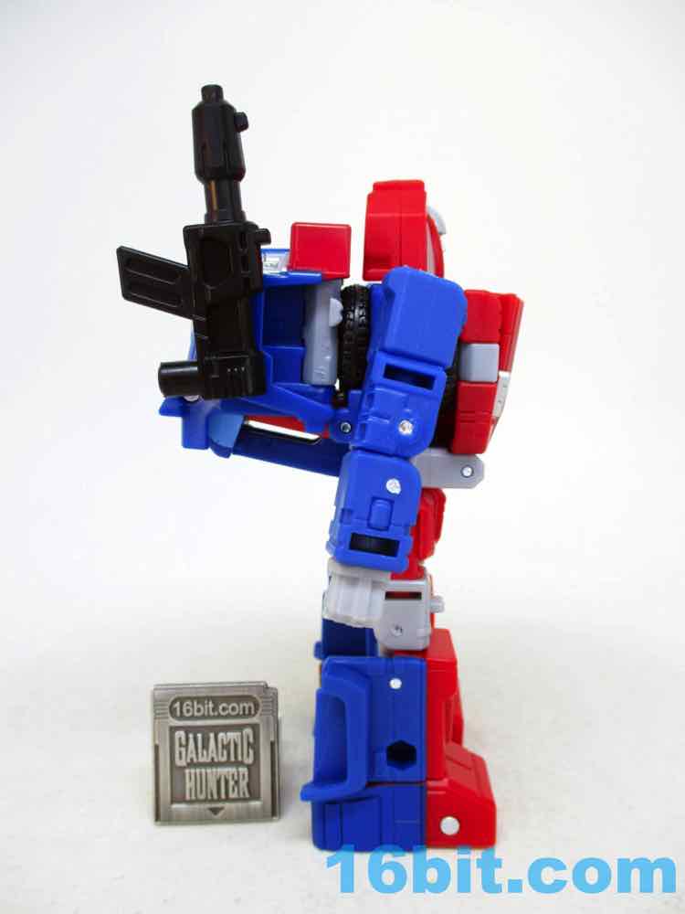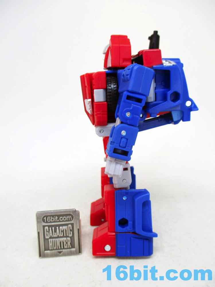 Complete with painted windows, this is a nice, sturdy truck with painted headlights, a red bumper, some junk in the trunk bed, and a perfectly nice blaster. The wheels roll, but not terribly well, and it's a vehicle with a lot of visible panels and 5mm holes. I wouldn't say it's amazing, but it's very good and you can mount stuff to it. A great robot usually means a vehicle has to make compromises, and this one is mostly excellent. Those arms and legs have to go somewhere, and most of the parts all fit together pretty well.