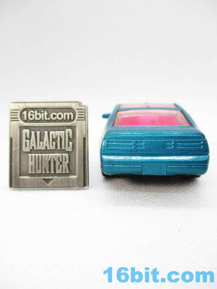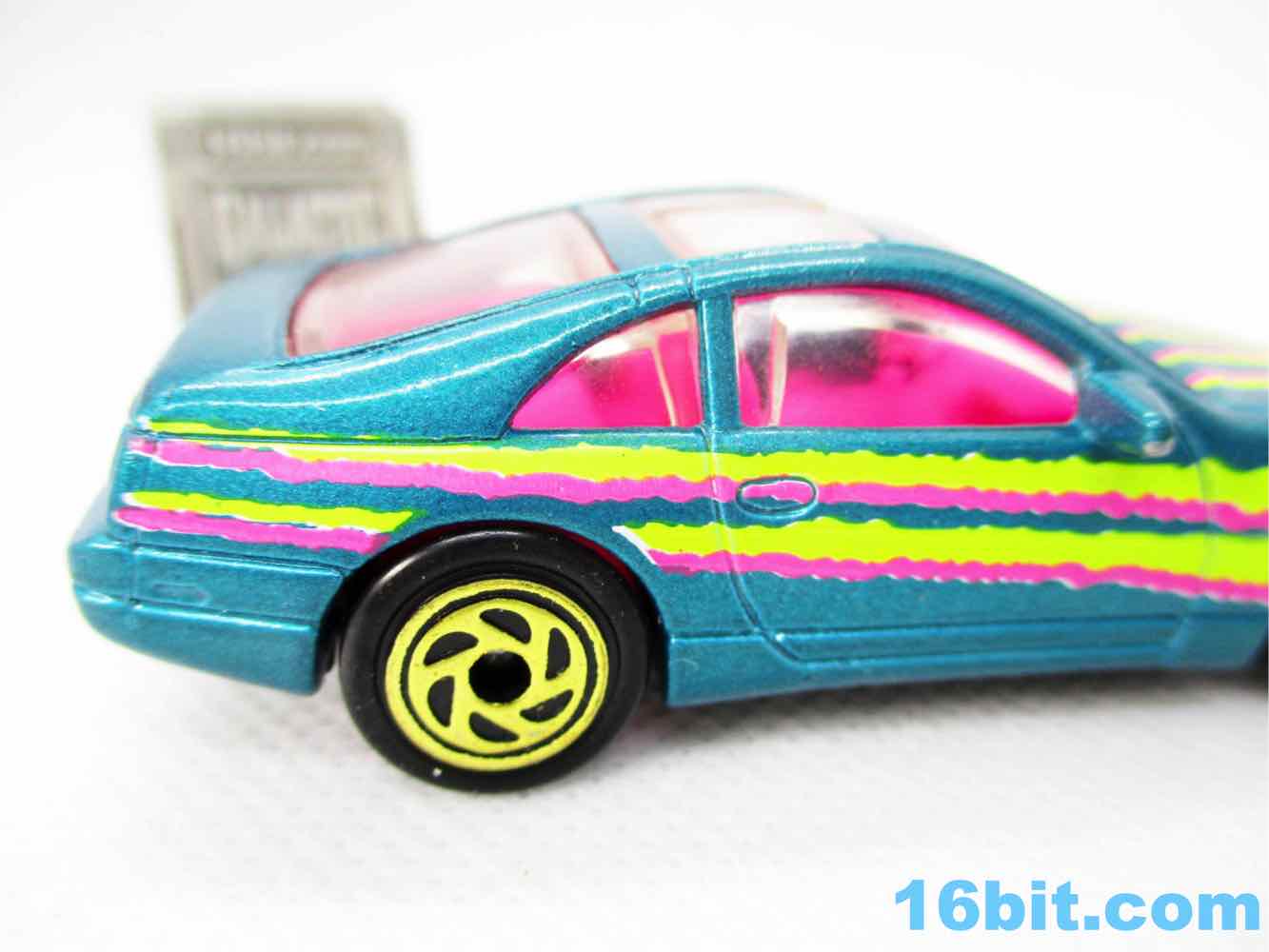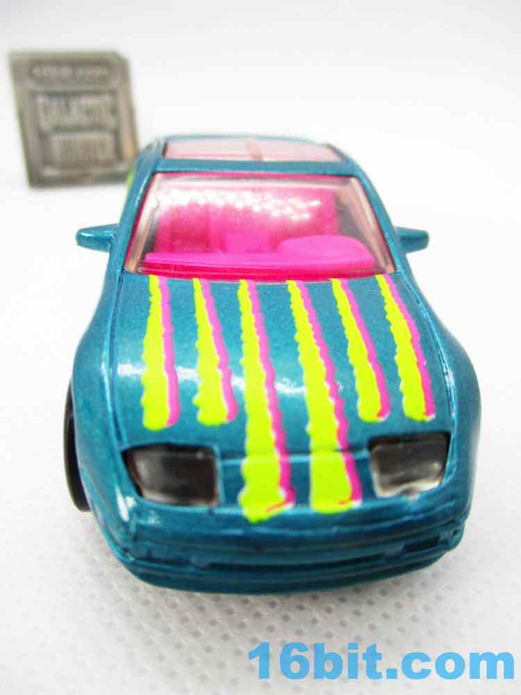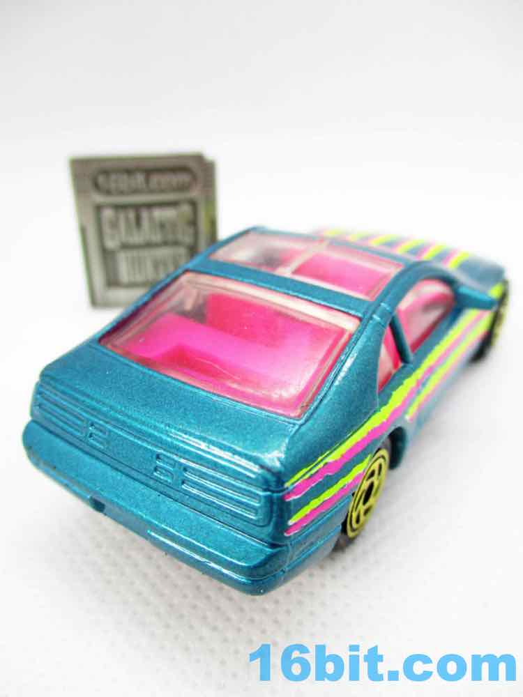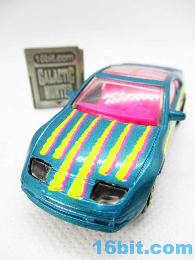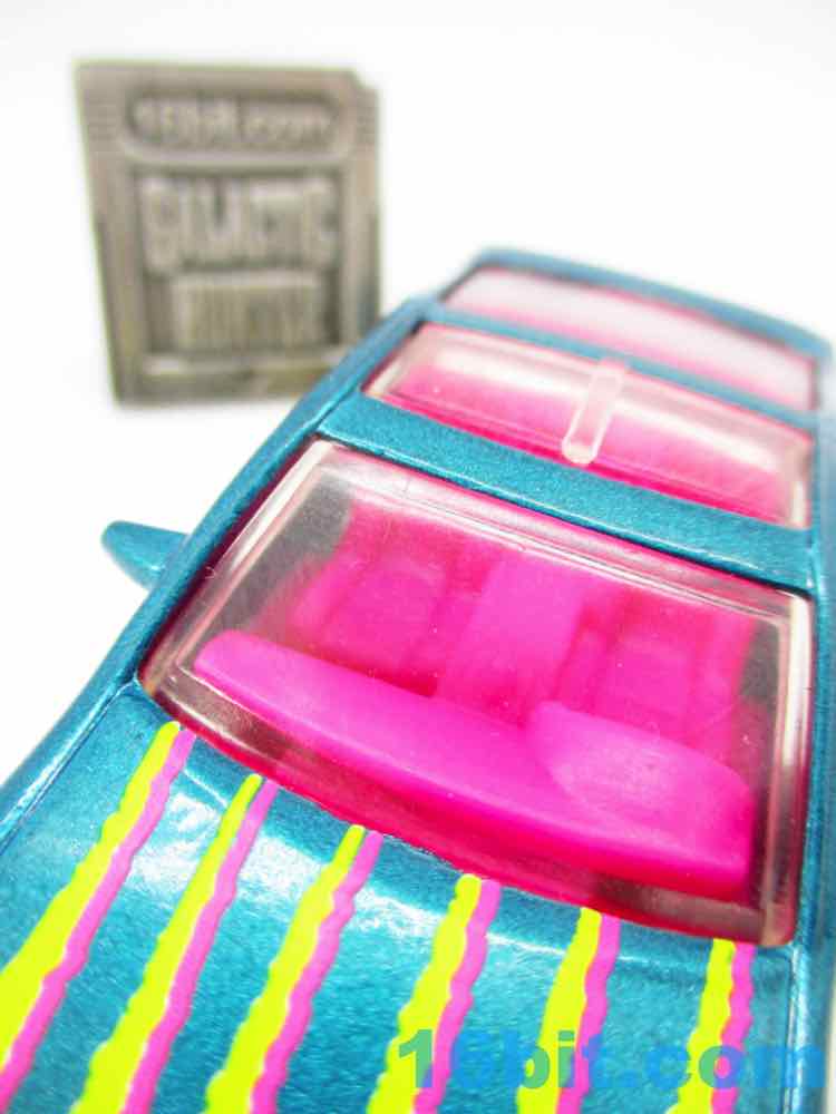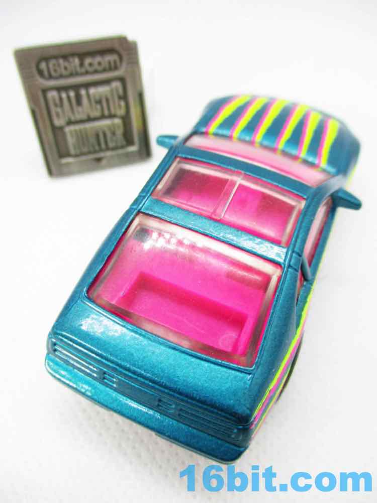 In the 1990s we saw both Hot Wheels and Matchbox transition to less metal and more plastic in their toy cars. The base of this one is black plastic with a metal chassis and nifty gold wheels. It has rear view mirrors, a place for a license plate, clear headlights, and some genuinely 1990s deco. For fans of the Jazz Dixie Cup, this should stand out as being a loud, wildly colored design that would probably make for a great t-shirt. It has a sun roof looks surprisingly good (as in, not faded) for a car of its age.