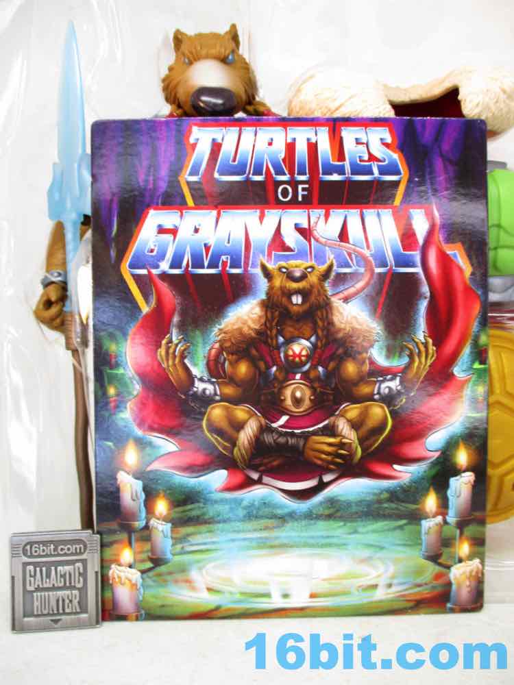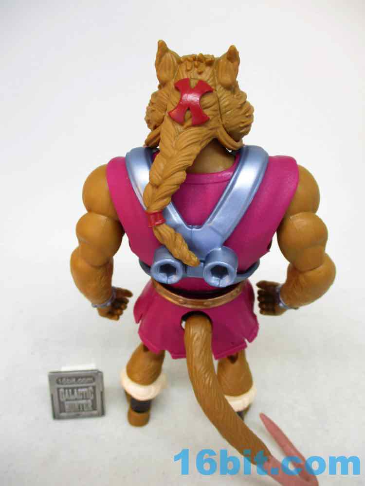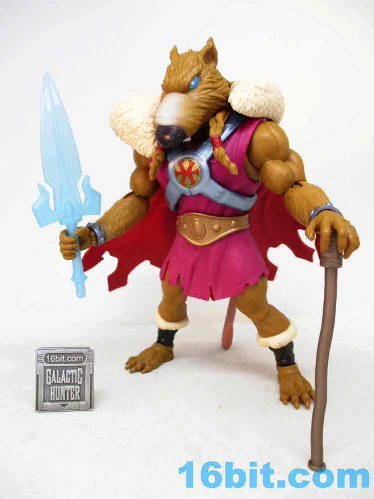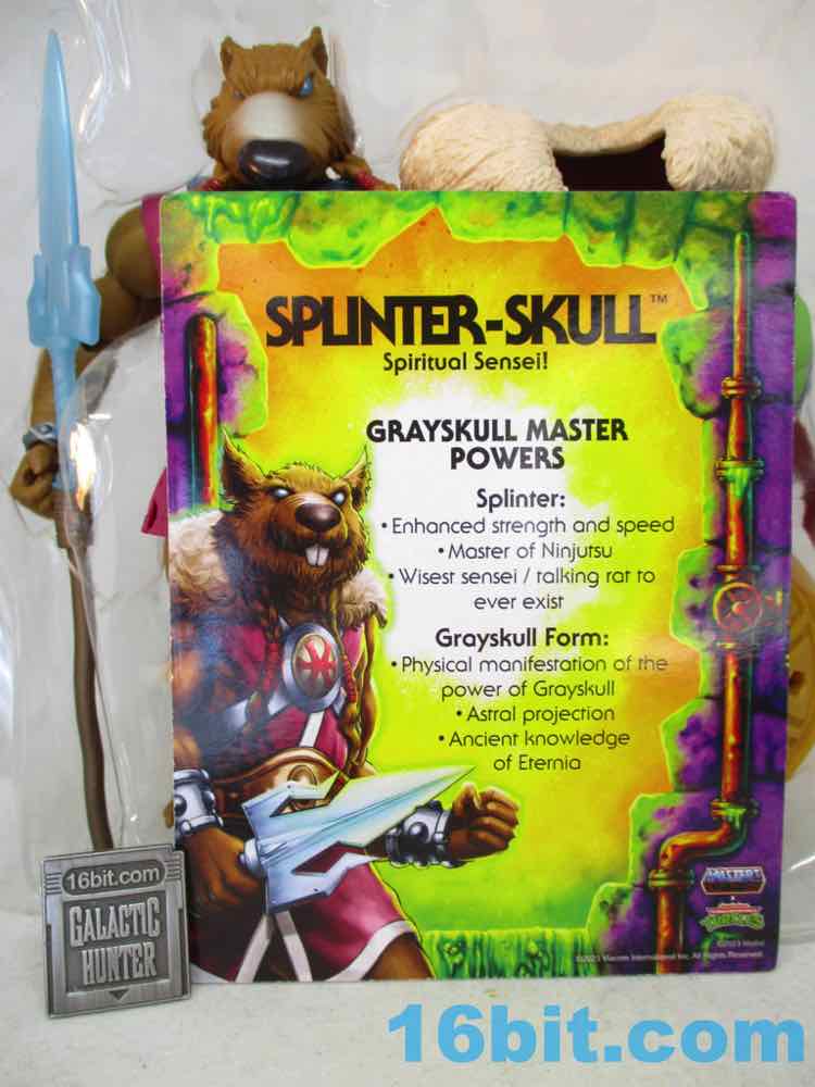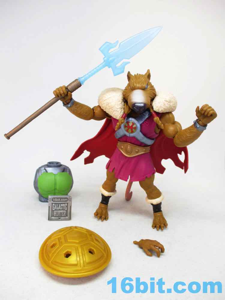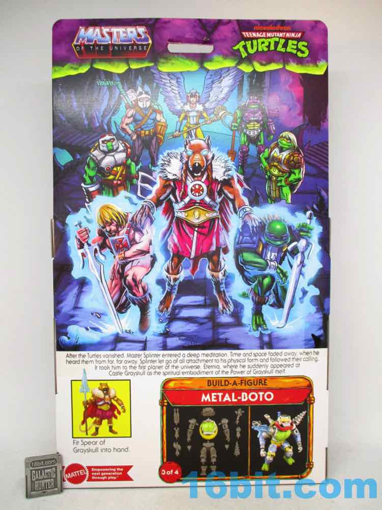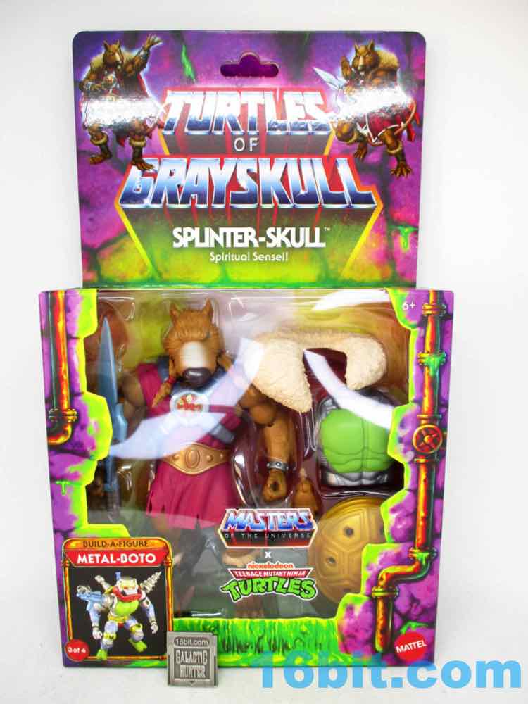 I'm surprised Splinter-Skull, a Target-exclusive mash-up of Splinter and King Grayskull, didn't recycle more parts. The vessel that brings you Metal-Boto's torso and shell comes with a pretty good whole figure in its own right, which has a plastic furry cape and a clear blue sword that greatly resemble - but are not - the same accessories with Eternia's former warrior king. I assume kitbashers will enjoy buying this figure to steal his parts to customize one, if they missed it. (King Grayskull from Eternia presently closes for $140 or more on the Bay of E.)