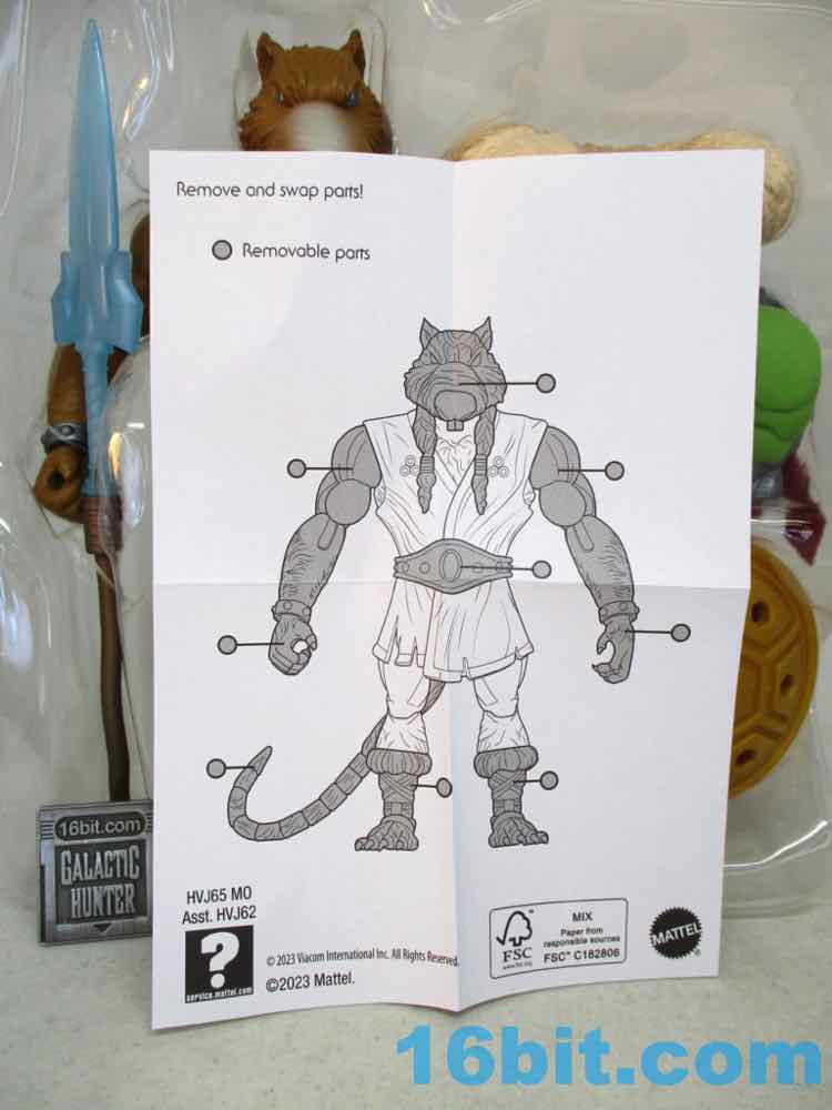 Splinter has been working out. The original Teenage Mutant Ninja Turtles toys were heavily influenced by Masters of the Universe and their toy designers, but Splinter looked more or less normal. And by normal, I mean as a man-sized mutated man-rat, his arms weren't huge - this 2024 Mattel version has buff arms, hairy forearms, and furry rat feet that give him a distinctly different look. I dare say the buff arms are a step too far, but it's a silly line, and this is a very silly figure. He has King Grayskull's braids and ornamentation, complete with the 200X-style "H" on his chest and hair. The outfit looks great, and the tattered cape actually looks really great. I hope it holds up - but if it cracks, one pre-cracked pointy accent will just help give it even more character. It hangs nicely, just clipping around his neck with plastic "fur."
