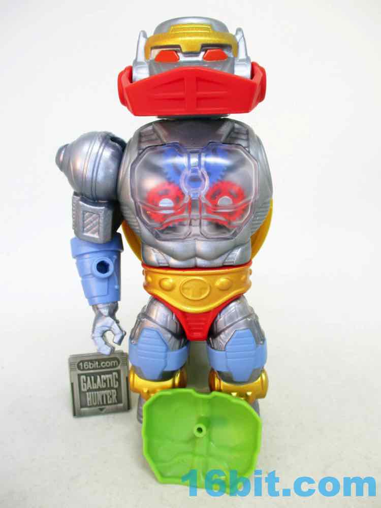 Another chunk of Metal-Boto, a mash-up of Roboto and Metalhead, is included - but Mattel continues to vex fans by not including feet, so he can't stand up yet. You get a torso with a geared gimmick which allows his jaw (included with Mouse-Jaw [FOTD #2,677]) to jabber when he rotates. That's cool! The green chest plate is removable so you can see the clear gears inside... and if it cracks or yellows with age, you can just cover it up. Now that we have this part, we can plug in the included shell, the lower torso and thighs from Sla'ker, and of course the arm from Mouse-Jaw. We're still missing the feet and other arm, which will probably come with 2-Bopsteady this October.