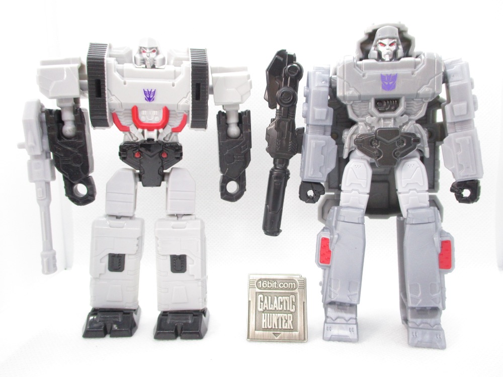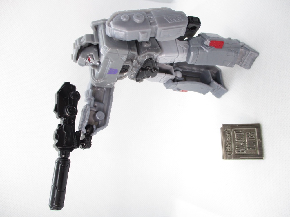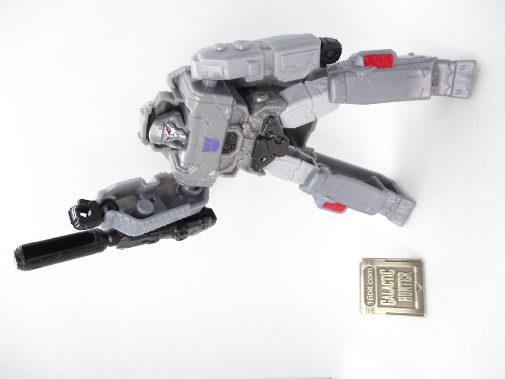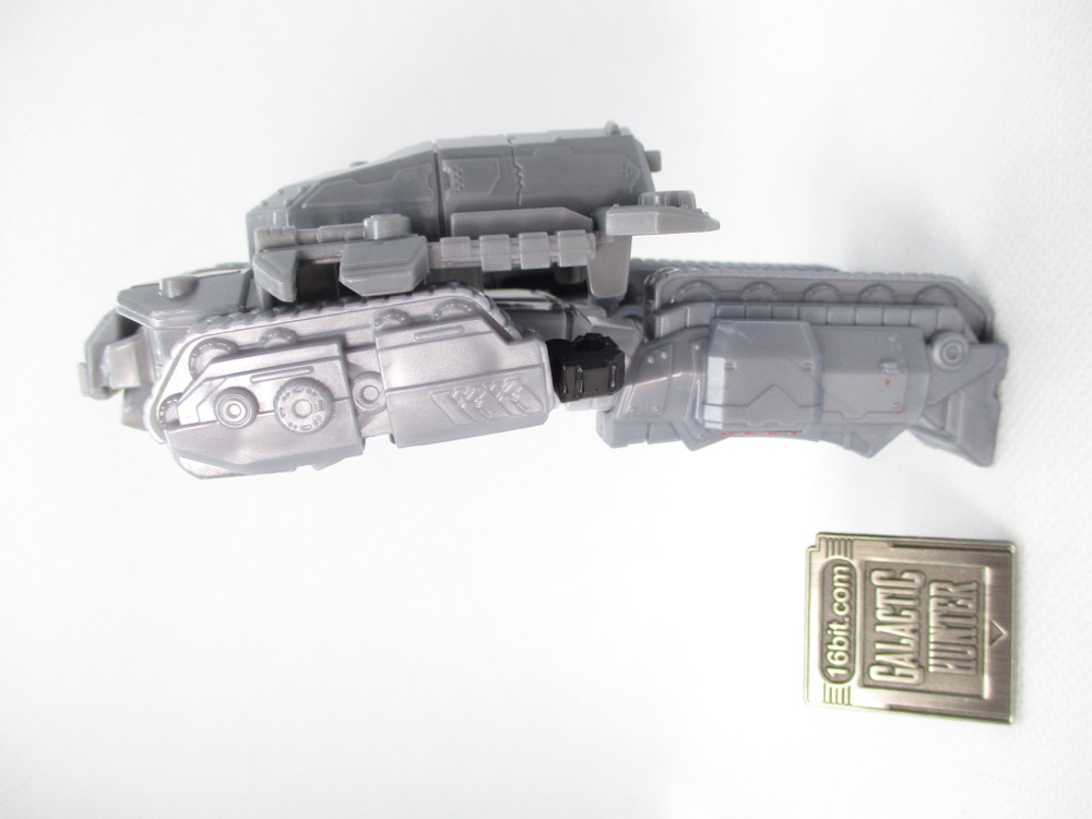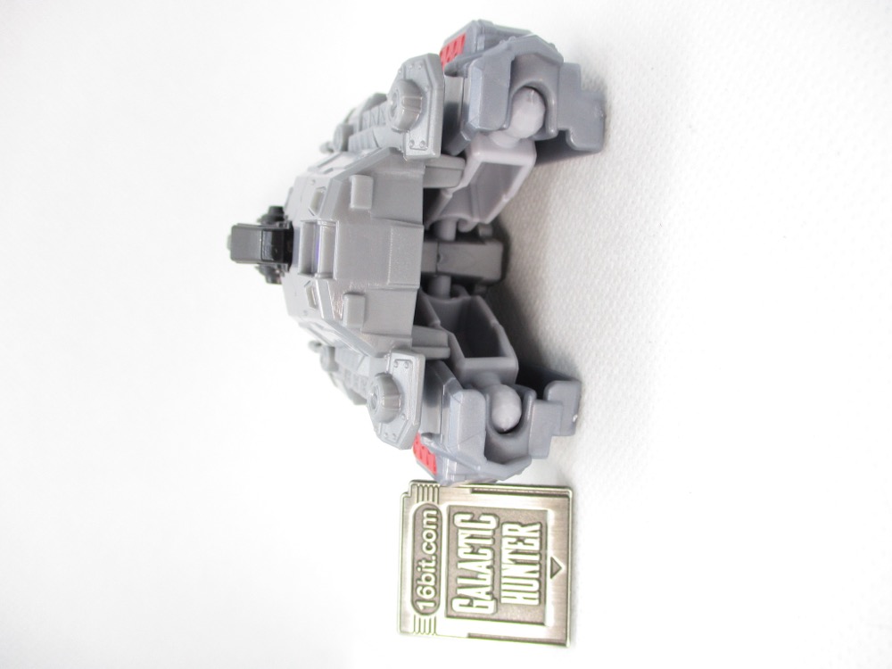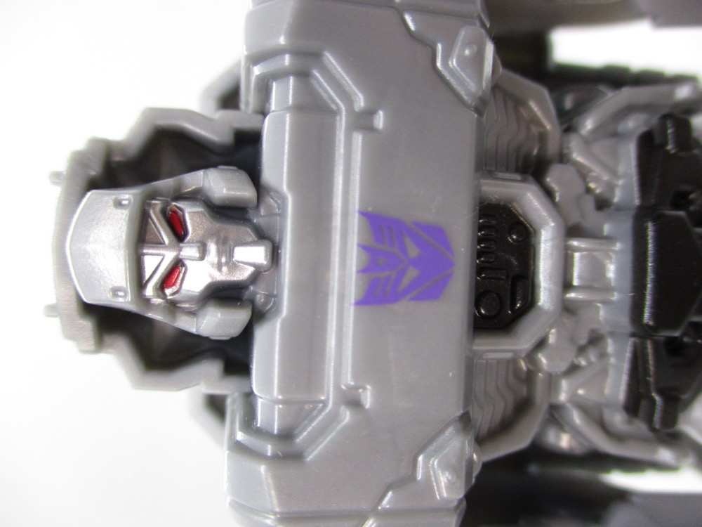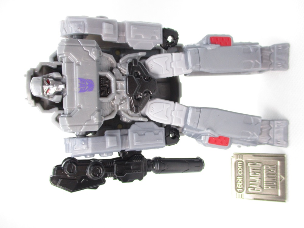 He stands a hair over 4-inches tall, with a silver painted face with red eyes. Most elements of the toy are molded in color, but his crotch, chest, and the red launchers on his shins are highlighted in red. The varying black and gray plastic colors look good - it makes the previous Megatron look pale by comparison.