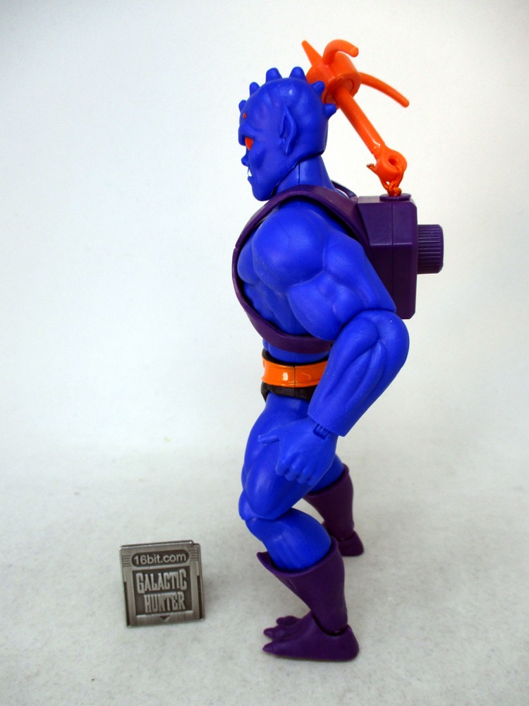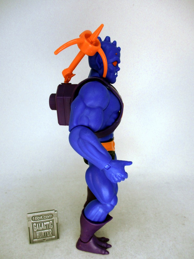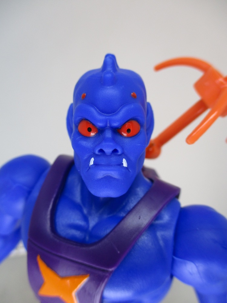He looks a lot like the cartoon, with a less freakish face and a more subdued mouth with a couple of big fangs and two big bright red eyes. The bald head, pointy ears, and ridged forehead look like any of a number of humanoid creatures or aliens from the 1960s-1980s, making this fellow and the whole line look a little old-hat to their contemporary creatures. He doesn't look too far off from various Bronze Age comic aliens or villains, whereas a few pegs over might have had clearance Alien toys, Admiral Ackbar, or other then-modern designs. It's old hat today and it was almost a throwback when he was new, but that's OK - as kids, everything was new to us.