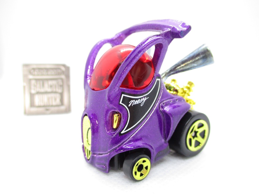 The buggy has a nice metallic purple with sparkles in it, plus some racing stuff - there's a white Hot Wheels logo on the right side as well as orange checkers and a big #2. The left side has "Neesy" written in cursive over a black painted panel, the significance of which is unknown to me.