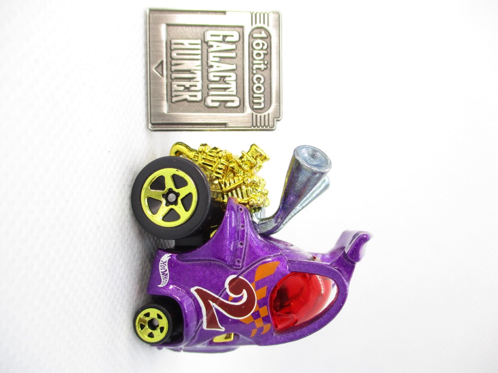 I would say "it's unusual because..." but just looking at it, everything about it is weird. Mattel was trying a lot of new stuff in the early 2000s and as a result we got some pretty ridiculous designs - nothing as awesome as the Speed Demons of the 1980s, but still, charming. Thanks to overproduction and speculation in the market, hundreds of thousands of worthless cars can be had for a dollar or two. This one cost me $2.54, and despite being half the length of a normal car, I'd say it's worth it for something over two decades old. The gold engine and headlights look great, and the gold... er... deflector dish on the front is pretty solid. The design choices really make it light up in a dark room, and you can see vestiges of the chrome shine through the clear red windows too. There's even a bicycle seat in there.