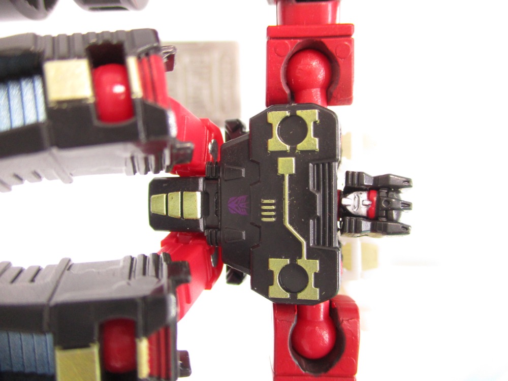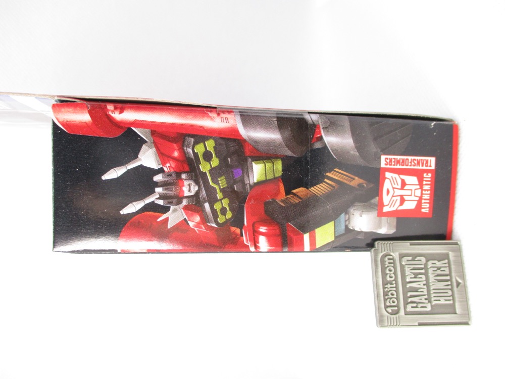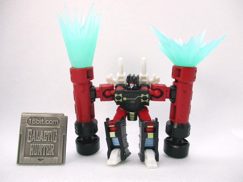 As a robot figure, he's basically the same as Rumble but red and black, with light gray bits. The original toy had blasters that were vac-metal silver and feet that were die-cast metal. This one just casts everything in a light gray that doesn't quite match, but the rest of the toy gets the job done with some nice gold chest paint and tiny gold shins that do a good job of replicating the delicate foil stickers from 1984. The face is very small, but determined, with red optics and a cranky silver face. He also has a number of ball joints, allowing him to assume all kinds of action poses while making use of his accessories. Given the limitations Hasbro had on price point and the size to maintain Soundwave compatibility, this is arguably a perfect robot.