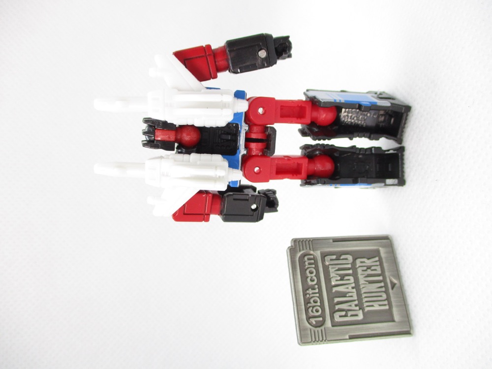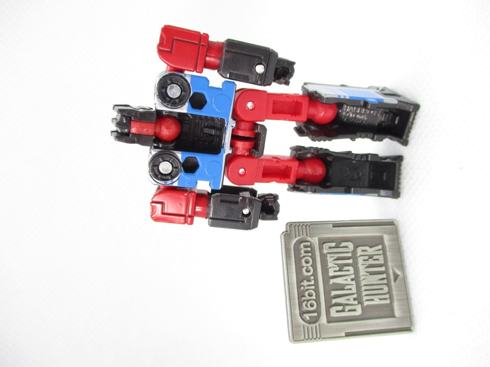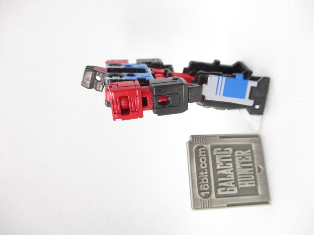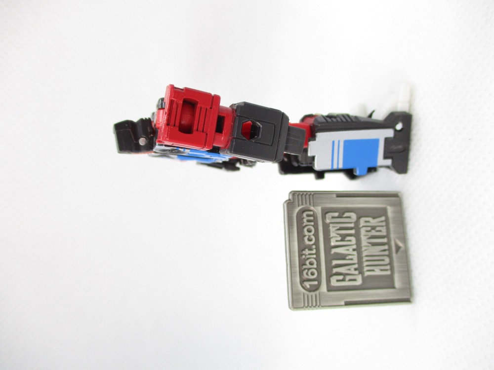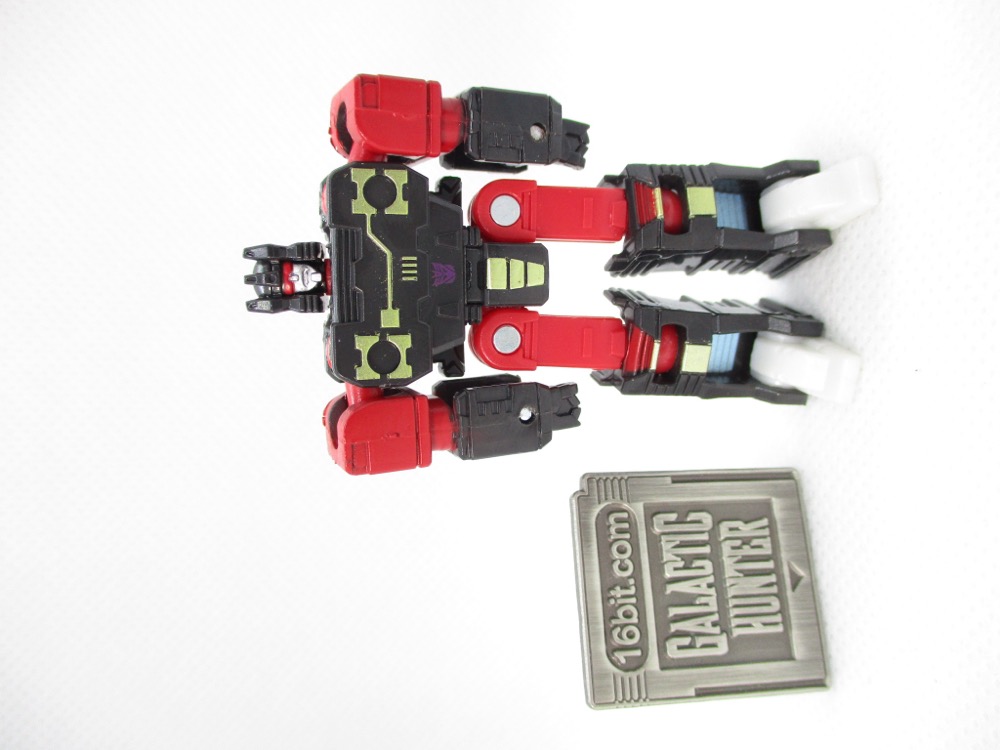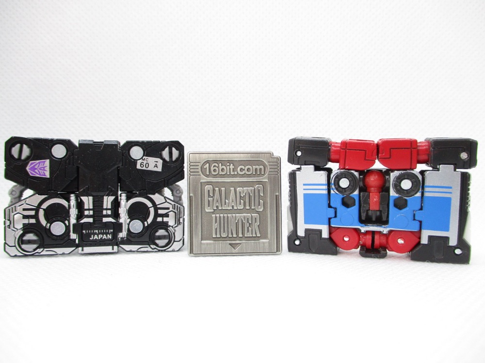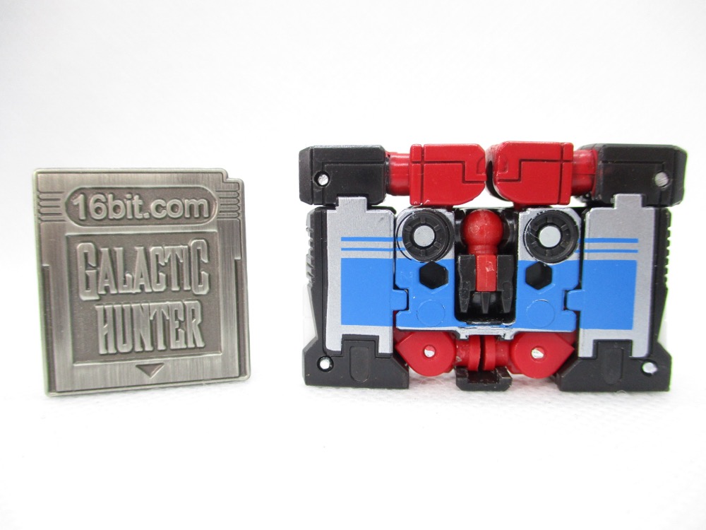 The transformation is easy enough, with the legs and arms wadding up to make a perfectly nice cassette. They do a good job with some printed details on the flip side, giving us something that's not entirely unlike the original toy's stickers. It's not far off from the cartoon, and since it's on the back of a toy you're unlikely to ever transform after purchase, it is arguably a corner worthy of cutting when it comes to deco.
