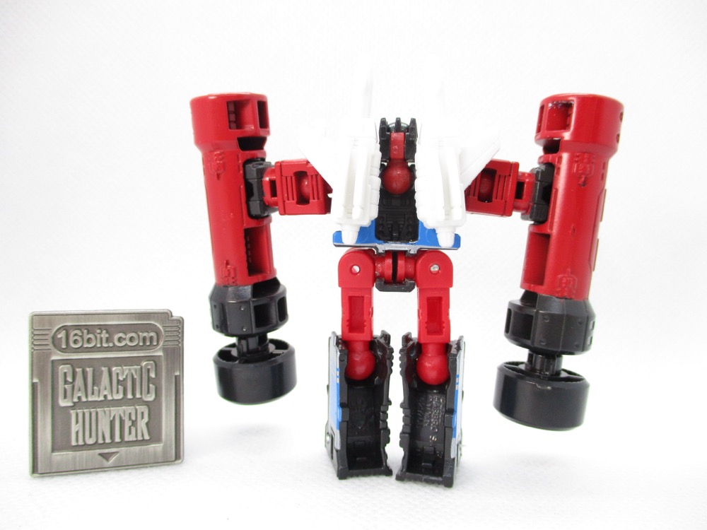His accessories are fine. The blasters are the same as Rumble's, light gray, and I wouldn't have minded them being in a darker color. They it in his back nicely, and there are tiny holes in the back of his forearms to plug them in too. They get the job done, I would love vac-metal ones though.