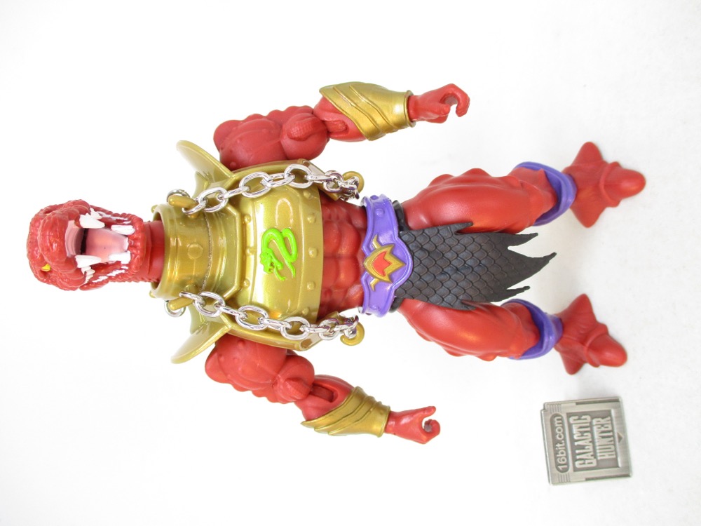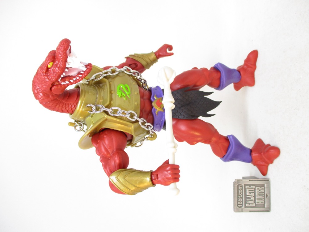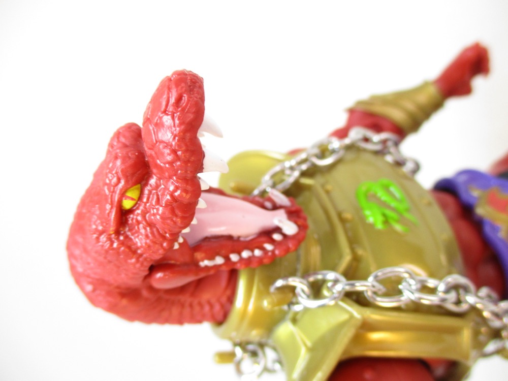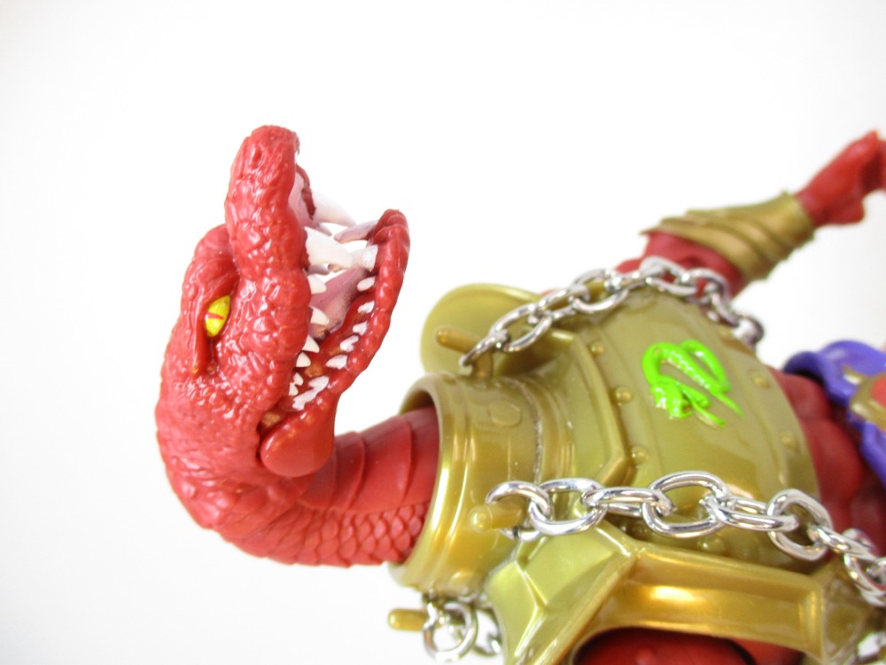 As always, a lot of this figure has recycled elements to help keep costs down (and figures consistent.) But the important thing is you get a new multi-part head and new armor! The neck is one piece, and a head is on top of that with a moving jaw. These parts have scaly skin, and since the body is separated by the armor, the sculpting difference between it and the typical smooth (or lumpy) skin isn't as obvious. The colors match, and it looks like it belongs. The opening jaw works well, the mouth interior is painted nicely, and I love the snaky expression on his face. It feels like an actual old toy, as if a lost 1988 toy existed where you push a button on his back and the head lunges forward while the jaw snaps. It should be noted the toy cannot actually do this, because someone decided collectors don't like fun play features. These people are wrong - I would love if it did more than just be posed and look cool. But it does look cool.