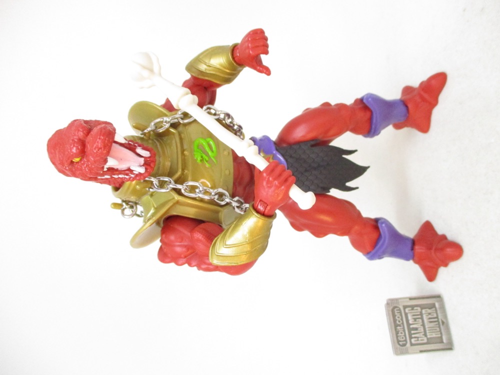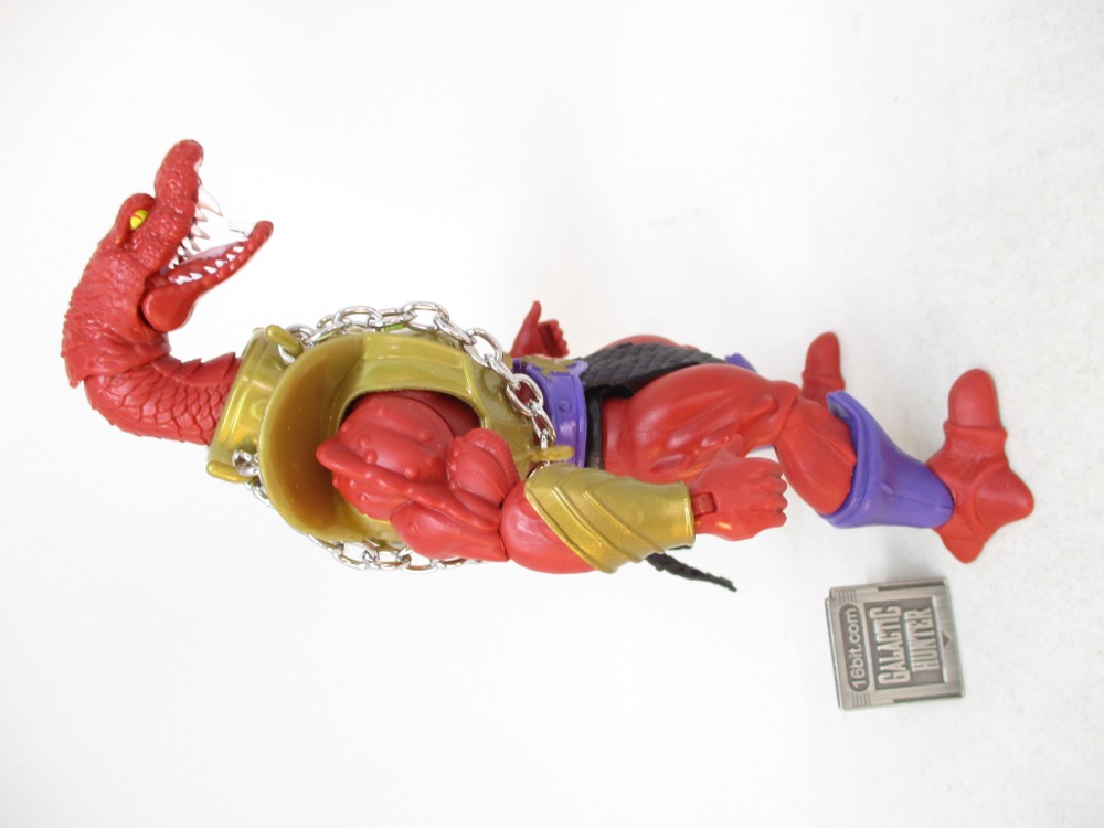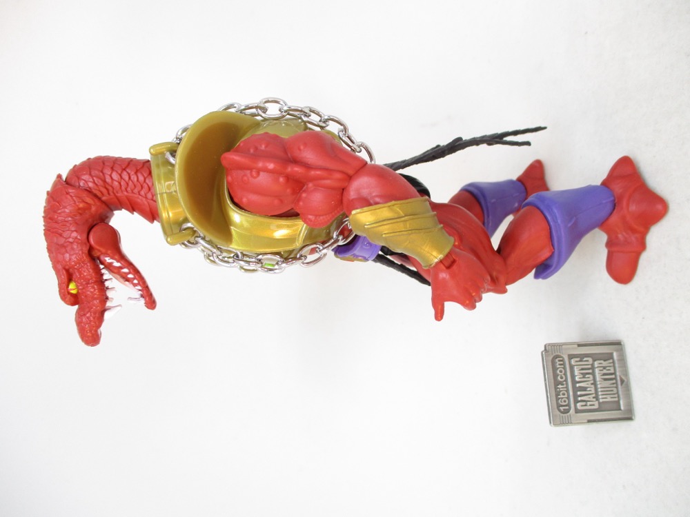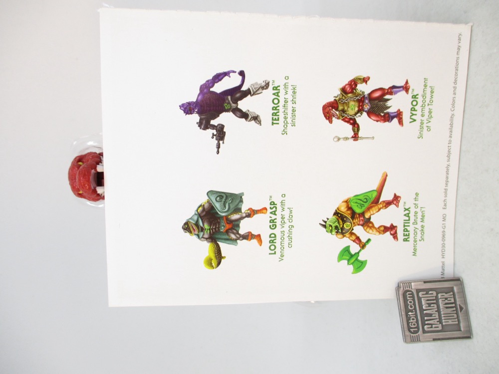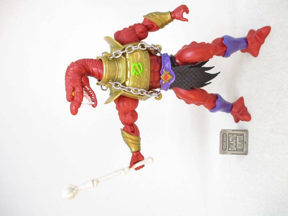 As always, a lot of this figure has recycled elements to help keep costs down (and figures consistent.) But the important thing is you get a new multi-part head and new armor! The neck is one piece, and a head is on top of that with a moving jaw. These parts have scaly skin, and since the body is separated by the armor, the sculpting difference between it and the typical smooth (or lumpy) skin isn't as obvious. The colors match, and it looks like it belongs. The opening jaw works well, the mouth interior is painted nicely, and I love the snaky expression on his face. It feels like an actual old toy, as if a lost 1988 toy existed where you push a button on his back and the head lunges forward while the jaw snaps. It should be noted the toy cannot actually do this, because someone decided collectors don't like fun play features. These people are wrong - I would love if it did more than just be posed and look cool. But it does look cool.