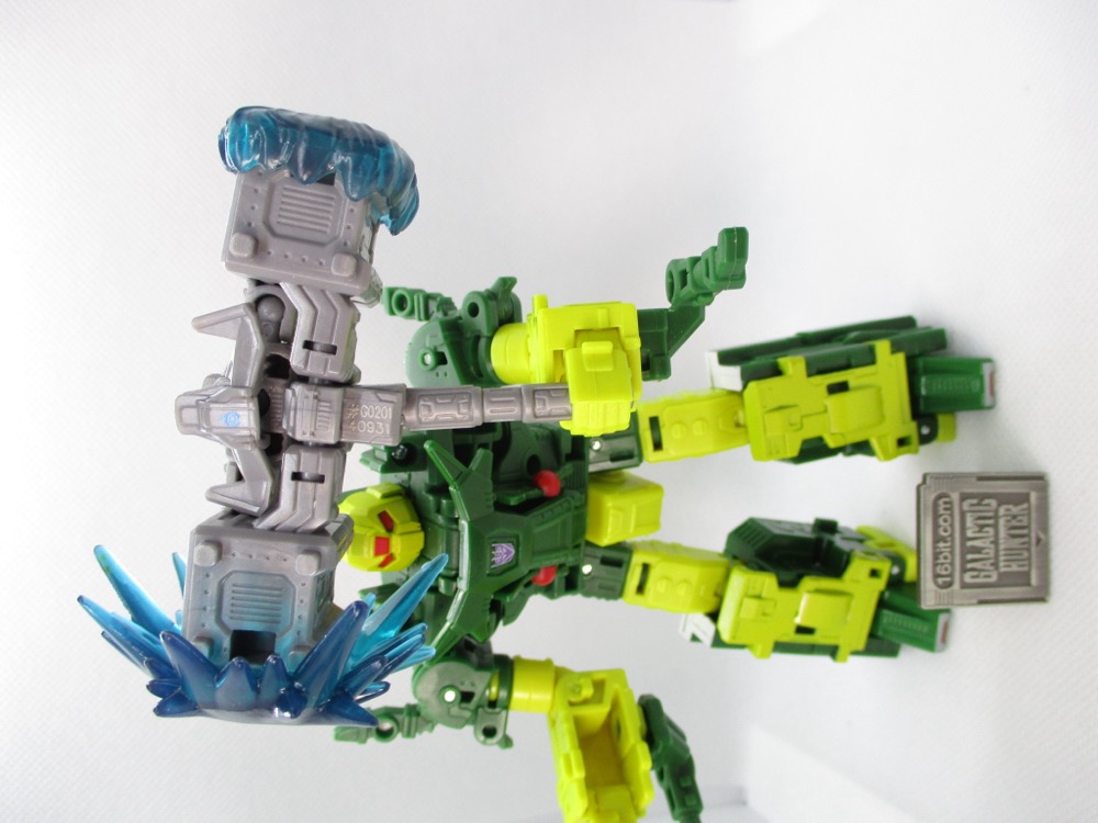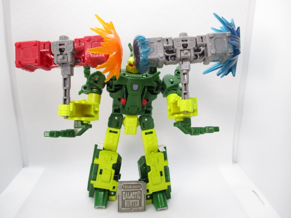 It's a fun hammer, it's a cute robot, and it has two blast effects - one of which is new here. The big blast effect was here last time, but a smaller cap - a toupee, if you will - is new here. Also of interest, the colors match 2024 Vector Prime's sword and wings. It's a nice extra, but it also costs you a few bucks extra. Had they left it out, I doubt you would miss it but the story is he got kidnapped in a raid, and if there are more new Wreckers coming presumably you can put him back with them.