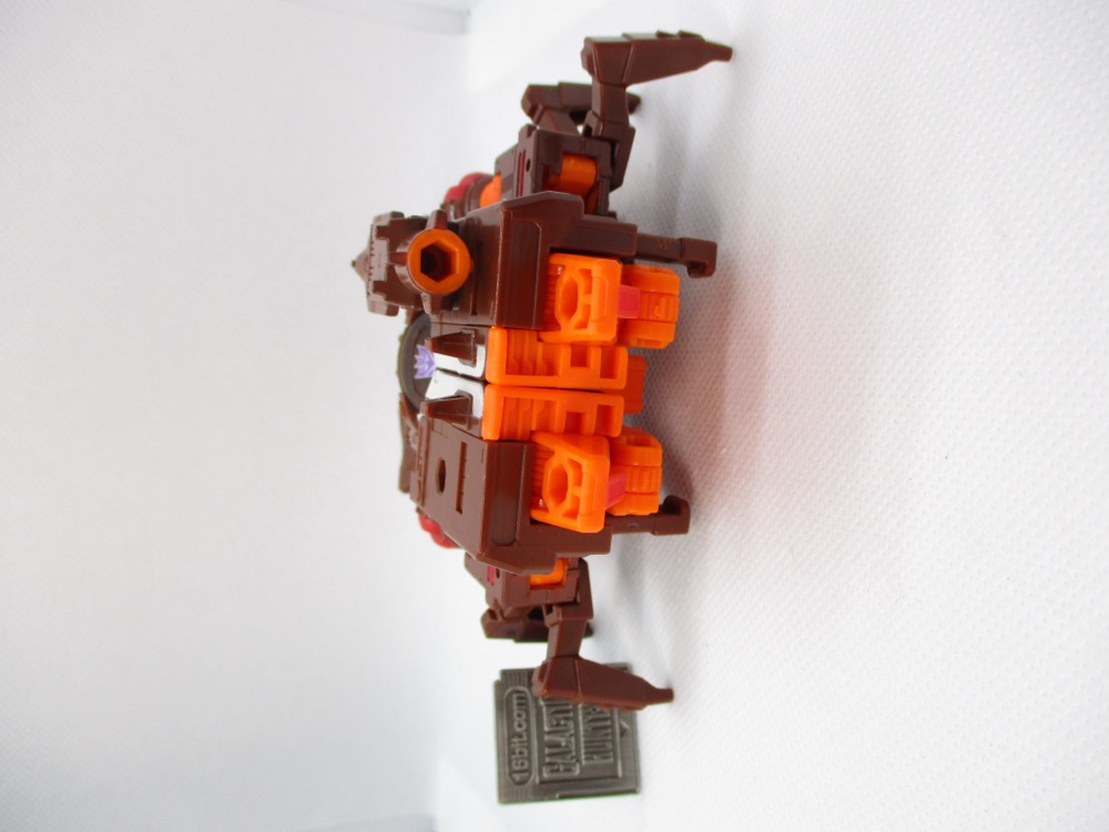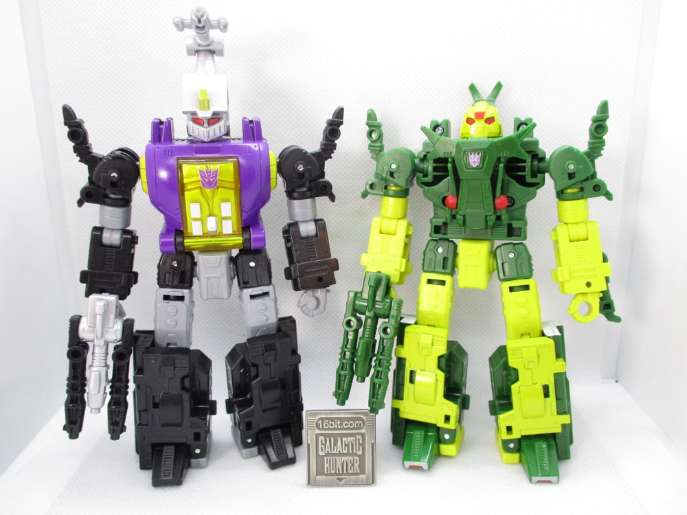 Finishing up the set is Chop Shop, a fellow we've had a few times in tiny sizes. One was a tiny Micromaster sidekick for Megatron, another was a retool of Shrapnel - just like this one. The figure has minimal changes, but they're sensible ones with a new set of mandibles, 2 new blasters, a new head, and extra add-on legs. It's a relatively simple fix, but with that and paint you get a figure that seems almost entirely new - and he keeps a redeco of Shrapnel's blaster, too. You can give that to someone else if you need, or store it on his back. It would be nice to have the trident, but two blasters are no slouch either. I'd say "maybe next time" but I'm decreasingly confident any non-TV show character will get multiple toys, and the Deluxe Decepticons are not exactly famous faces. Speaking of faces, the new head looks more than a good bit like the old one, so kudos Hasbro.