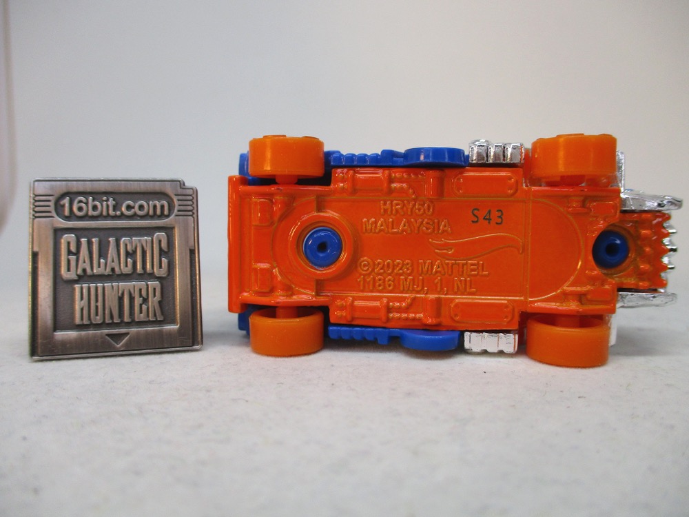 It's a more or less standard weight car, just a smidgen over 30g, meaning it isn't too heavy and it probably won't hurt somebody if it flies off of a launcher. It's a little hollow, but it doesn't look it. The interior has been filled so it won't crumble to dust due to lack of internal support. There's no cars small enough to worry about needing to carry them on board, so this should just be a goofy and sturdy toy for kids. I assume we'll see these with play-worn chrome in sacks at thrift stores over the next few years, as collectors are unlikely to hoard this one.