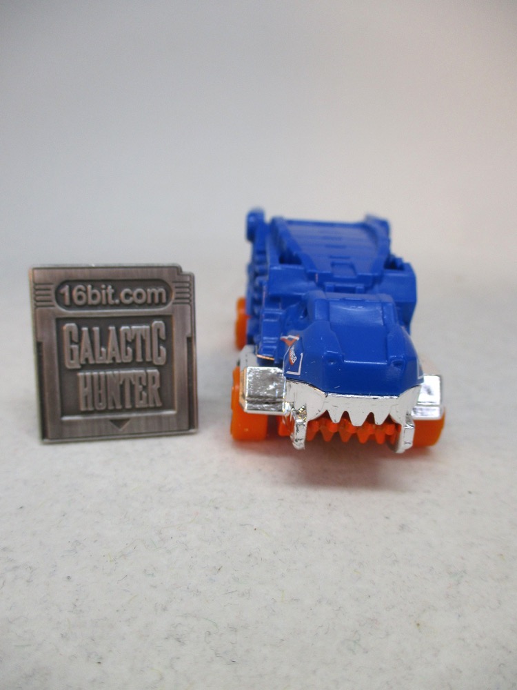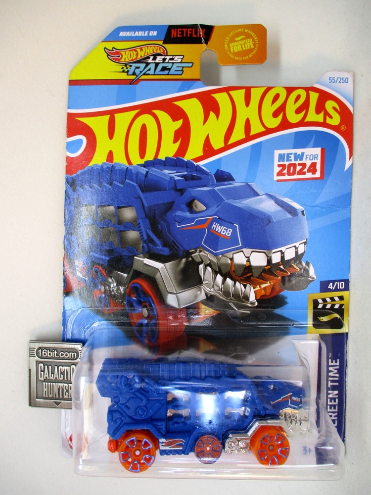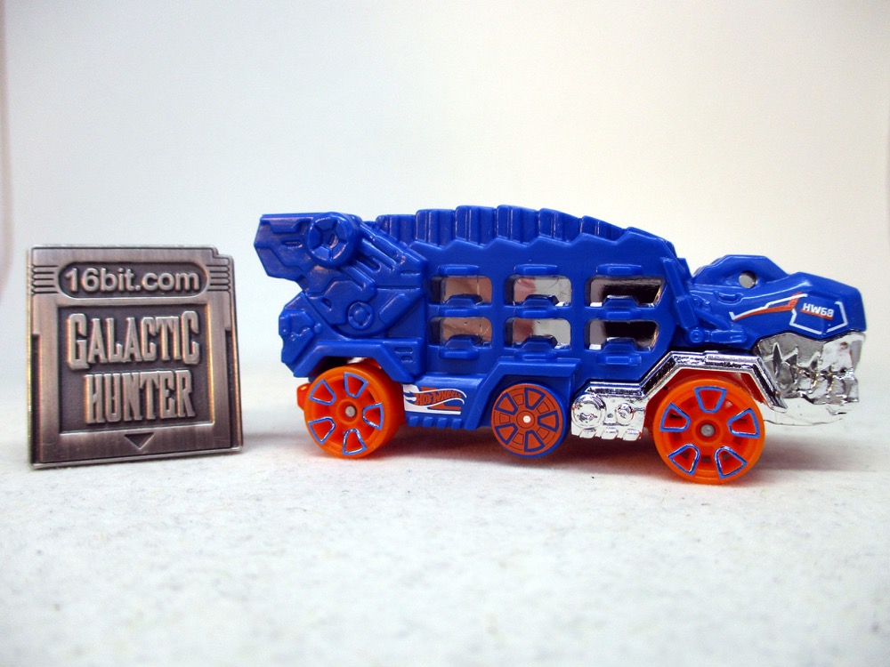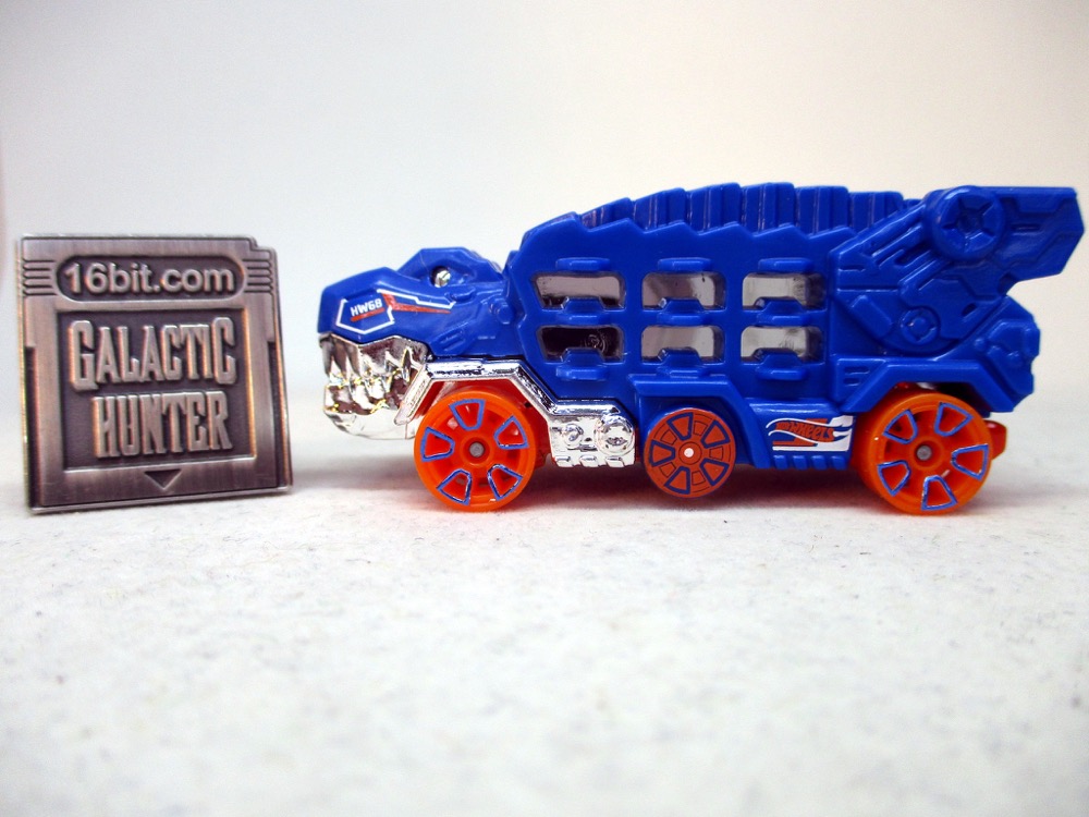 Mattel Hot Wheels HW Screen Time HW Ultimate T-Rex Transporter Blue Die-Cast Metal VehicleIt's not too uncommon for a toy company to make large and small models of a product, but the HW Ultimate T-Rex Transporter Blue was unusual. There's a $80 electronic playset that's sort of a truck and sort of a dinosaur, but at $80 it's pretty expensive for a toy line that tends to be cheap. Now it's $1.25, and available in blue or red with chrome silver chompers. I was pawing through bins and kept coming across it, and I thought "sure, why not." As a kid of the 1980s I love mechanical dinosaur toys.