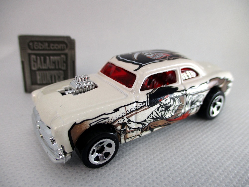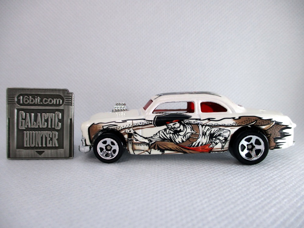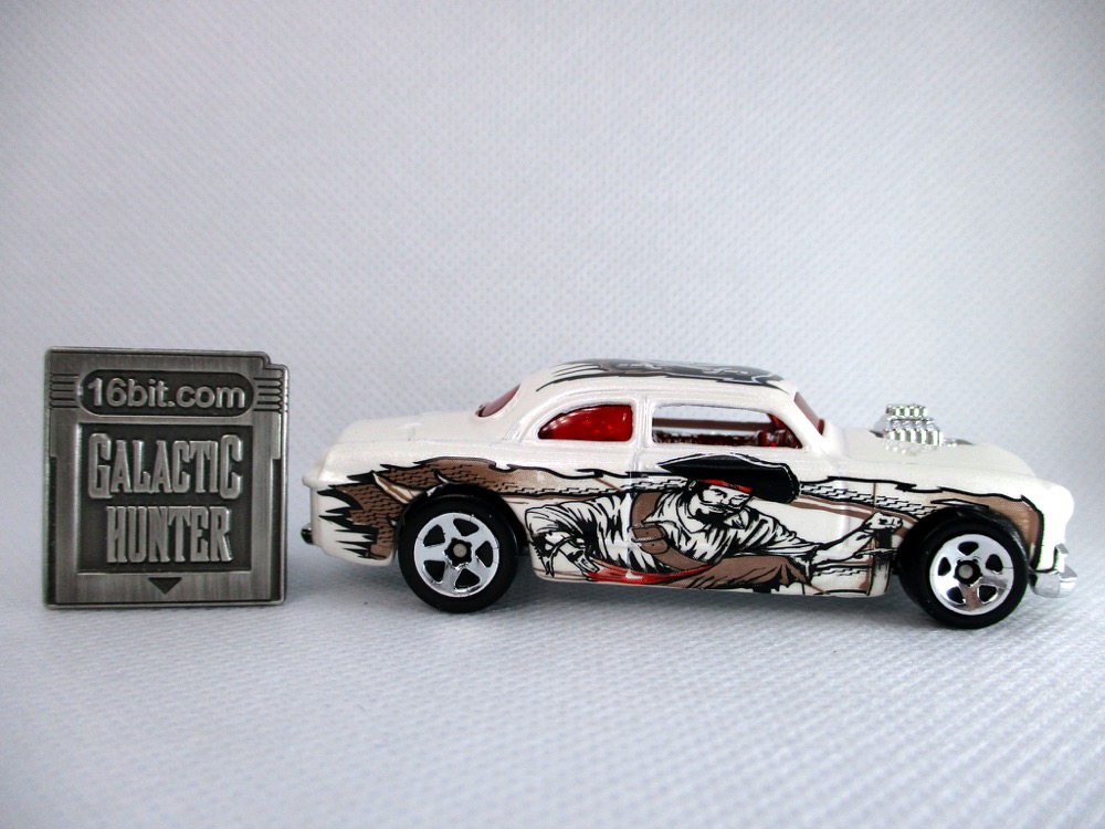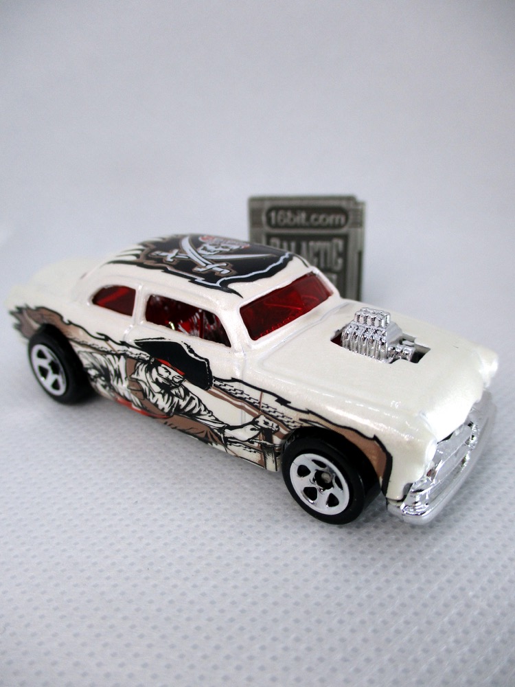 Before this pirate version the Shoe Box car first came out in 2000 as yet another cool car based more or less on the 1949 Ford Custom Club Coupe. Not coincidentally, car licensing wasn't in full swing yet - that's just before we saw Hasbro get slapped by not having a Dodge license for Side Burn in Transformers: Robots in Disguise, kicking off either licensed cars or cars being changed significantly more to avoid a lawsuit.