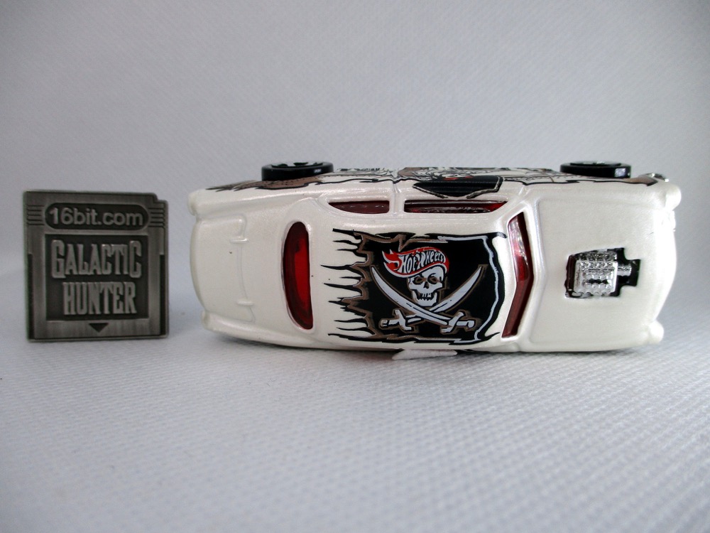 A tattered riff on the classic Jolly Roger flag has a Hot Wheels logo over the skull and crossed swords, matching the colors of the car itself. The driver and passenger windows are down, but the remaining elements are cast in red plastic.
