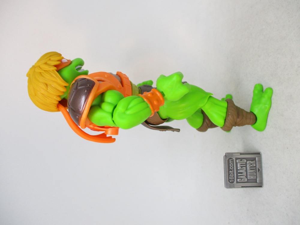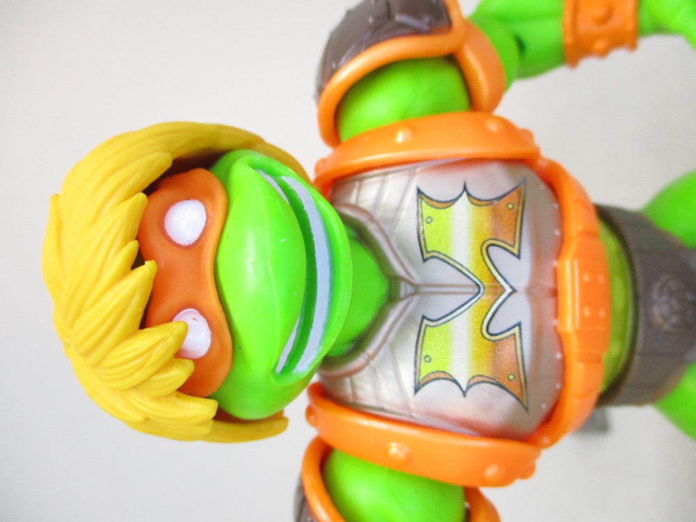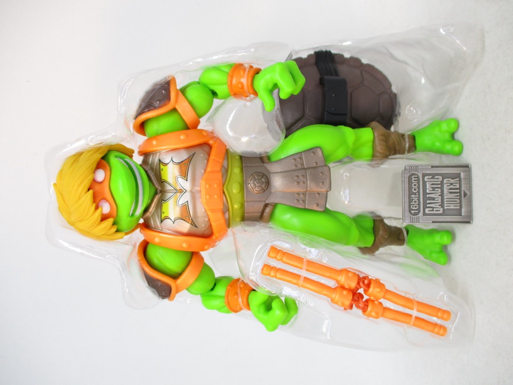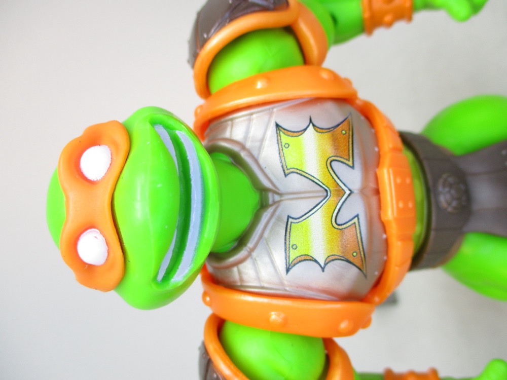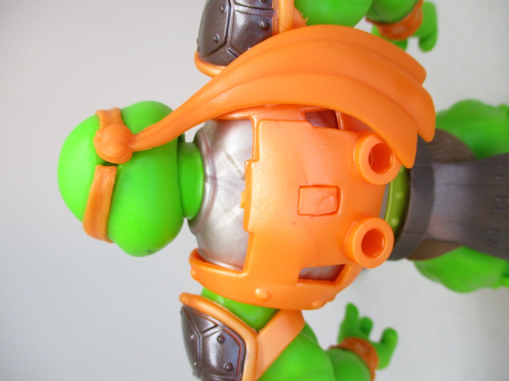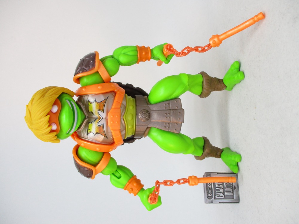 He mask is molded on his head in orange plastic, matching his armor and nunchucks. You can store his weapons on his shell, or he can hold them in his hands. Unlike the figures I had as a kid, this one has a simulated plastic chain. Those are real links that really fall according to gravity! They must have had a good budget, or improved manufacturing techniques, to do something like this on a basic figure. (Or their savings on reusing tooling are huge.)
