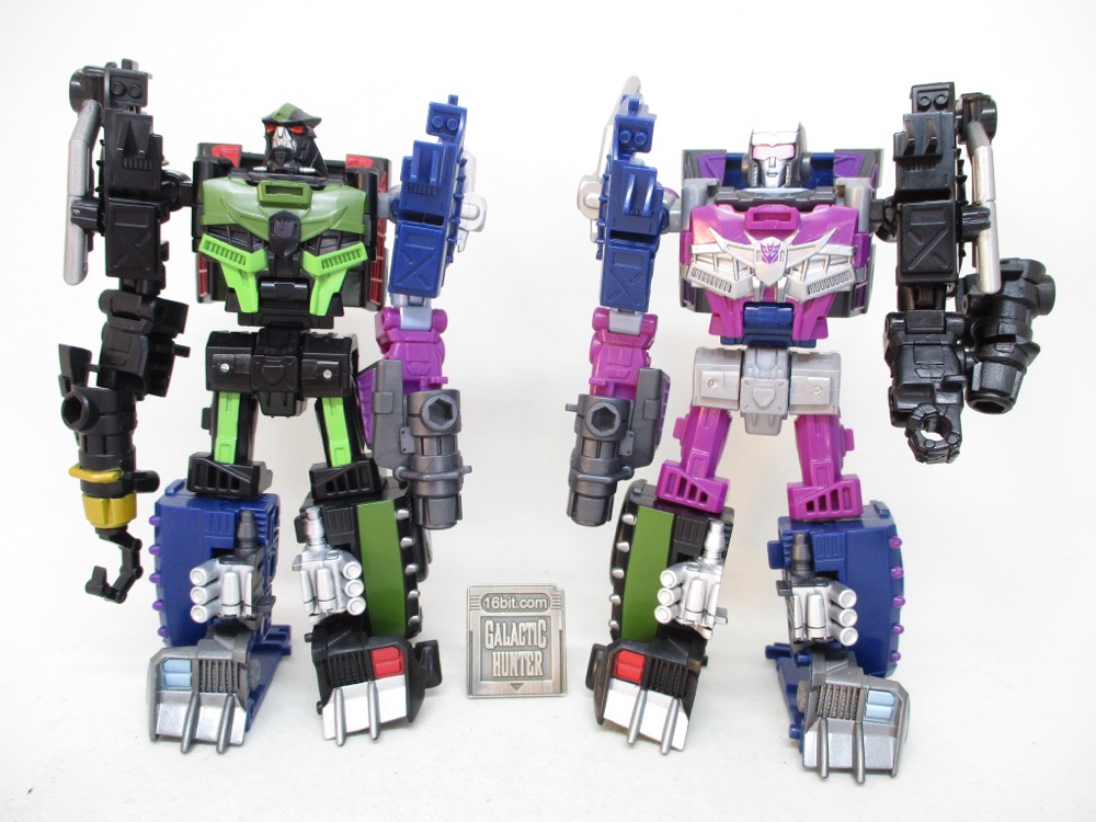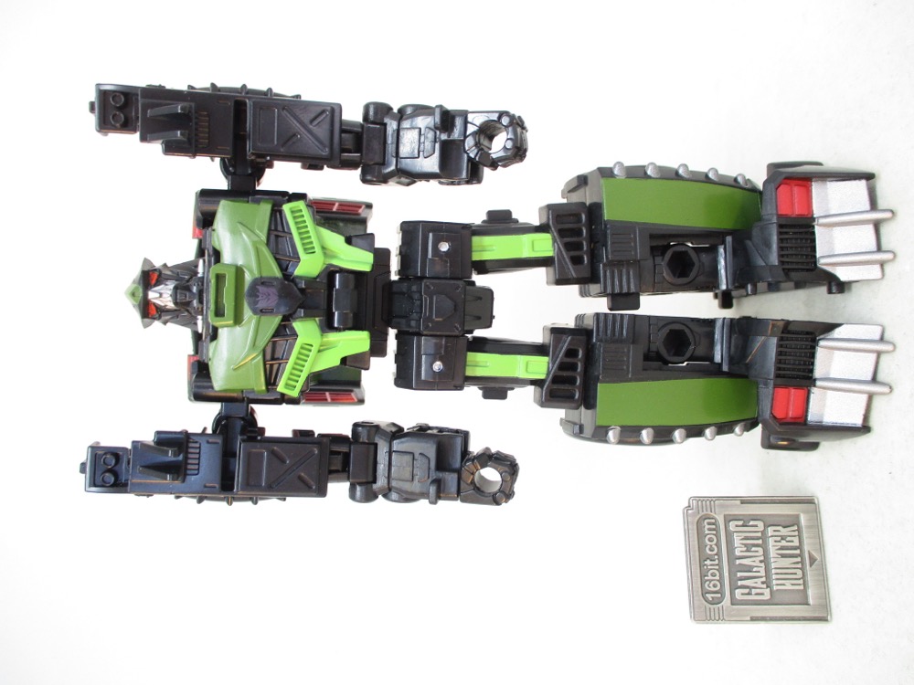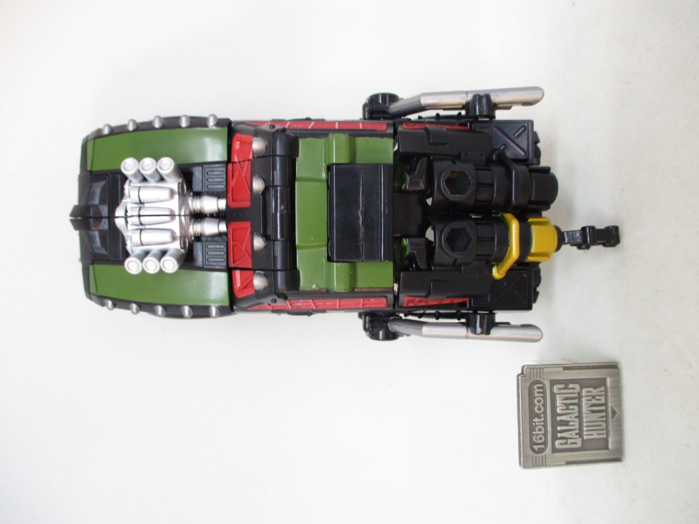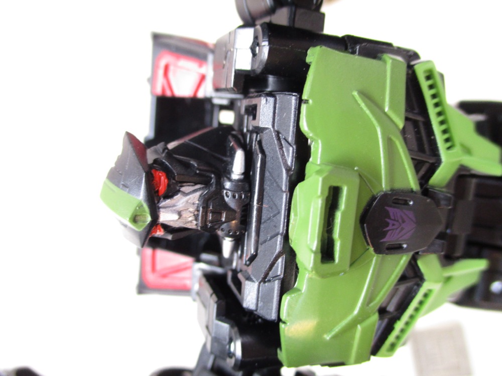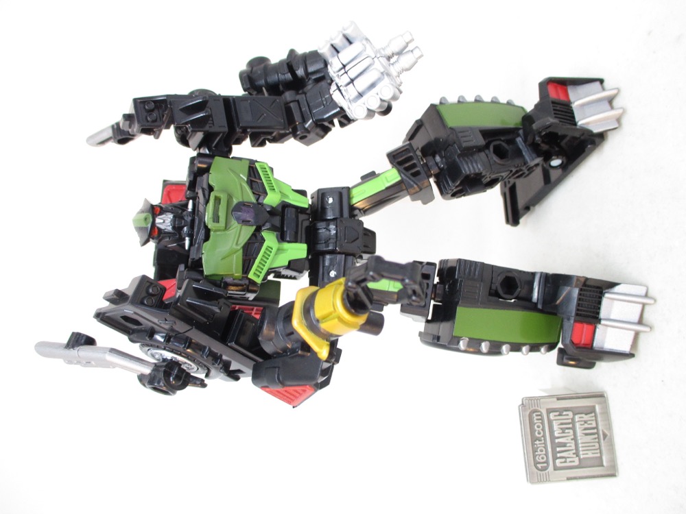 Thanks to the gimmicks, articulation is somewhat limited. The shoulders don't have a full range of movement, but you do get excellent leg movement plus rocker ankles. He can hold his blasters nicely, and there are plenty of 5mm ports to slap his stuff. The deco is sensible, better than expected with painted silver spikes and two shares of green on his person. I think they got almost everything right, as the colors give him a lot of personality. I assume because they were inspired by the aforementioned Revenge toy, but he has a Decepticon logo on his chest and not a Star Seeker/Star Raider one. It would be nice if he was marked as a part of the team, or not marked at all given his origins as a gun-for-hire. Maybe the character found a Decepticon chest plate at some point and said "eh, good enough?"